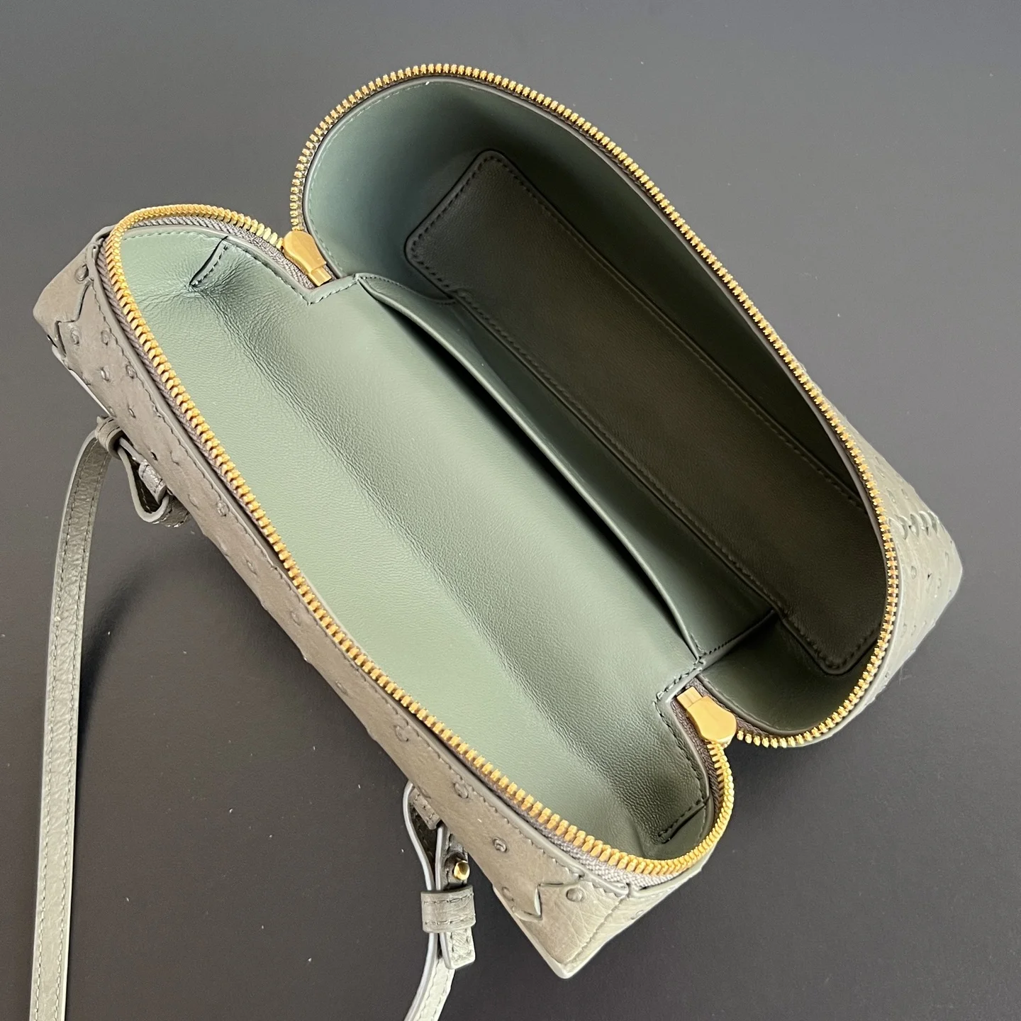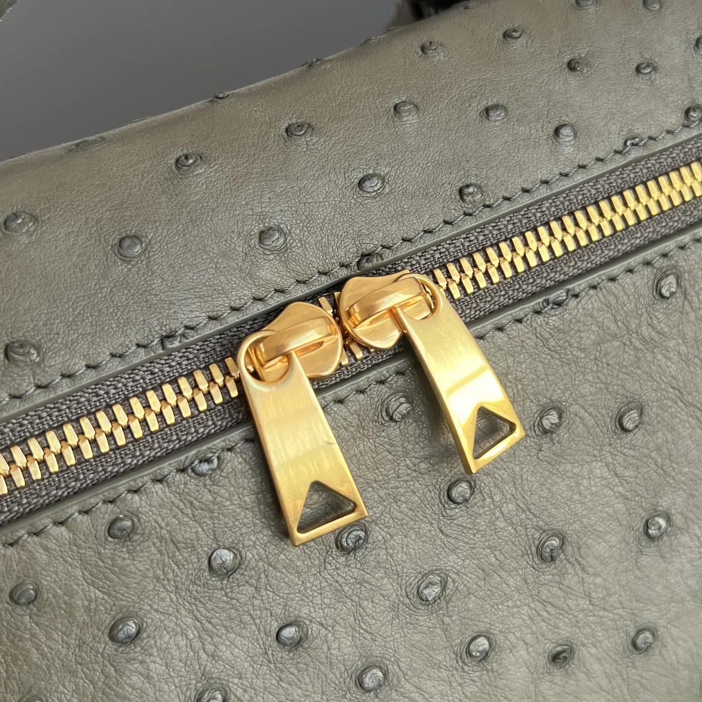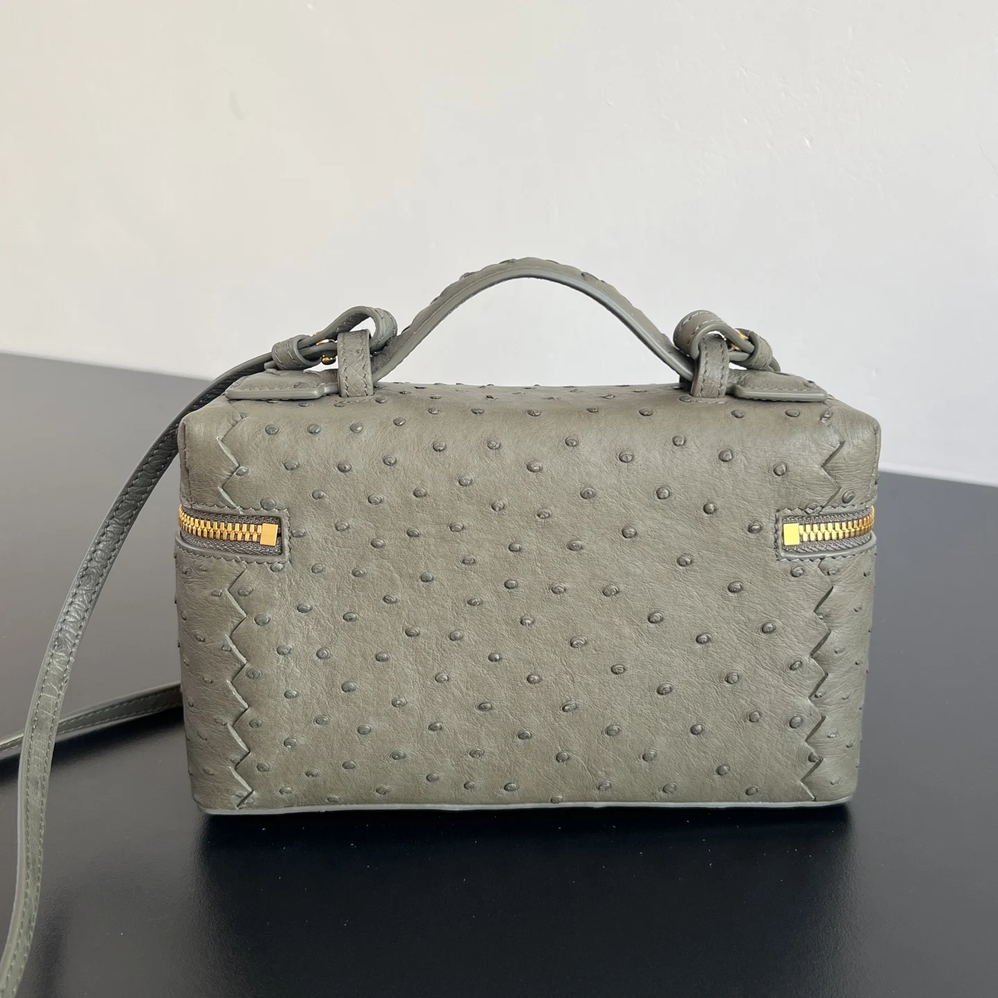 BV New Arrival Ostrich Leather Cosmetic Bag 817785. These ostrich leather cosmetic bags come in such gentle colors . They are the understated, luxurious, compact, and lightweight bags loved by wealthy sisters . Crafted from South African Grade A rare ostrich leather, each natural follicle boasts a unique texture, offering a delicate yet subtly granular feel. The serrated design on both sides enhances the overall sophistication and fashion appeal. Carry it by hand for a refined lady look, or sling it across the body for a casual, chic vibe. It looks beautiful no matter how you place it. I m in love already . Size: 22x12.5x5