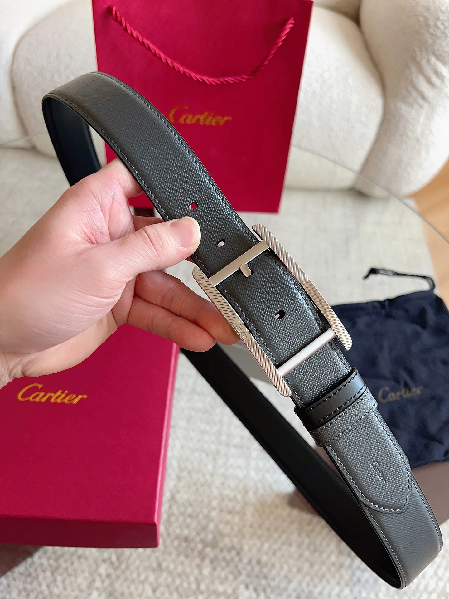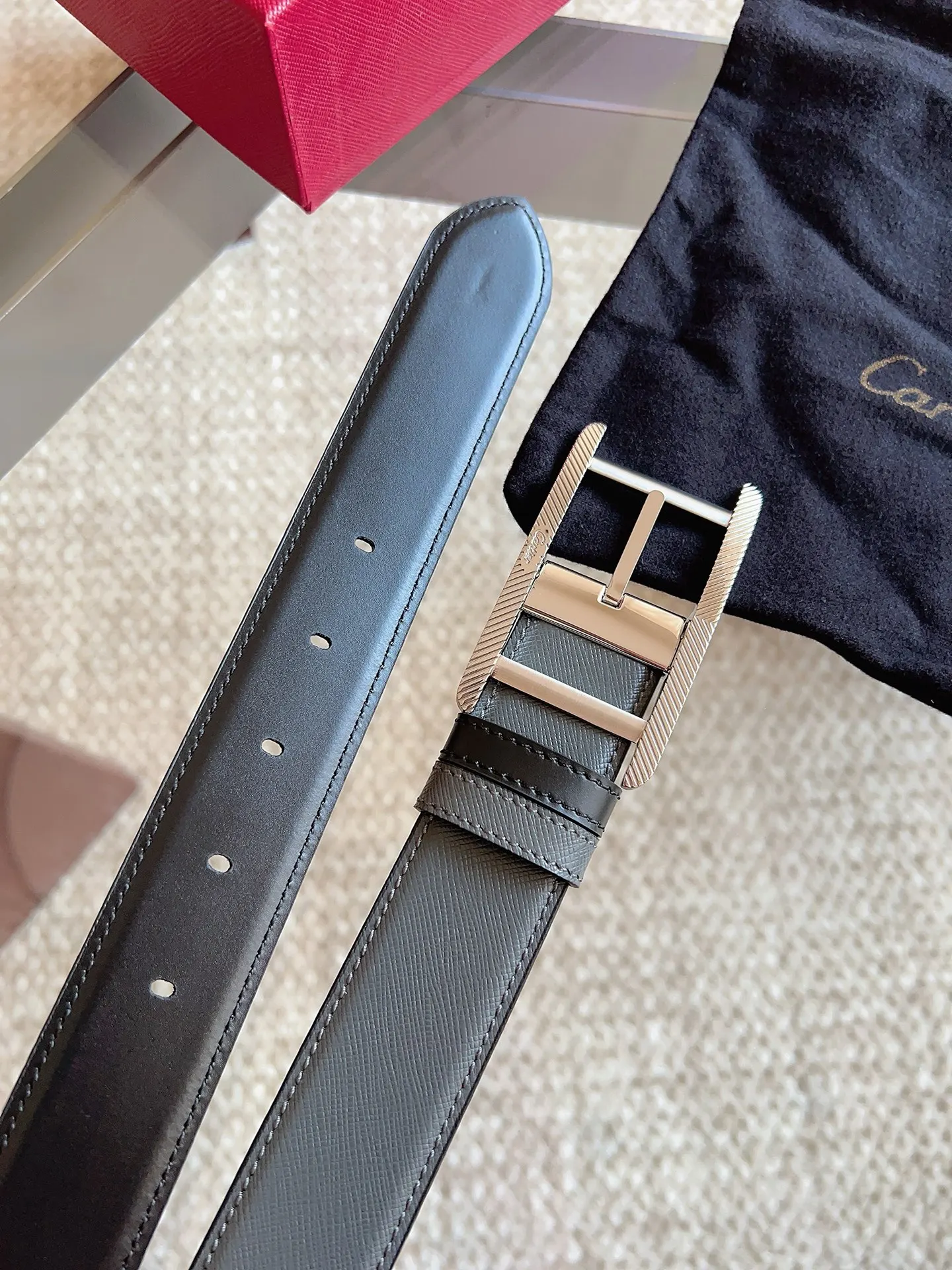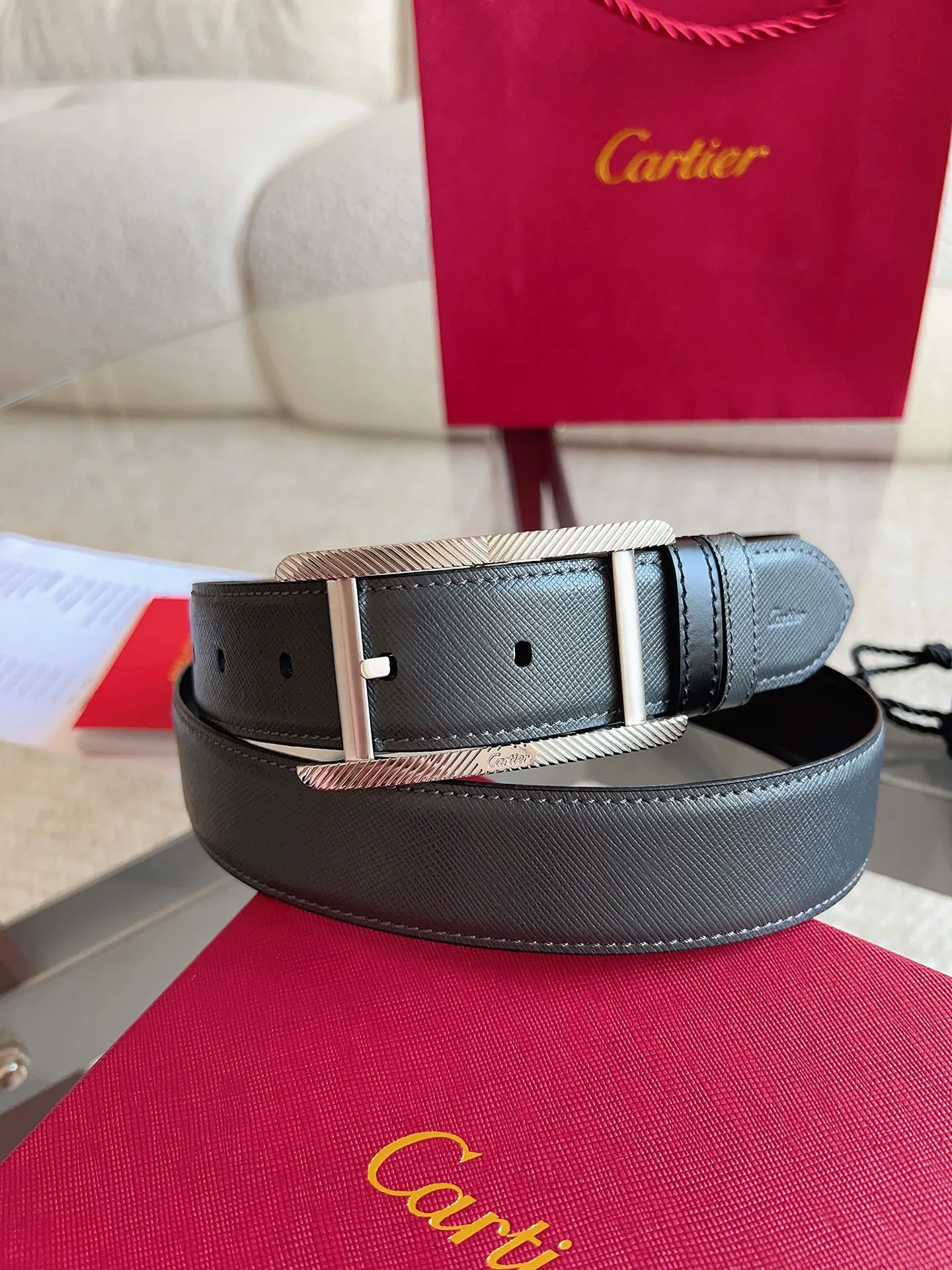 Cartier, new TANK DE CARTIER collection belt, palladium-finish buckle with fluted motif and CARTIER signature. A masterpiece showcasing distinctive aesthetics, blending exquisite craftsmanship with classic design to embody timeless style; unrestrained and boldly independent! The style is easy to match with clothing, suitable for both casual and formal wear. Belt width: 35mm