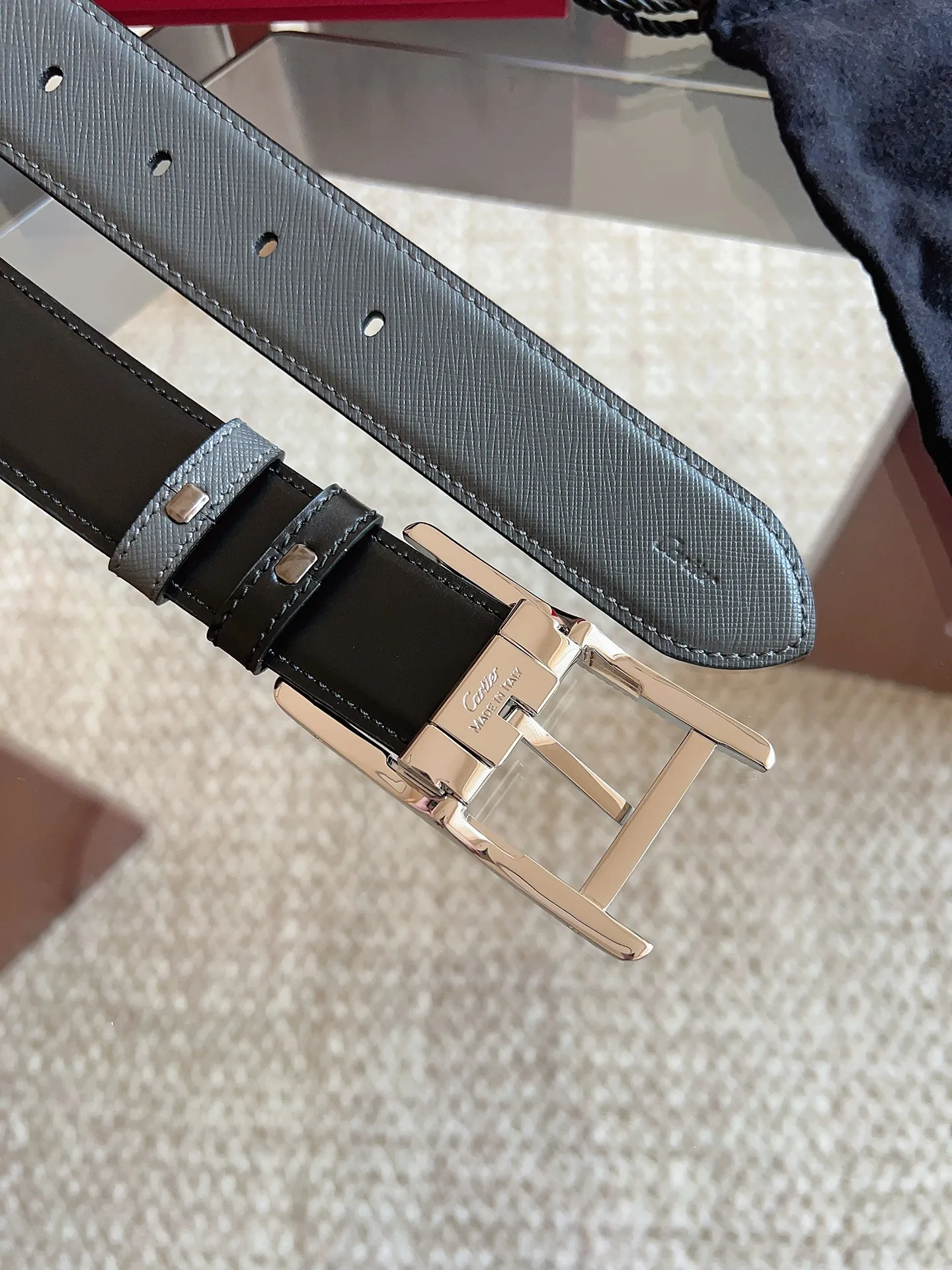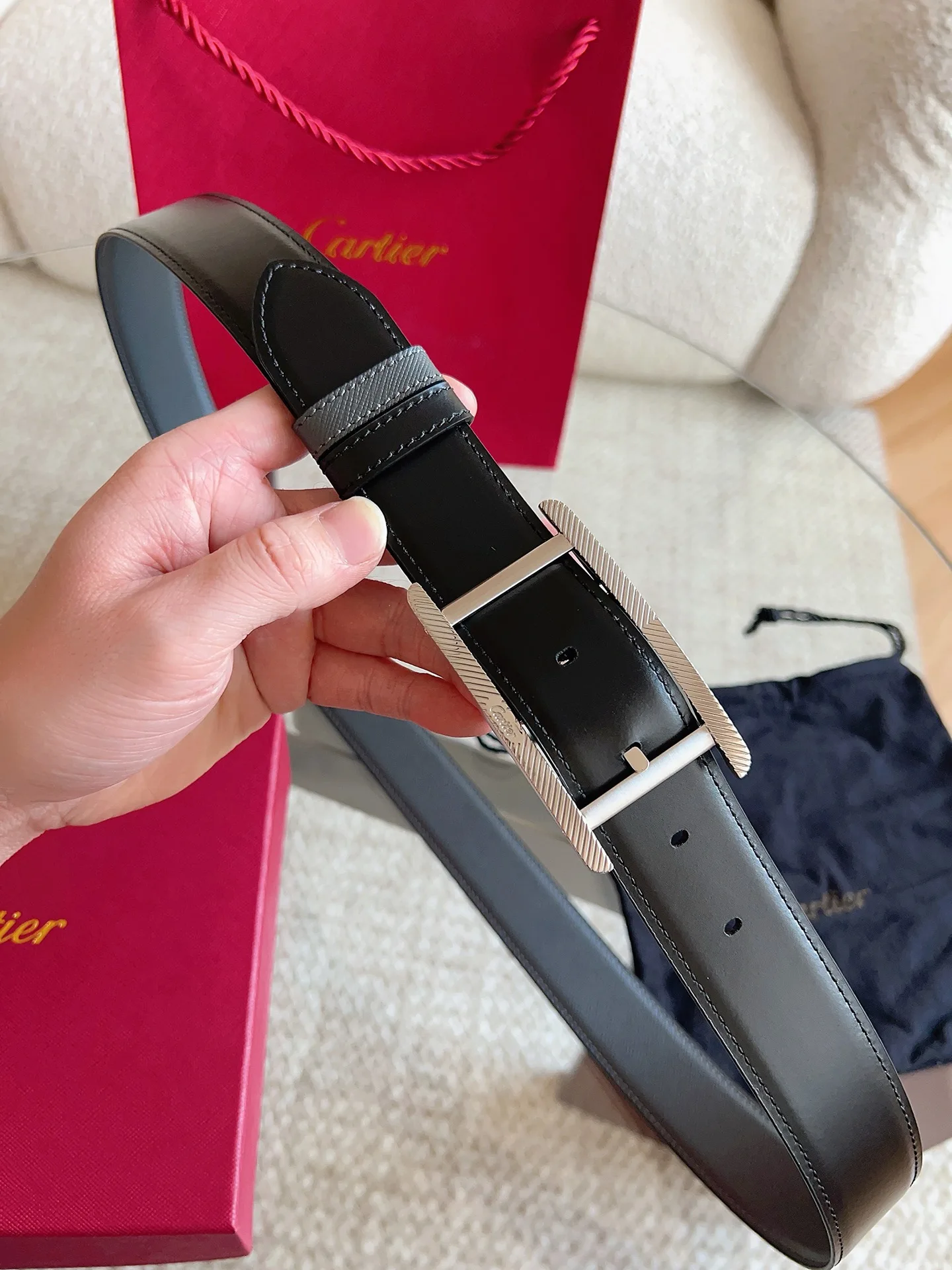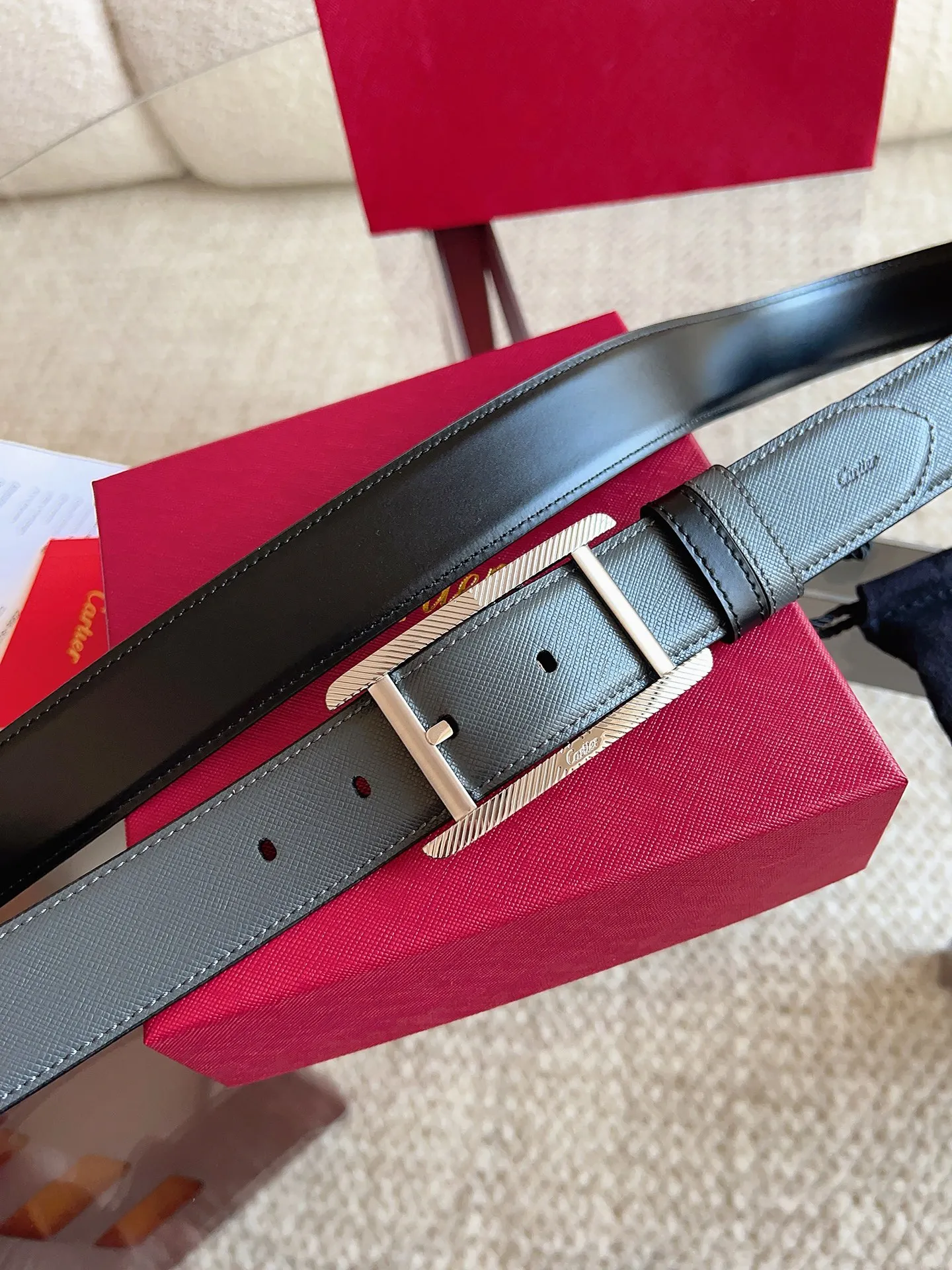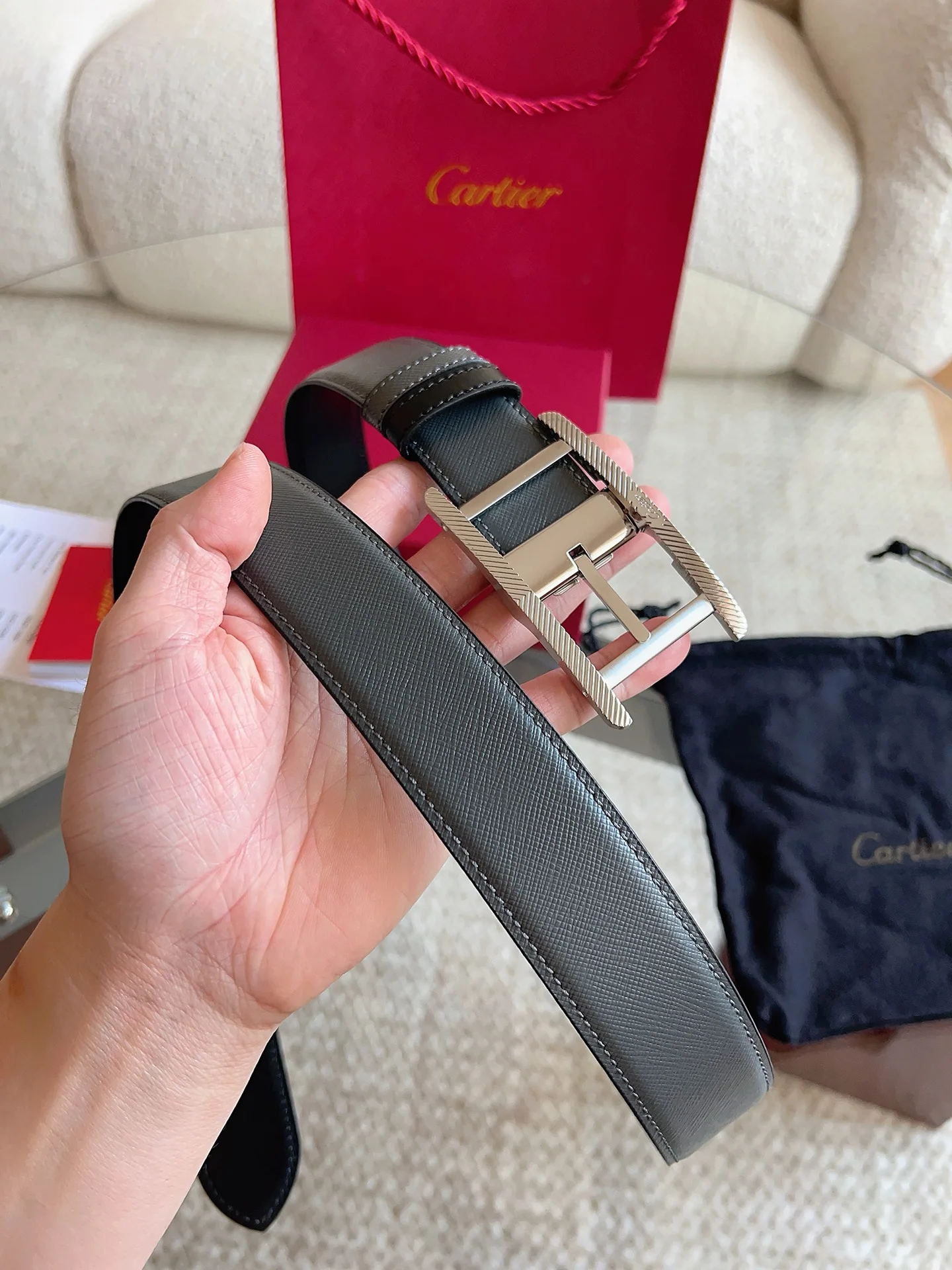 Cartier, new TANK DE CARTIER collection belt, palladium-finish buckle with fluted motif and CARTIER signature. A masterpiece showcasing distinctive aesthetics, blending exquisite craftsmanship with classic design to embody timeless style; unrestrained and boldly independent! The style is easy to match with clothing, suitable for both casual and formal wear. Belt width: 35mm