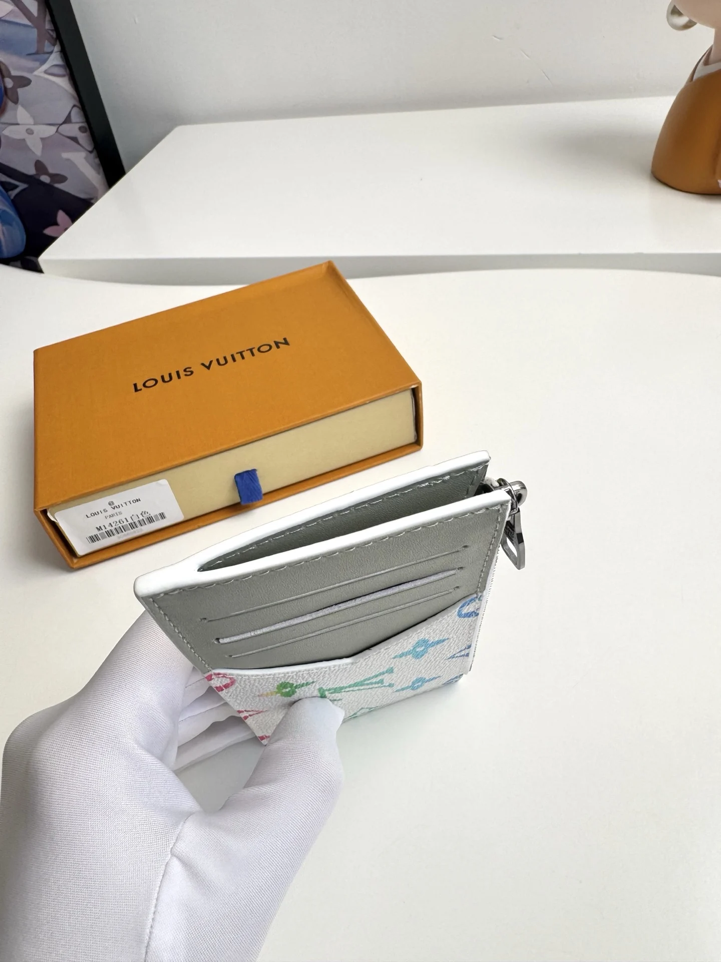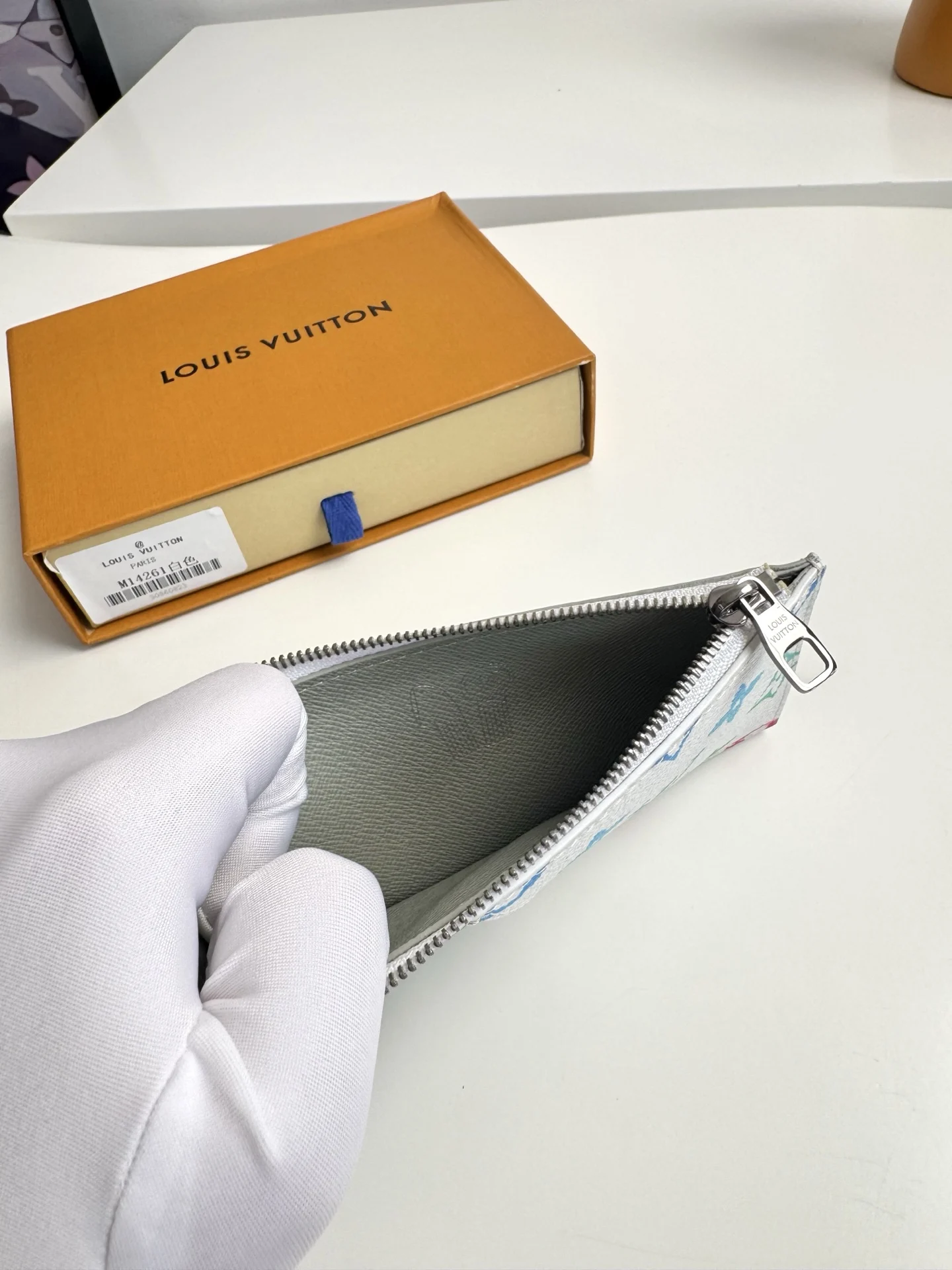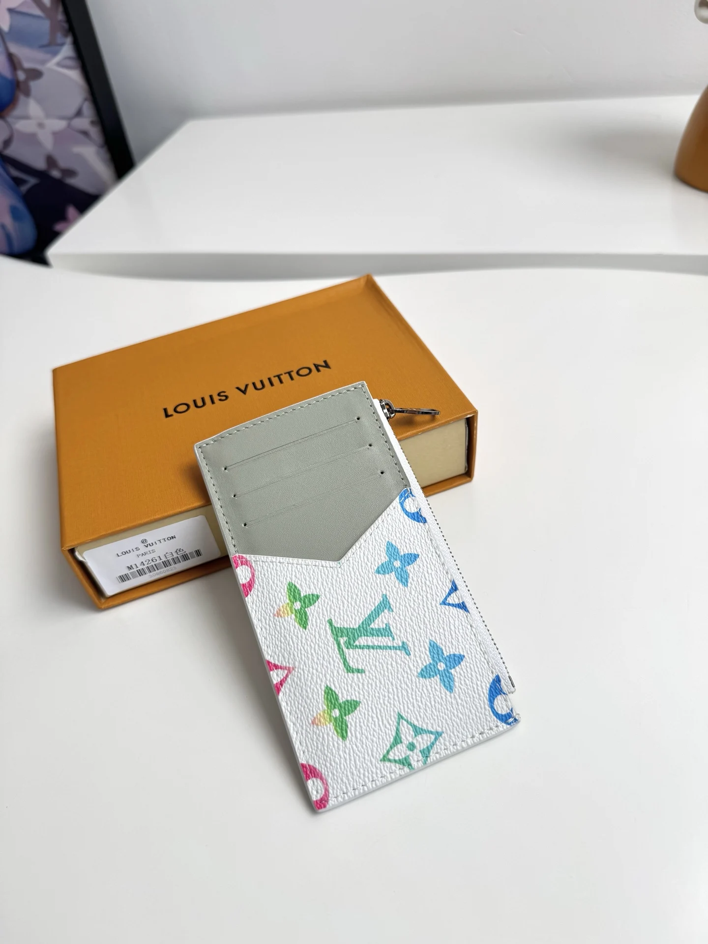 Overseas original M14261 gradient white exclusive real shot! This COIN card holder combines Taiga leather and Monogram canvas with harmonious colors, outlining simple lines. A zipper conceals the coin pocket below, with four card slots and a bill compartment. Dimensions: 14.5×8cm