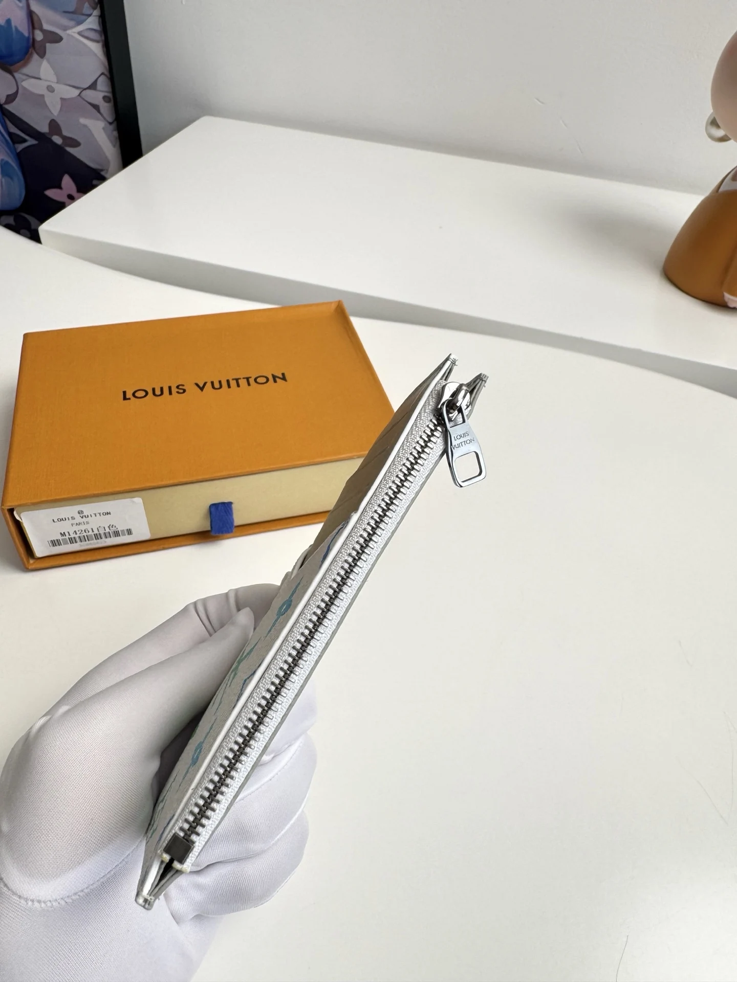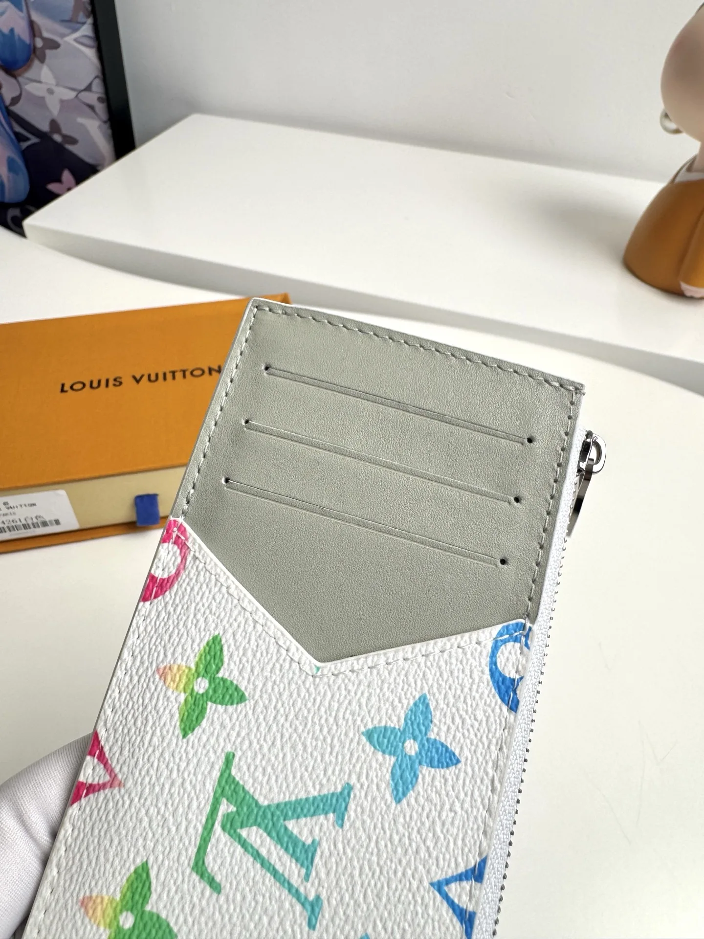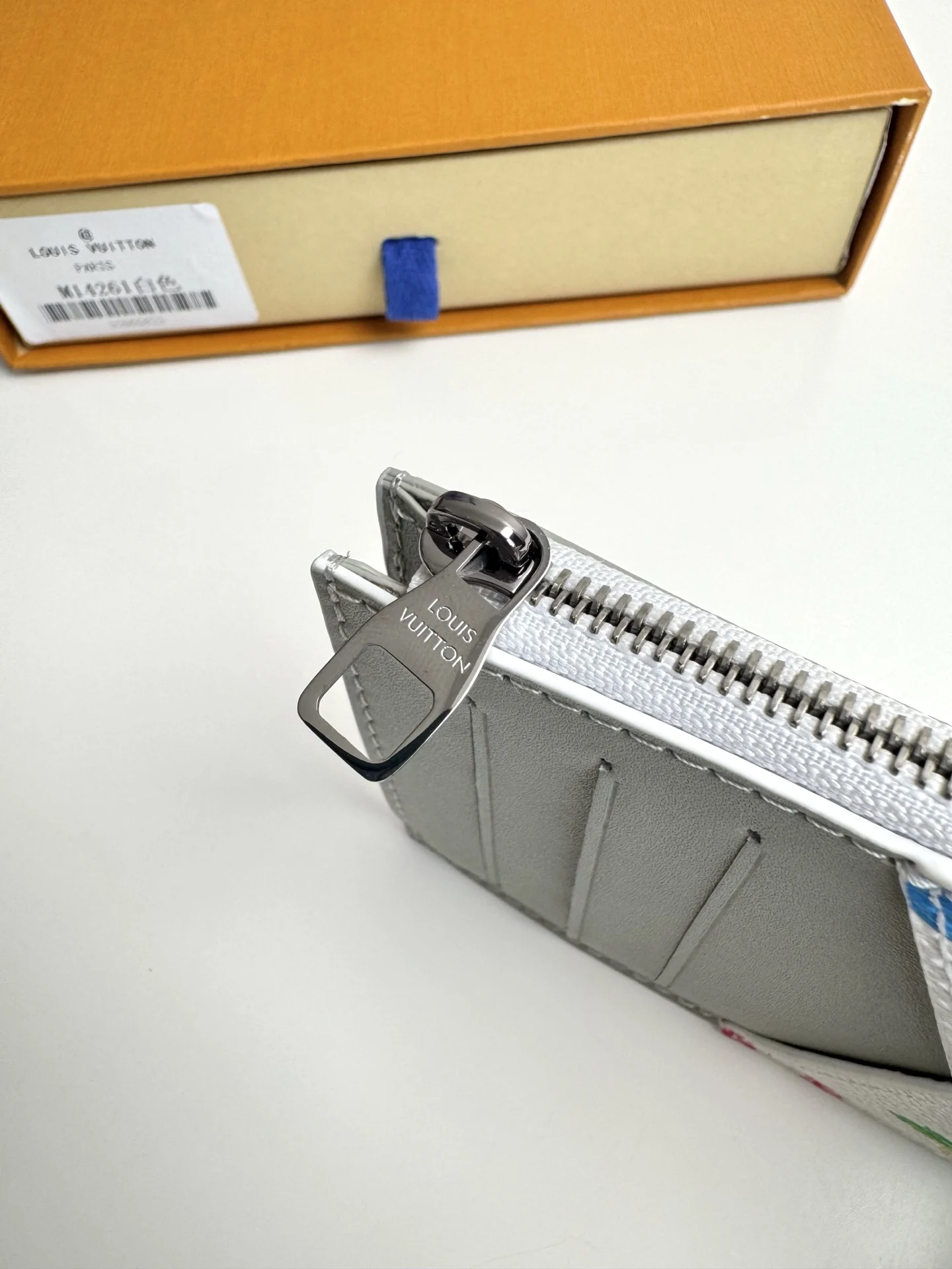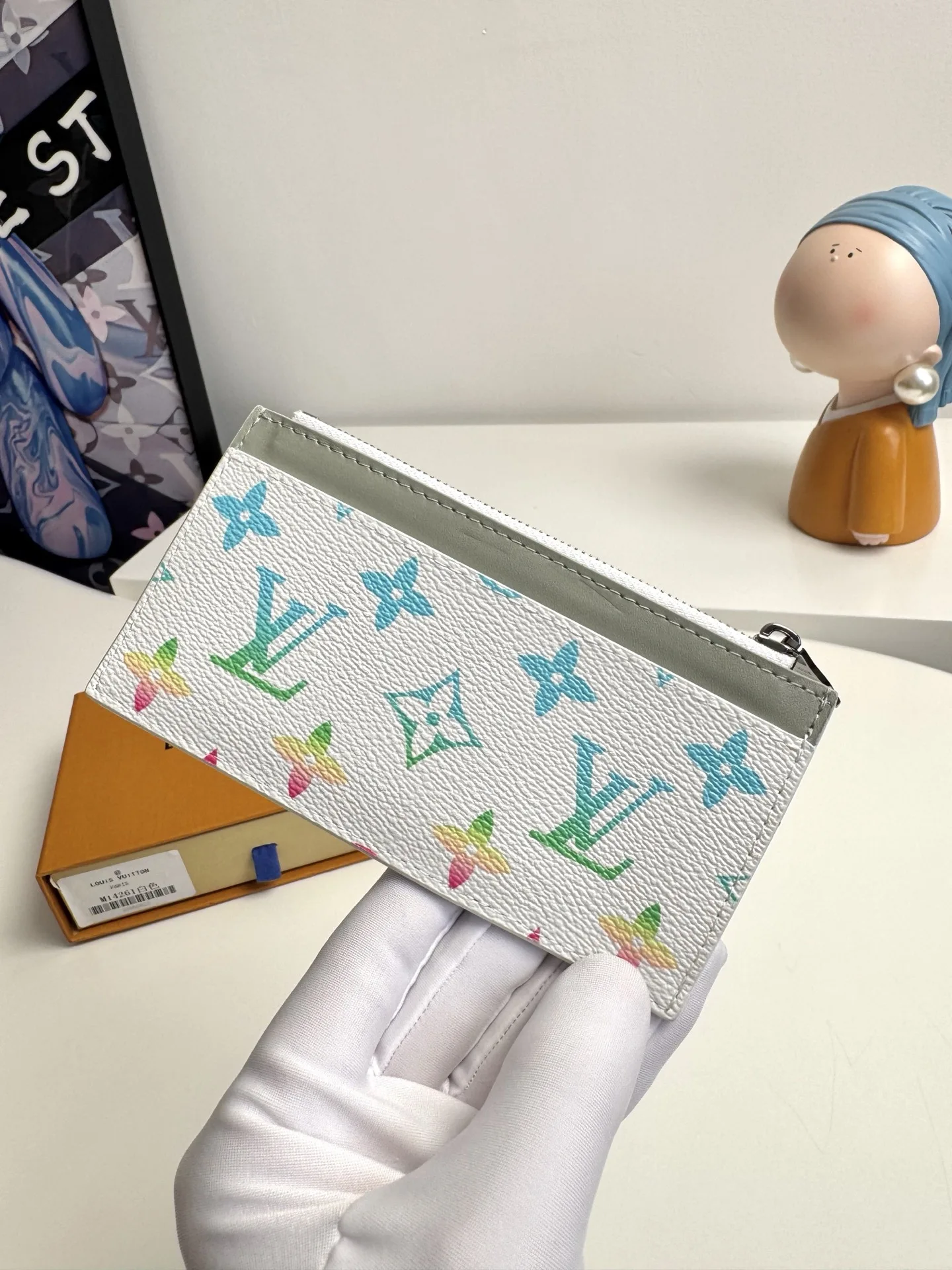 Overseas original M14261 gradient white exclusive real shot! This COIN card holder combines Taiga leather and Monogram canvas with harmonious colors, outlining simple lines. A zipper conceals the coin pocket below, with four card slots and a bill compartment. Dimensions: 14.5×8cm