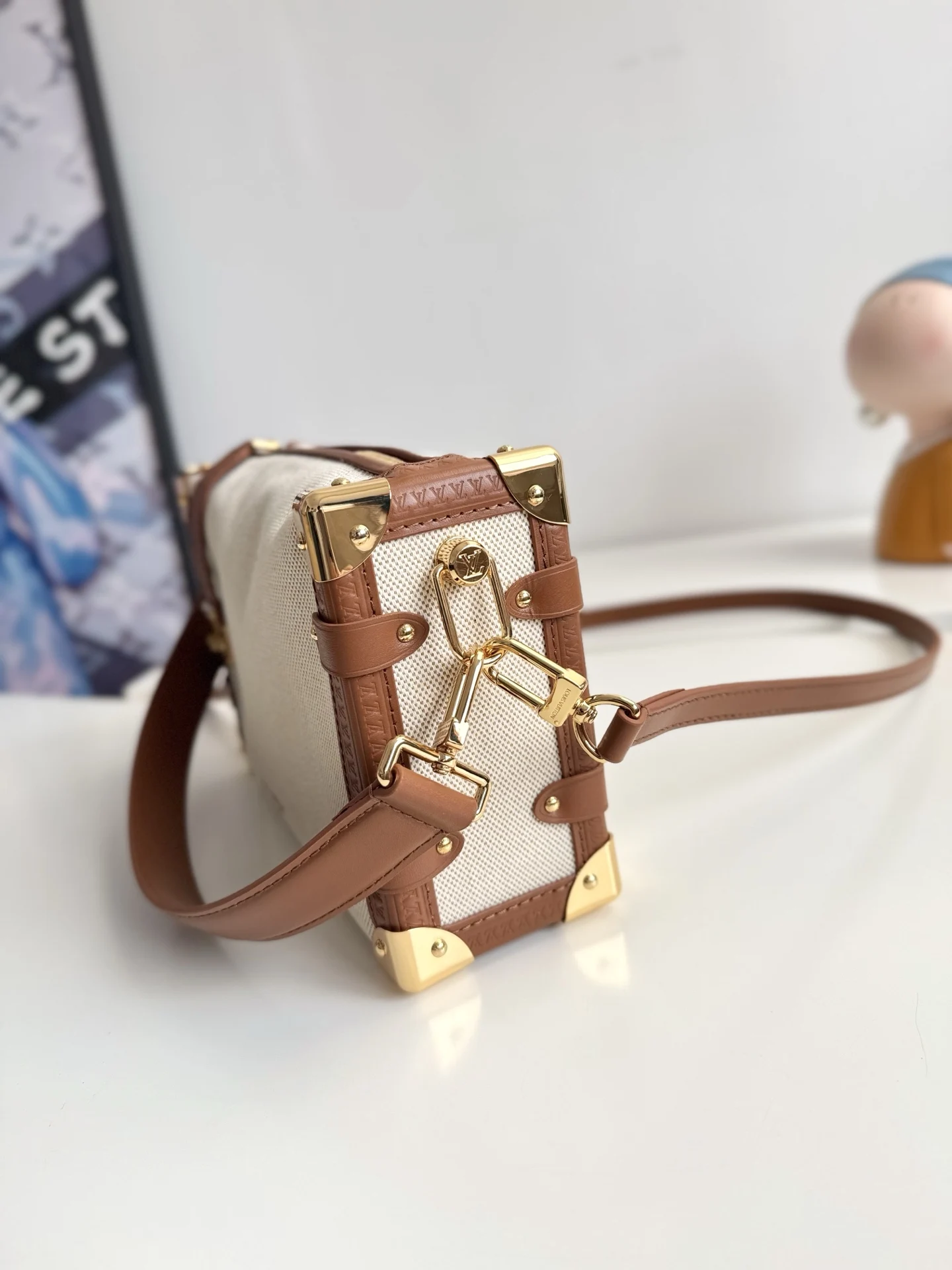 Exclusive original overseas order M14411, real shots! This medium Side Trunk handbag from the Natural Canvas collection features cotton canvas with contrasting leather trim, iconic S-lock closure, and trunk-inspired corners. A detachable shoulder strap offers shoulder and cross-body carry options for lightweight portability of everyday items. Dimensions: 23.5 x 16 x 8.5cm