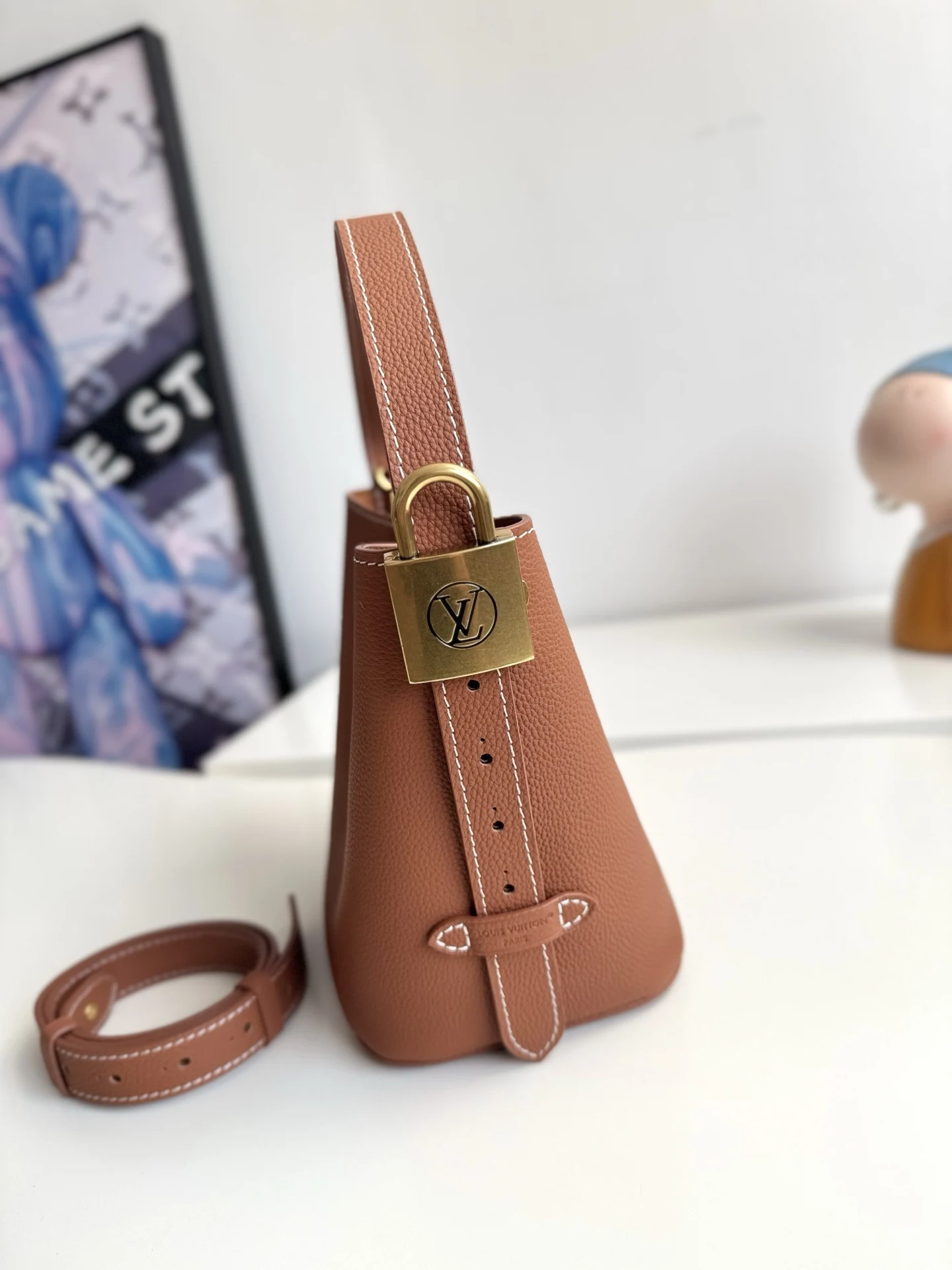 Original overseas order M14416, exclusive real shots! This All In BB handbag is from the Low Key collection, crafted from grained cowhide leather into a compact bucket bag shape, suitable for day-to-night occasions with multiple carrying options. The aged metal hardware conveys a vintage feel, while the LV padlock and detachable Monogram pocket showcase the brand s style. Dimensions: 18×16×12cm