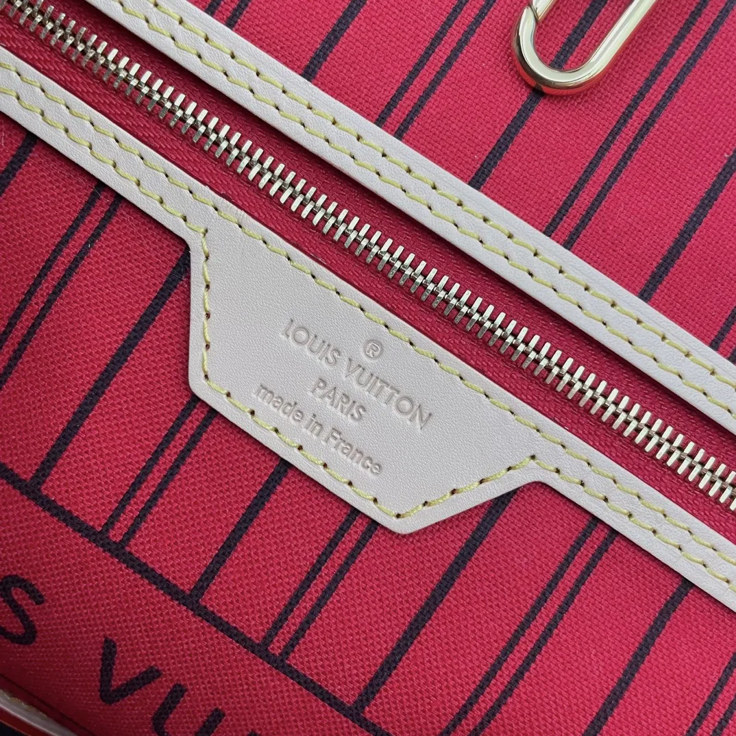Overseas original M41177 all-steel version exclusive real shots! This Neverfull Medium Tote Bag combines classic design with iconic details. Made from fresh Damier Azur canvas, it features a colorful textile lining and cowhide leather trim, offering spaciousness without being bulky. Cinch the sides for a trendy look, or expand them for a casual feel. It has slender handles for shoulder or elbow carry. The removable pouch can be used as a clutch or pocket. Dimensions: 31 × 28 × 14cm