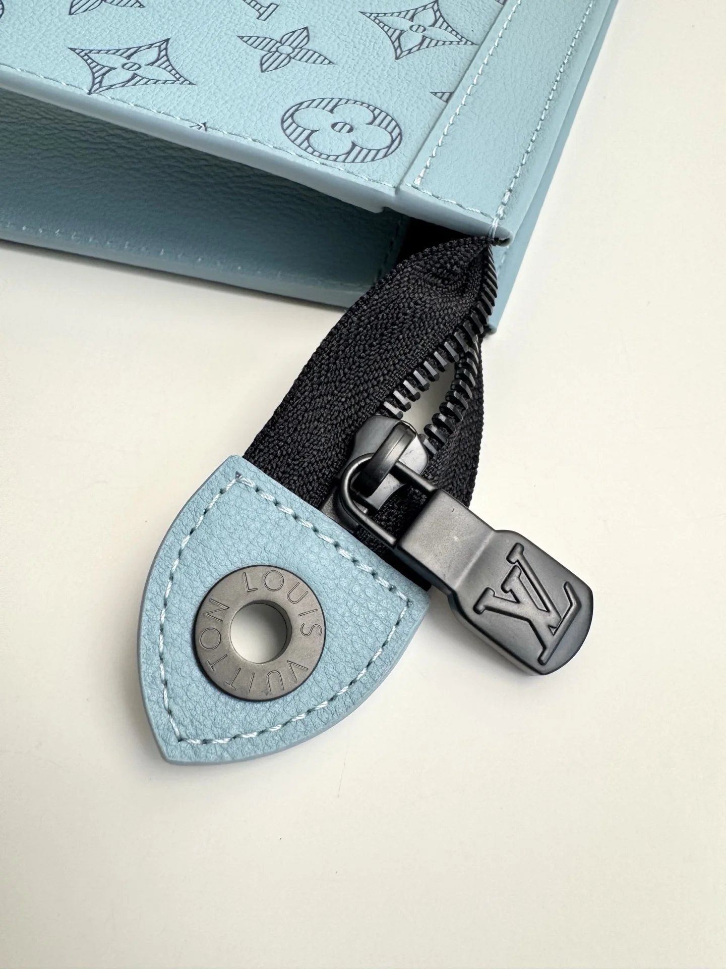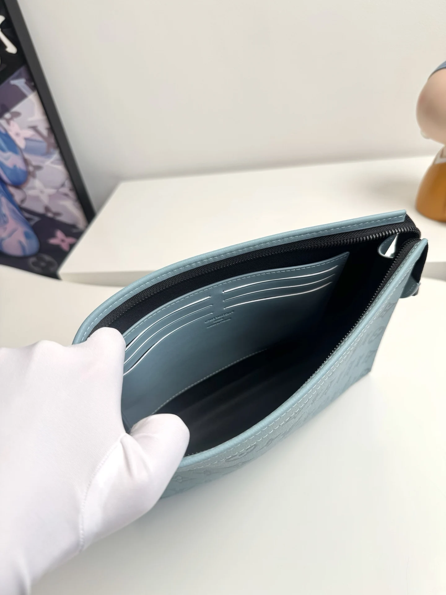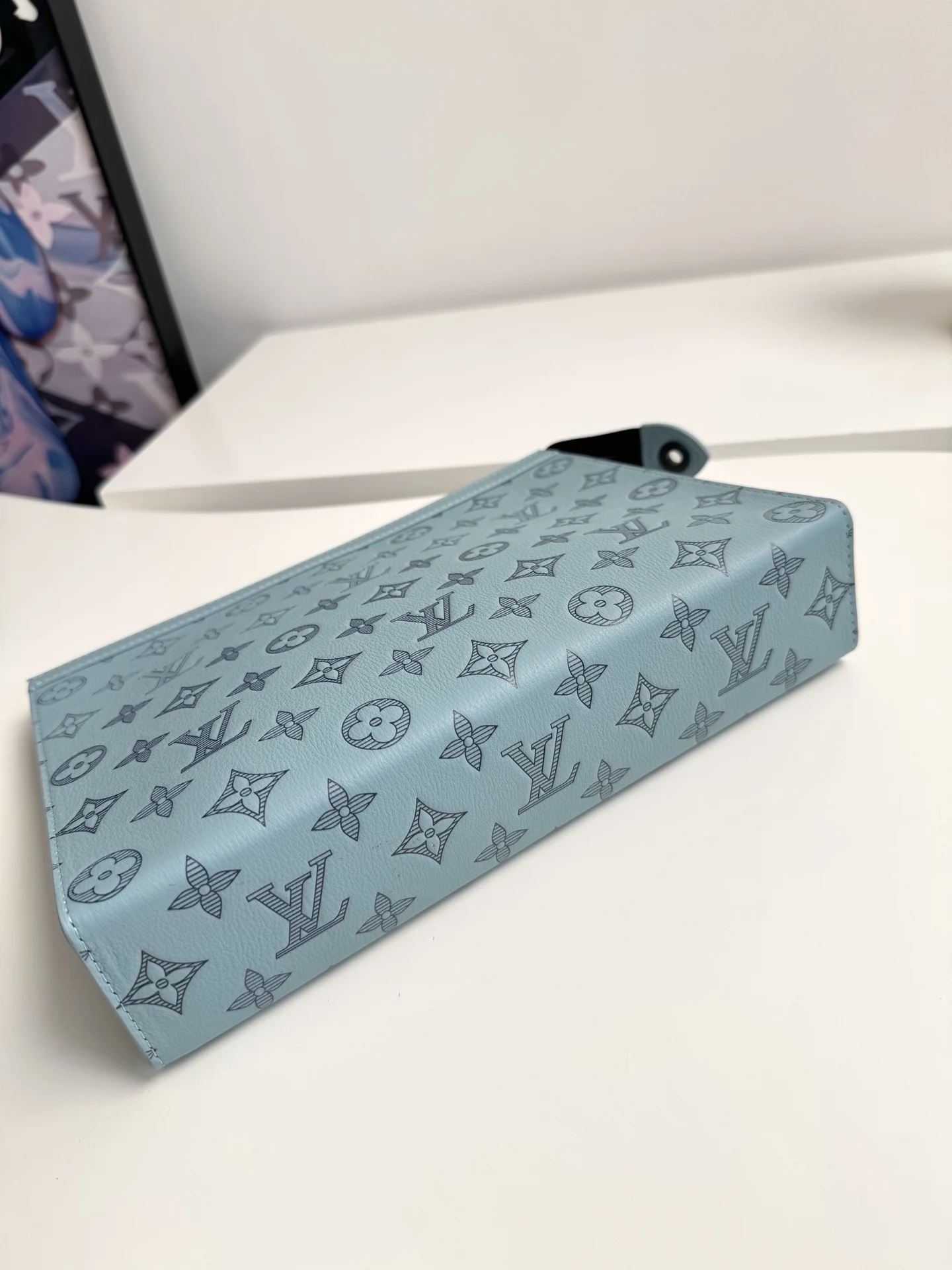 Overseas original M61692 ice blue exclusive real shot! This compact and stylish Pochette Voyage medium handbag is made of Taiga荔枝纹牛皮 leather and is versatile. It can be used as a travel bag in a bag or carried in hand to show a fashionable style. The spacious interior and gusset design make it easy to access personal essentials. Size: 26×20×5cm