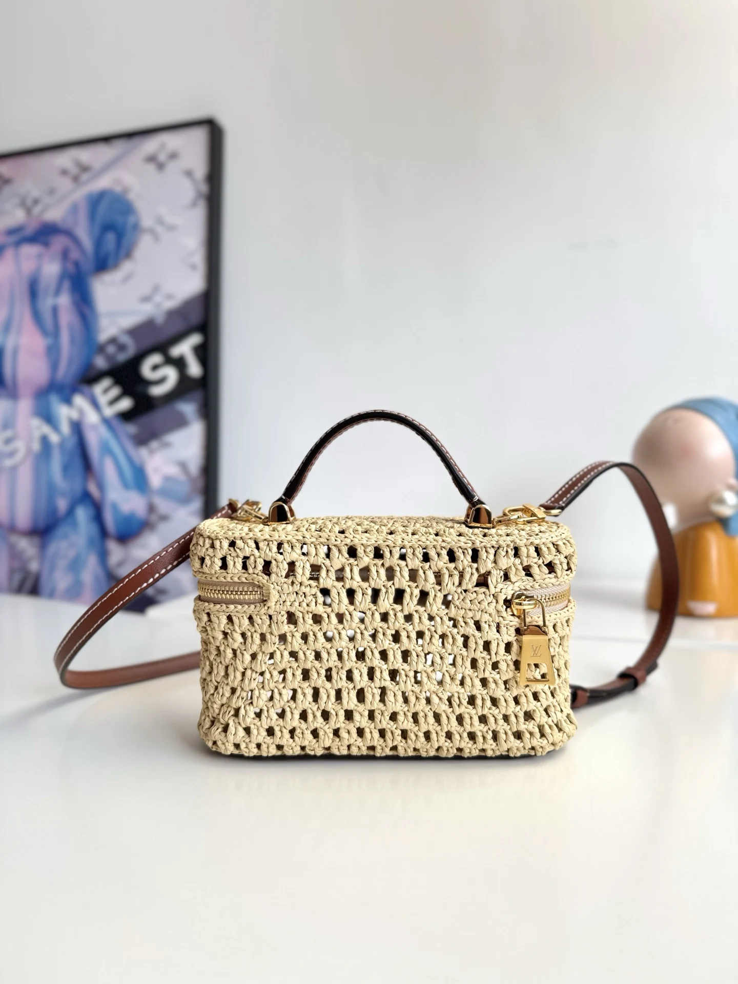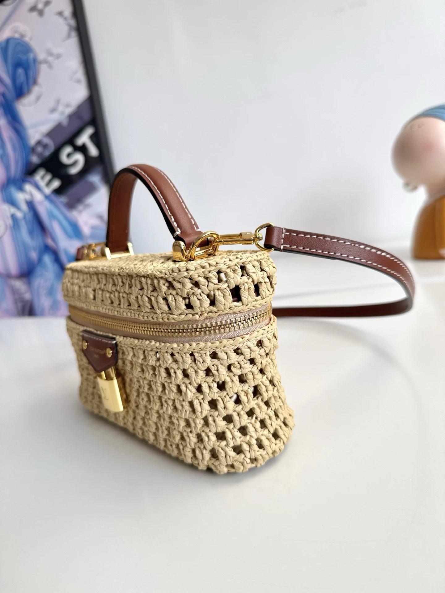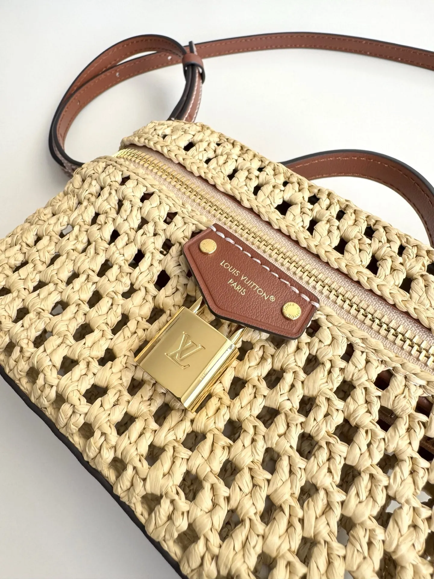 Overseas original M14303 exclusive real shot! The Vanity Chain Pouch bag joins the Cruise Collection, easily brightening up outdoor occasions or relaxing vacations. The bag body is made of raffia with elegant colors and contrasting cowhide trim, and the LV-engraved padlock and other metal parts add more exquisite details. Size: 19×11.5×6.5cm