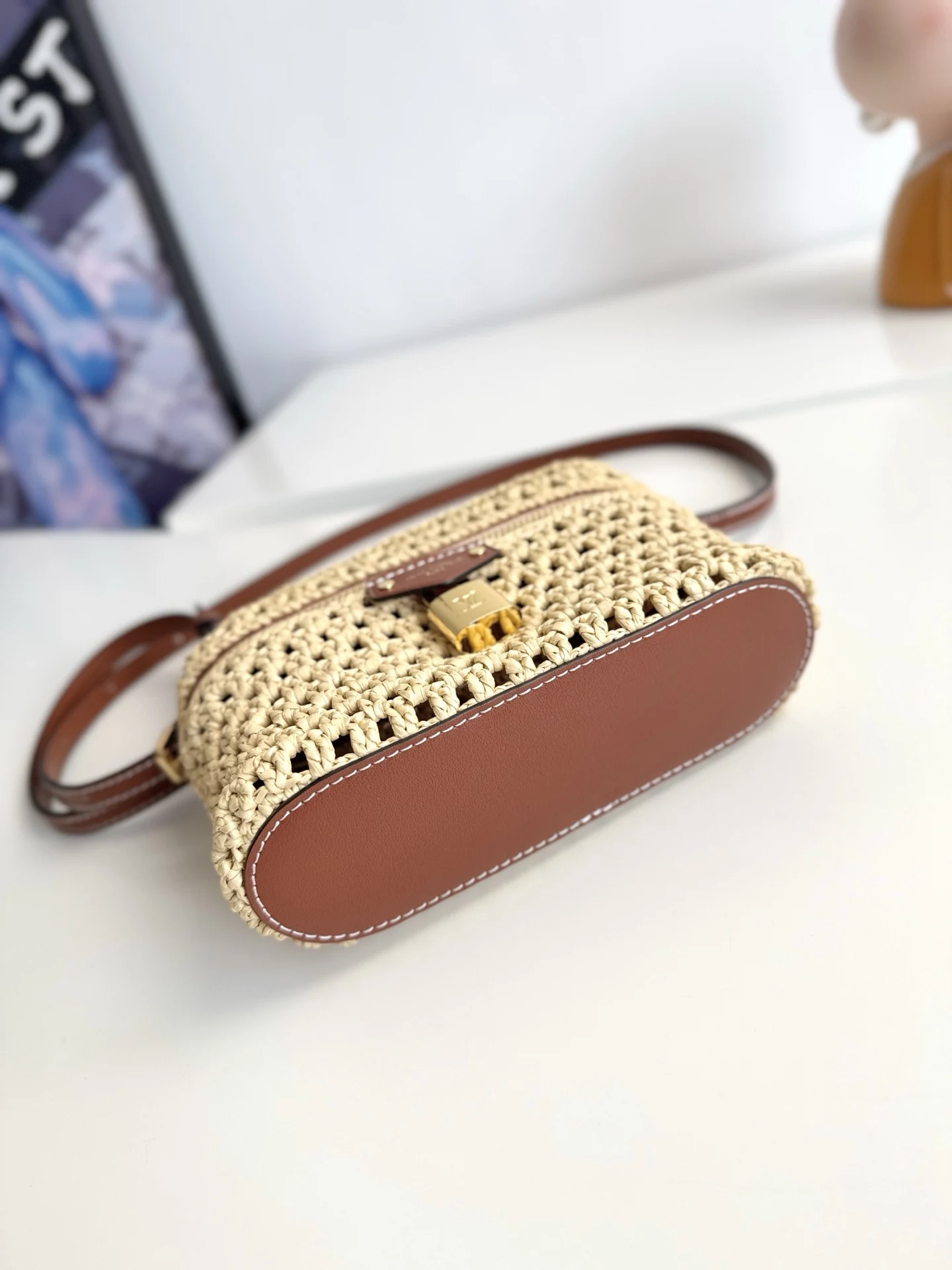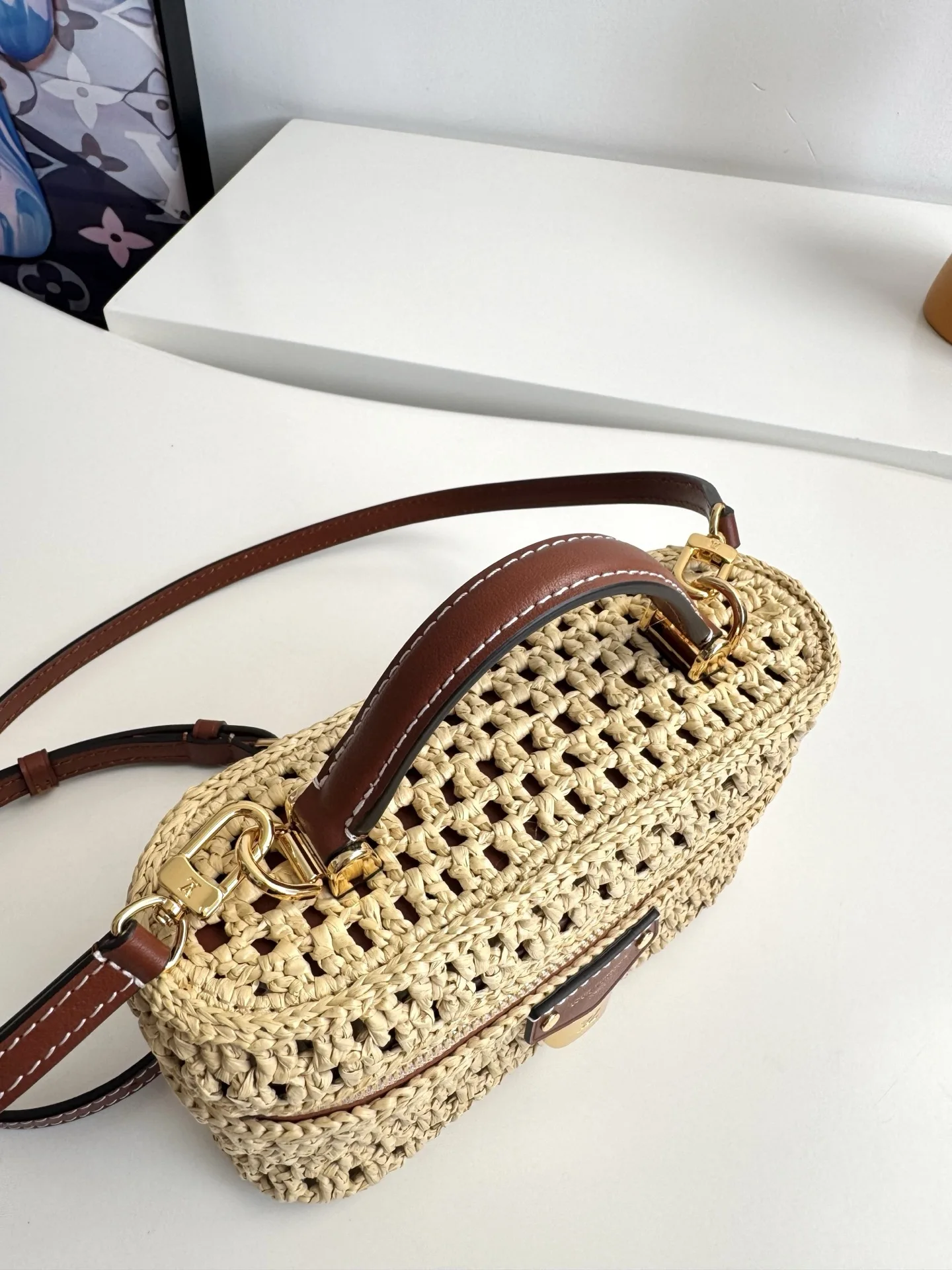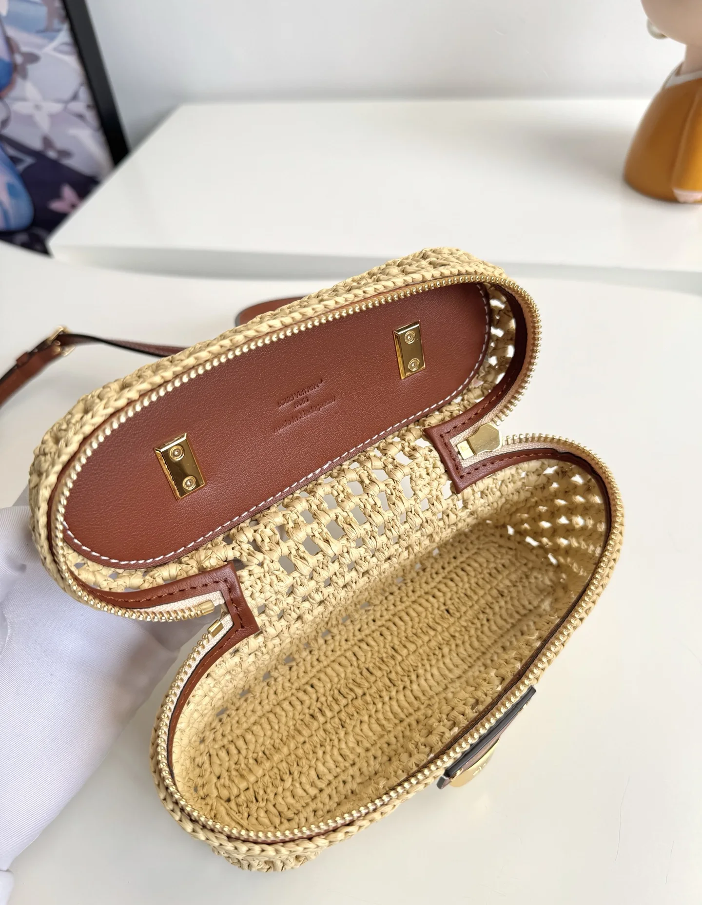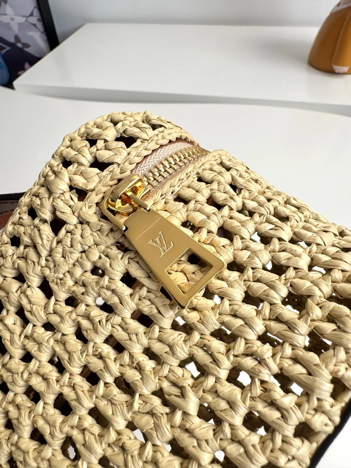 Overseas original M14303 exclusive real shot! The Vanity Chain Pouch bag joins the Cruise Collection, easily brightening up outdoor occasions or relaxing vacations. The bag body is made of raffia with elegant colors and contrasting cowhide trim, and the LV-engraved padlock and other metal parts add more exquisite details. Size: 19×11.5×6.5cm