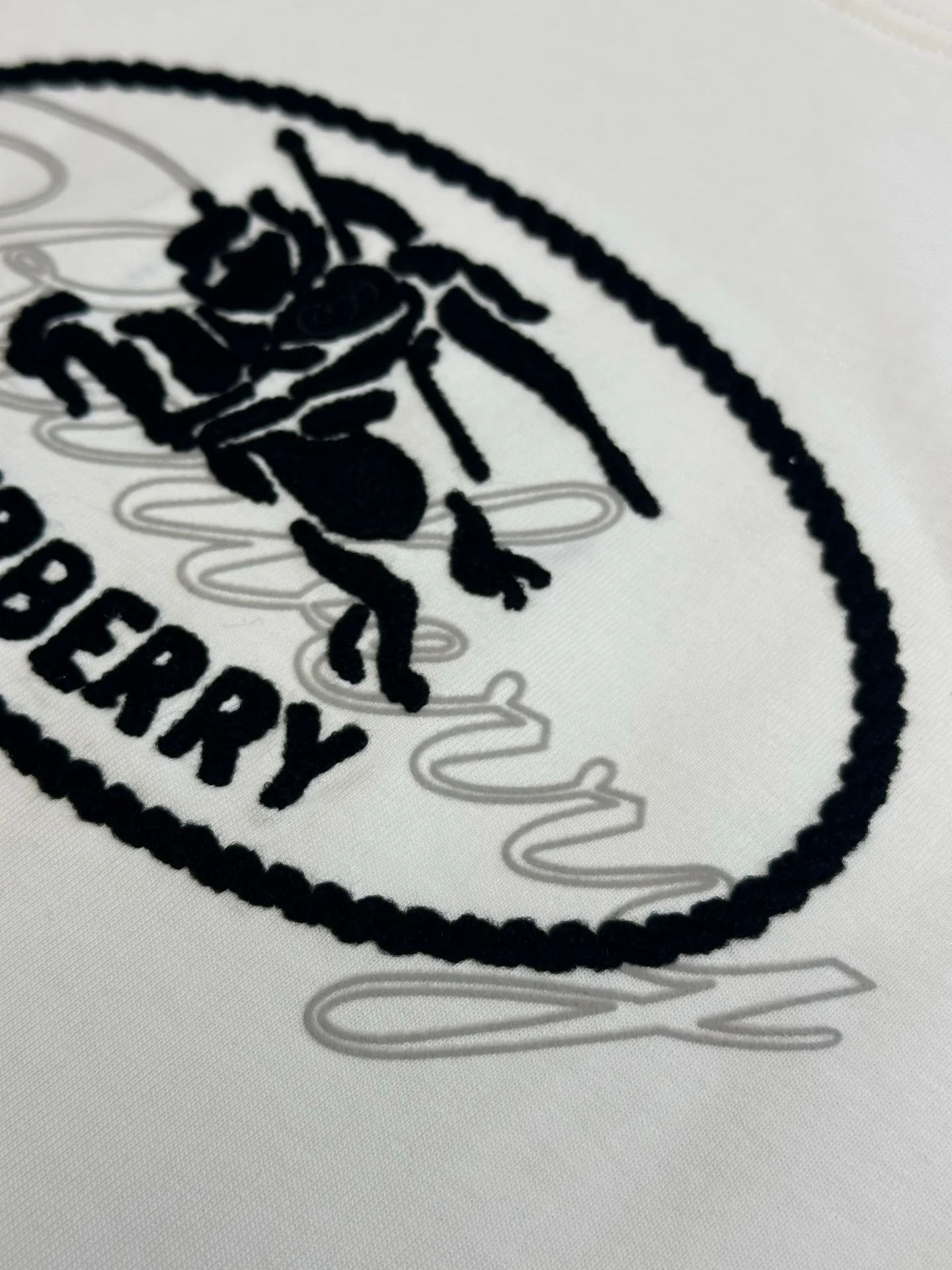 Chain stitch embroidery layered knight crest decoration: This part is a decorative border pattern surrounding the flocked logo. Chenille embroidery creates three-dimensional, full, and soft stitches similar to towel loops. It simulates the three-dimensional texture of traditional hand-sewn stitches or embroidery, adding a heavy, handcrafted feel and vintage decorative details to the entire crest pattern, creating a textural contrast with the flocked logo.