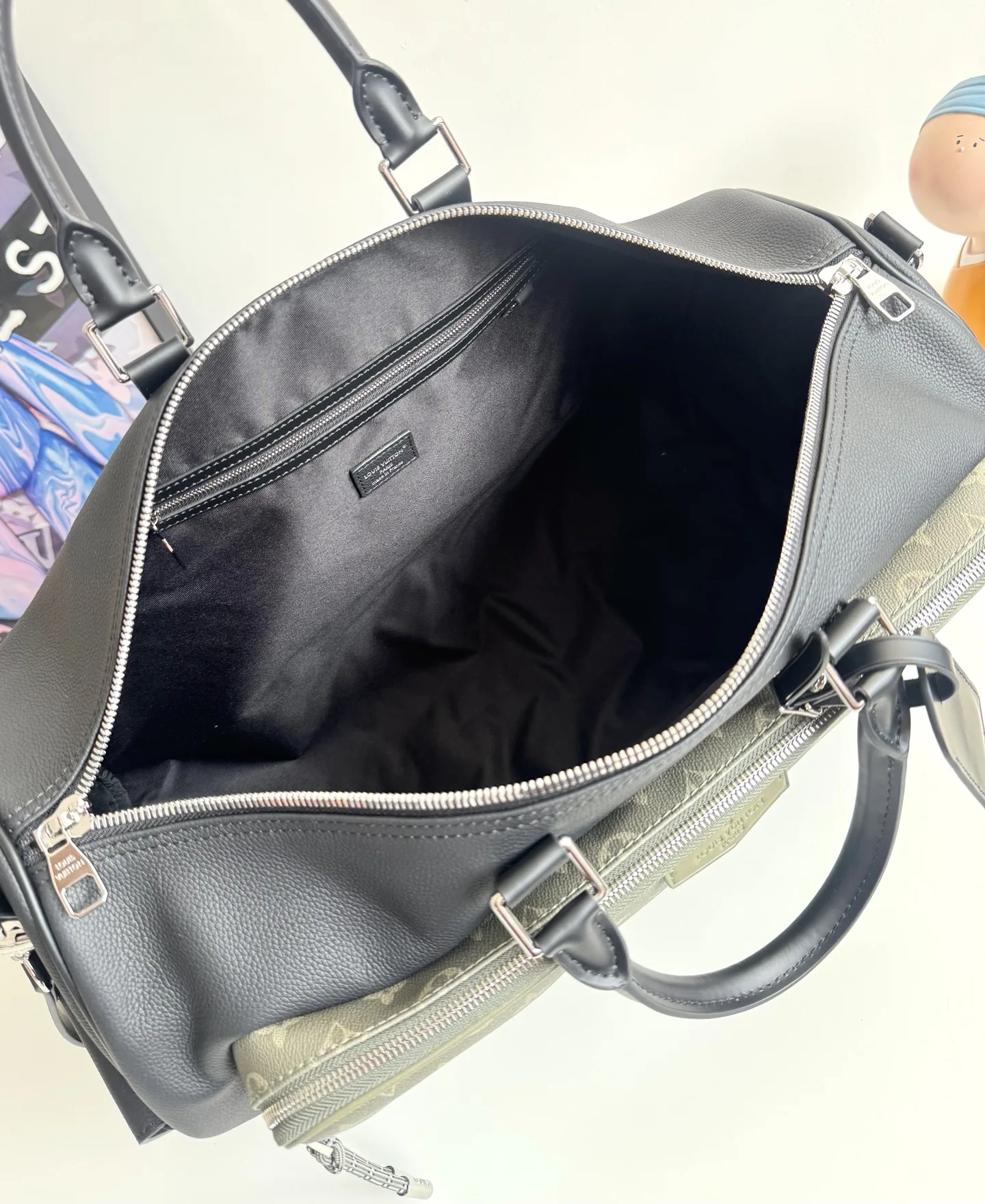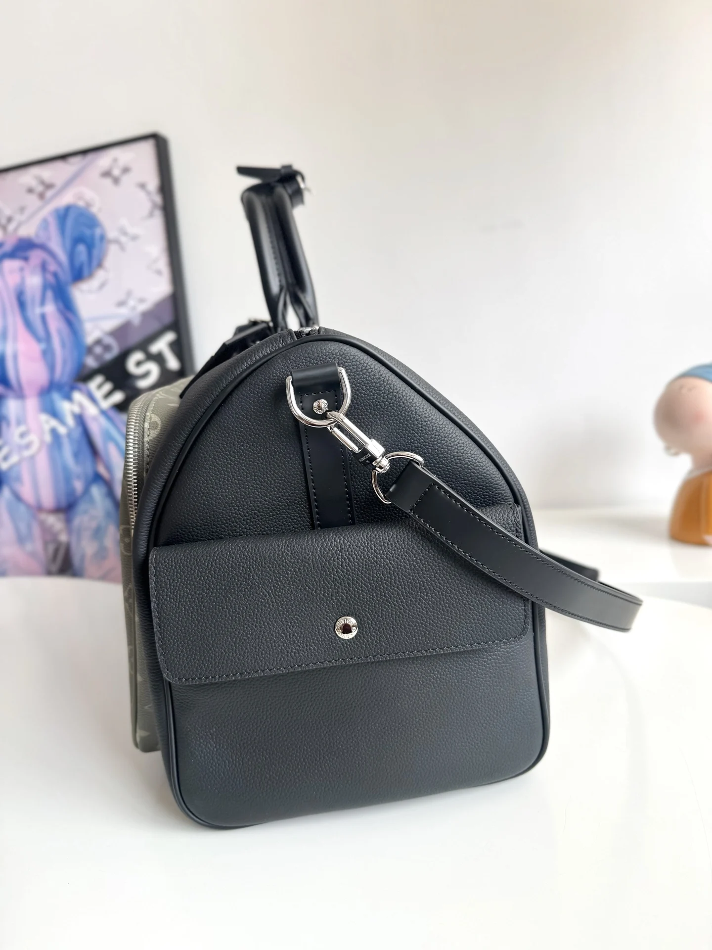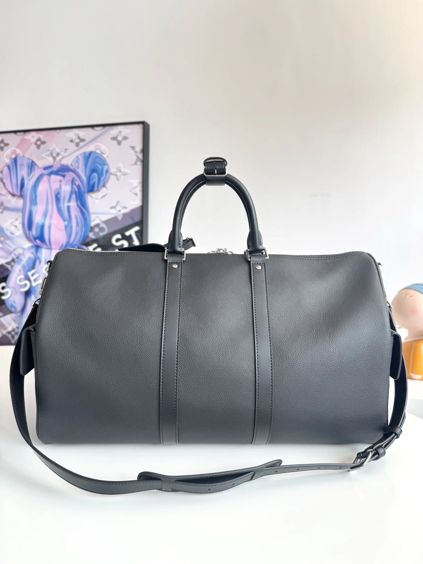 Exclusive original overseas M12690 live shot! This Keepall Bandouliere 50 travel bag is from the LV Park collection, featuring a cleverly integrated Monogram coated canvas zip side pocket with a grain leather body. The detachable LV Lovers suede name tag confirms brand identity. Dimensions: 50×29×23cm