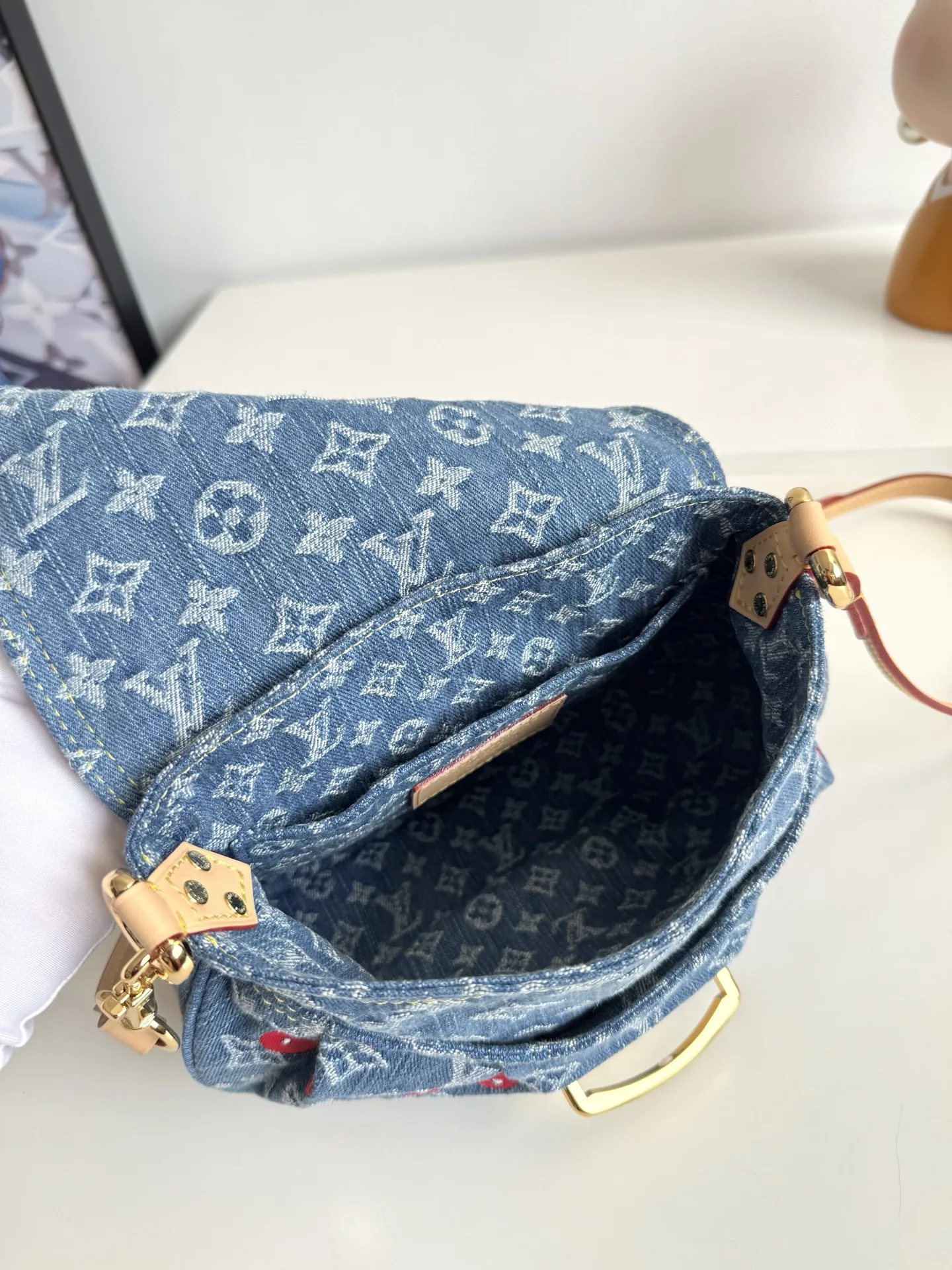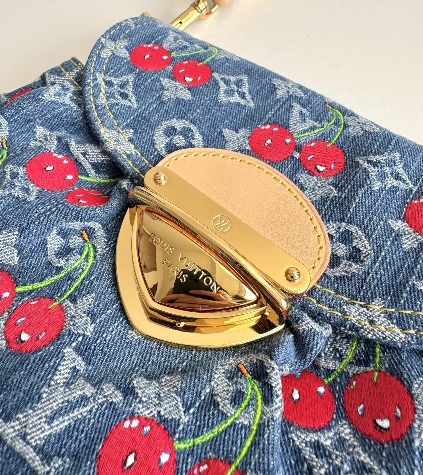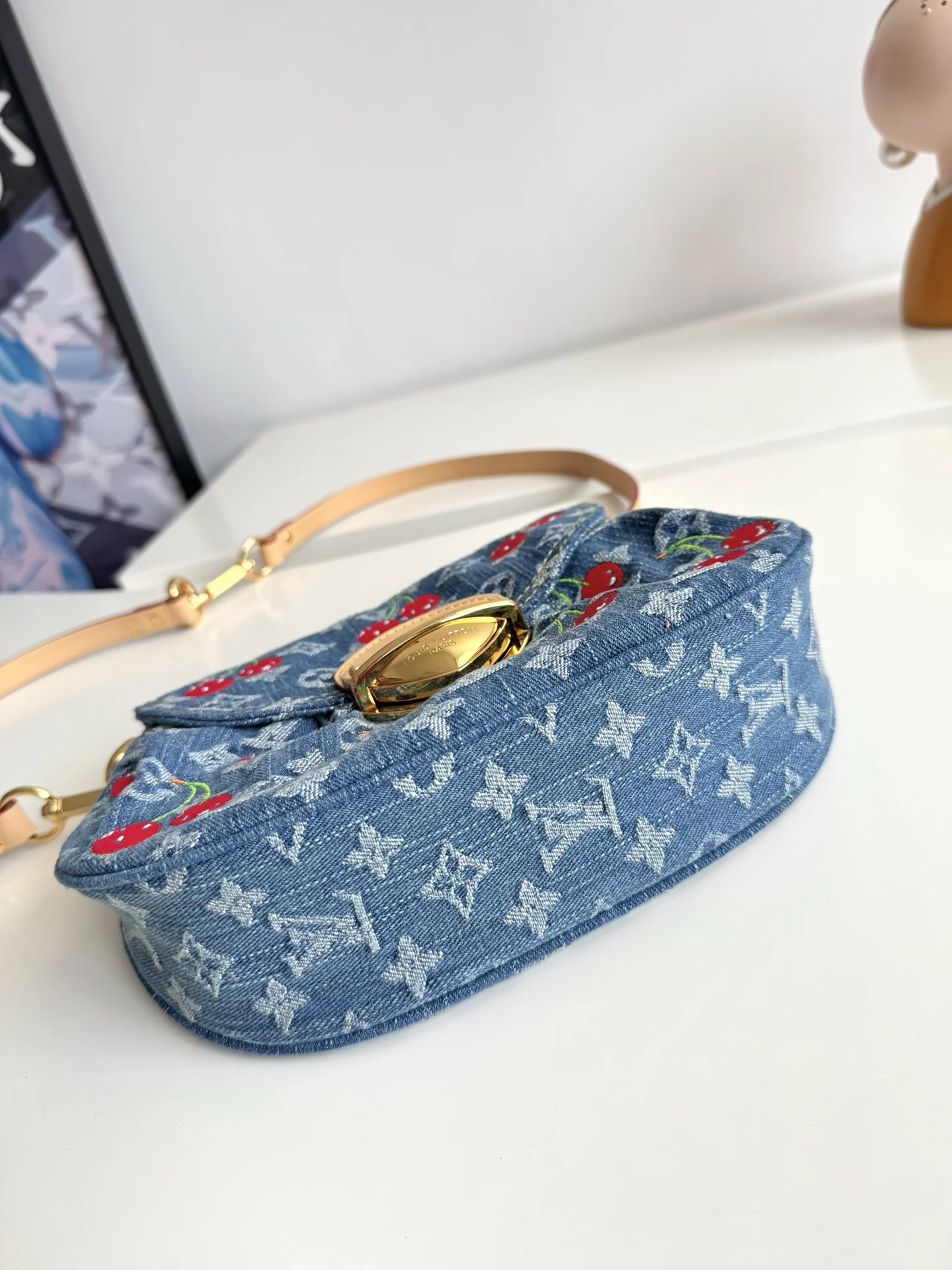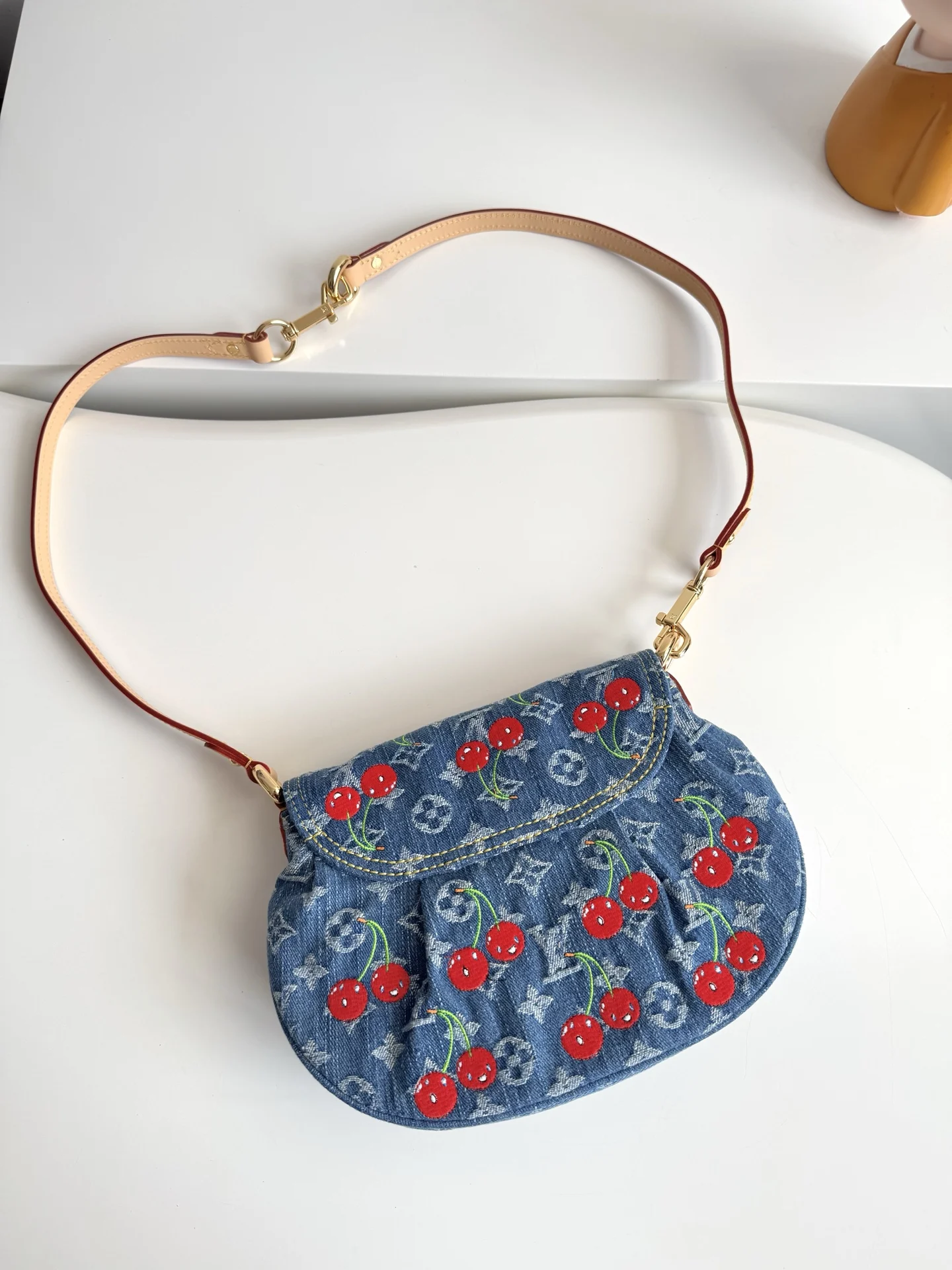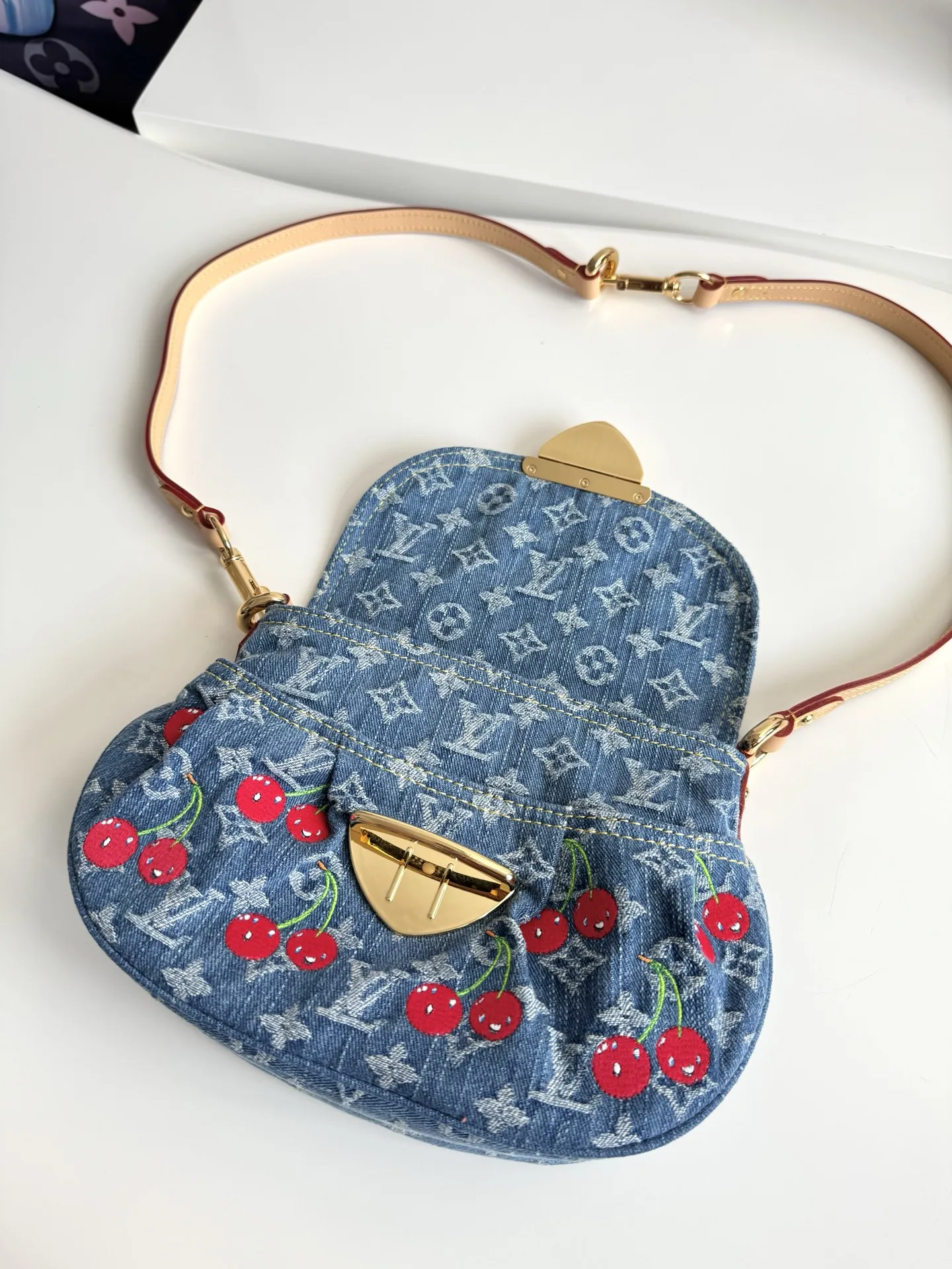Overseas original M13680 exclusive real shot! This Sunset handbag is crafted from Monogram denim with a retro touch to create a rounded shape, and a striking buckle to highlight the design. Bright cherry embroidery showcases the lively style of the Louis Vuitton x Takashi Murakami replica collection, and the studded leather shoulder strap completes the overall look. Size: 27×18×3cm