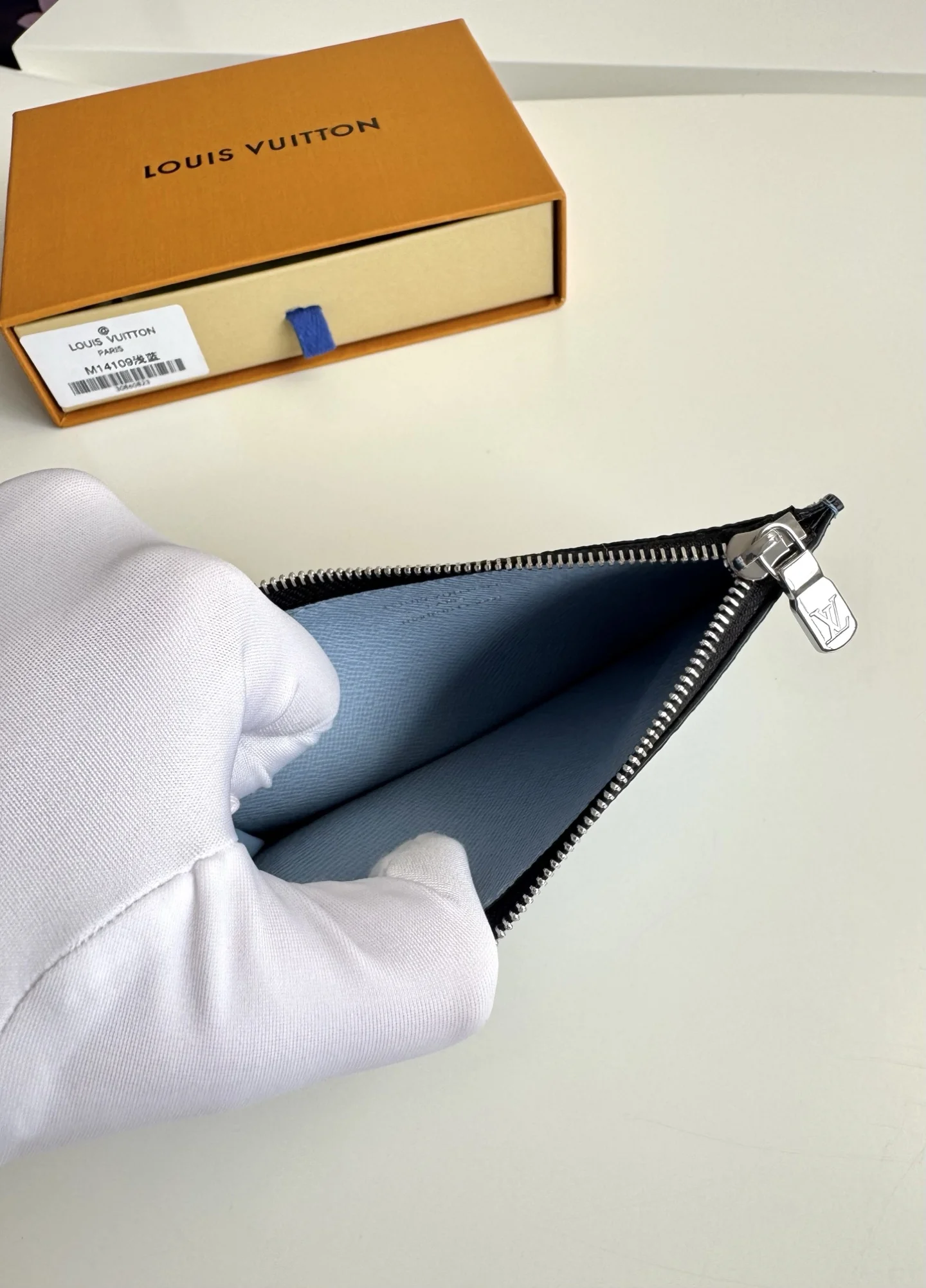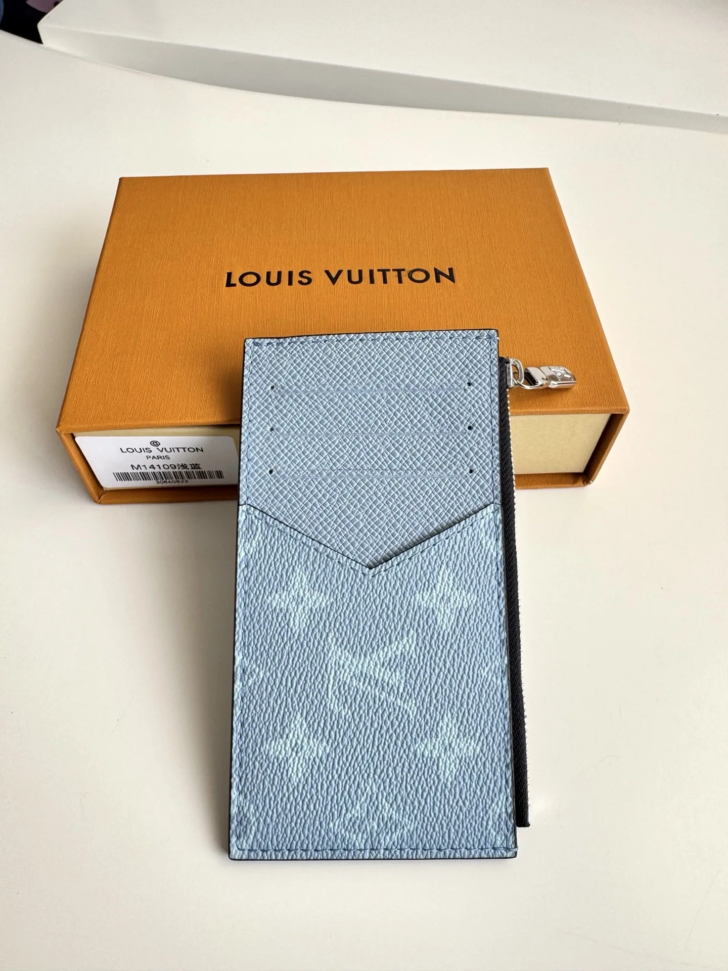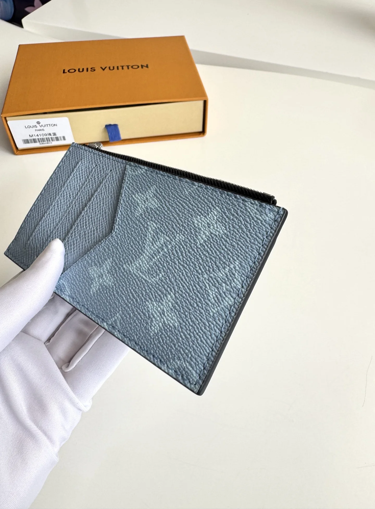 Overseas original M14109 light blue exclusive real shot. This Coin card holder, made from the new Monogram Eclipse coated canvas material, is a secure choice for storing coins. Its appearance is sleek and tidy, featuring credit card slots, a zippered coin pocket, and a bill compartment. The black leather lining complements the black and gray canvas exterior, making it stylish and elegant. Size: 14×8cm