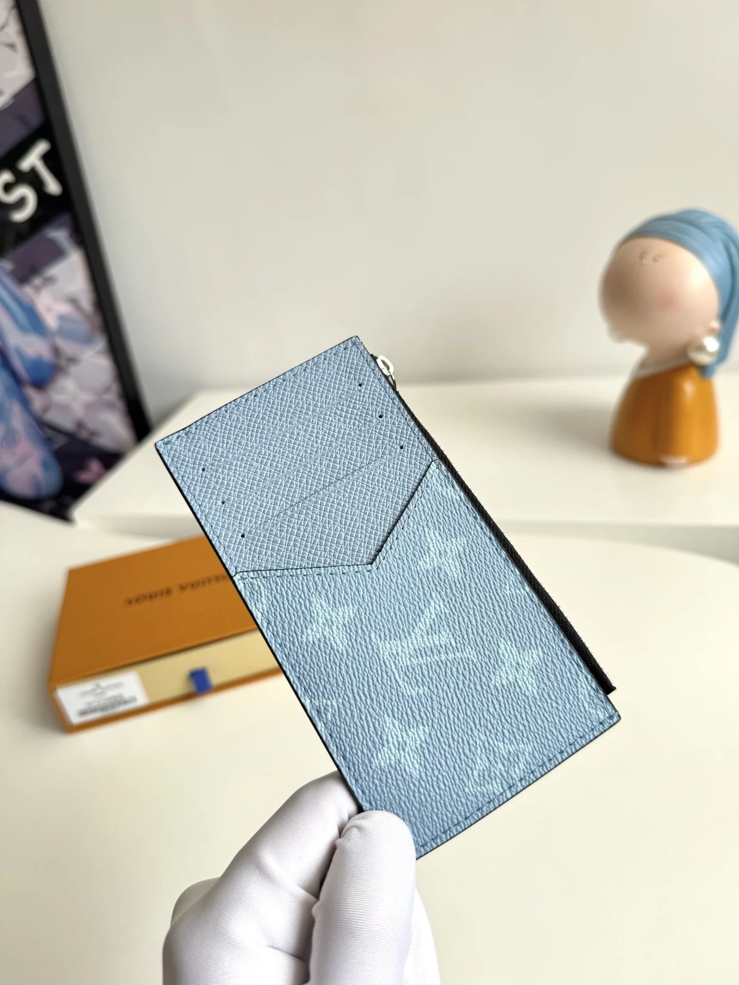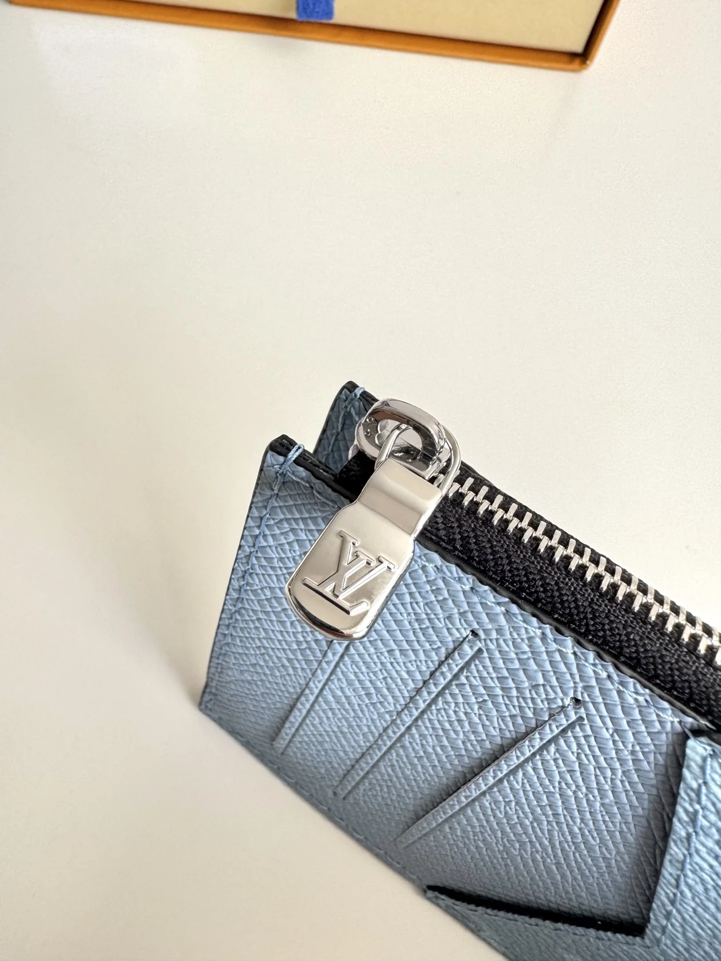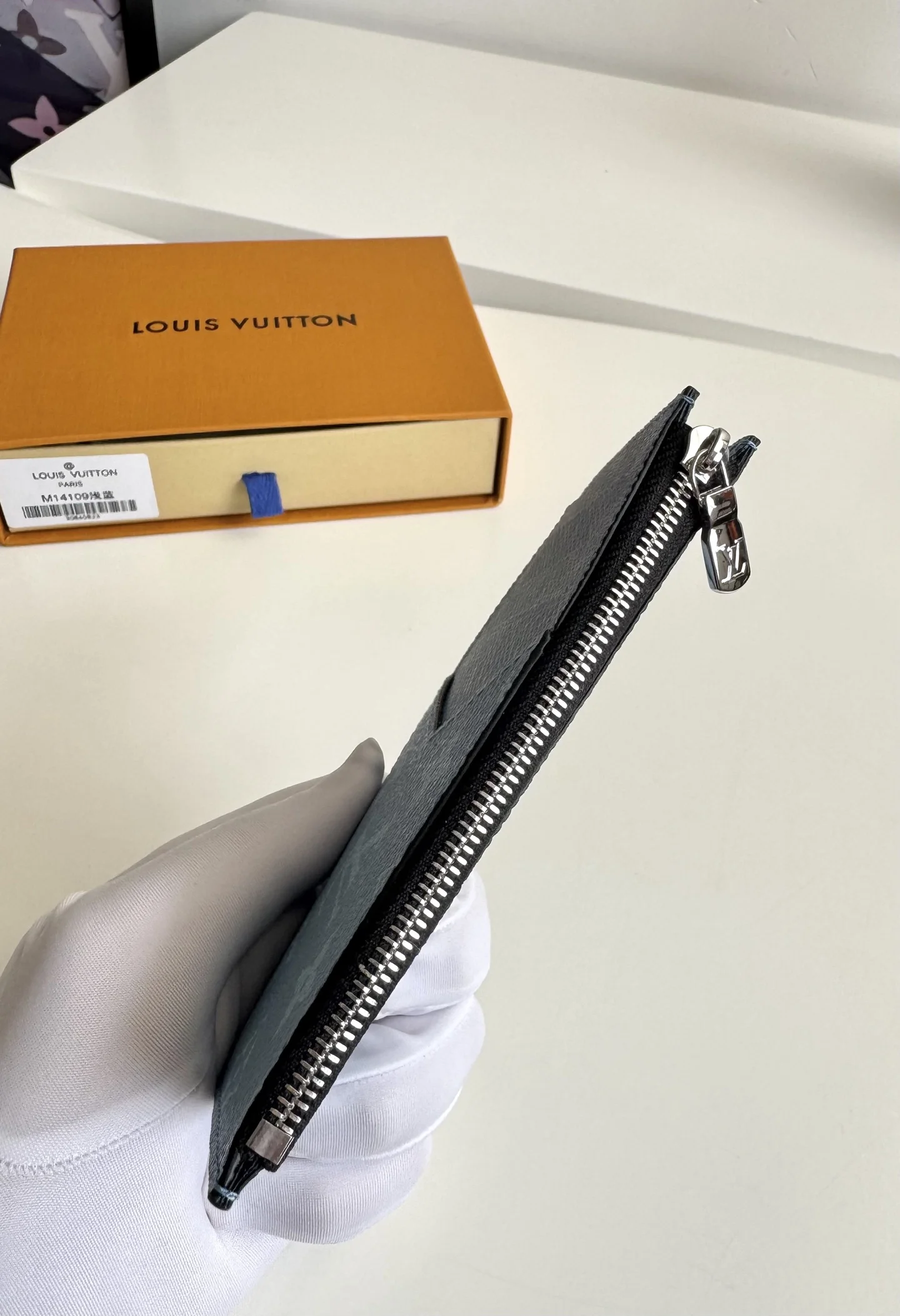 Overseas original M14109 light blue exclusive real shot. This Coin card holder, made from the new Monogram Eclipse coated canvas material, is a secure choice for storing coins. Its appearance is sleek and tidy, featuring credit card slots, a zippered coin pocket, and a bill compartment. The black leather lining complements the black and gray canvas exterior, making it stylish and elegant. Size: 14×8cm