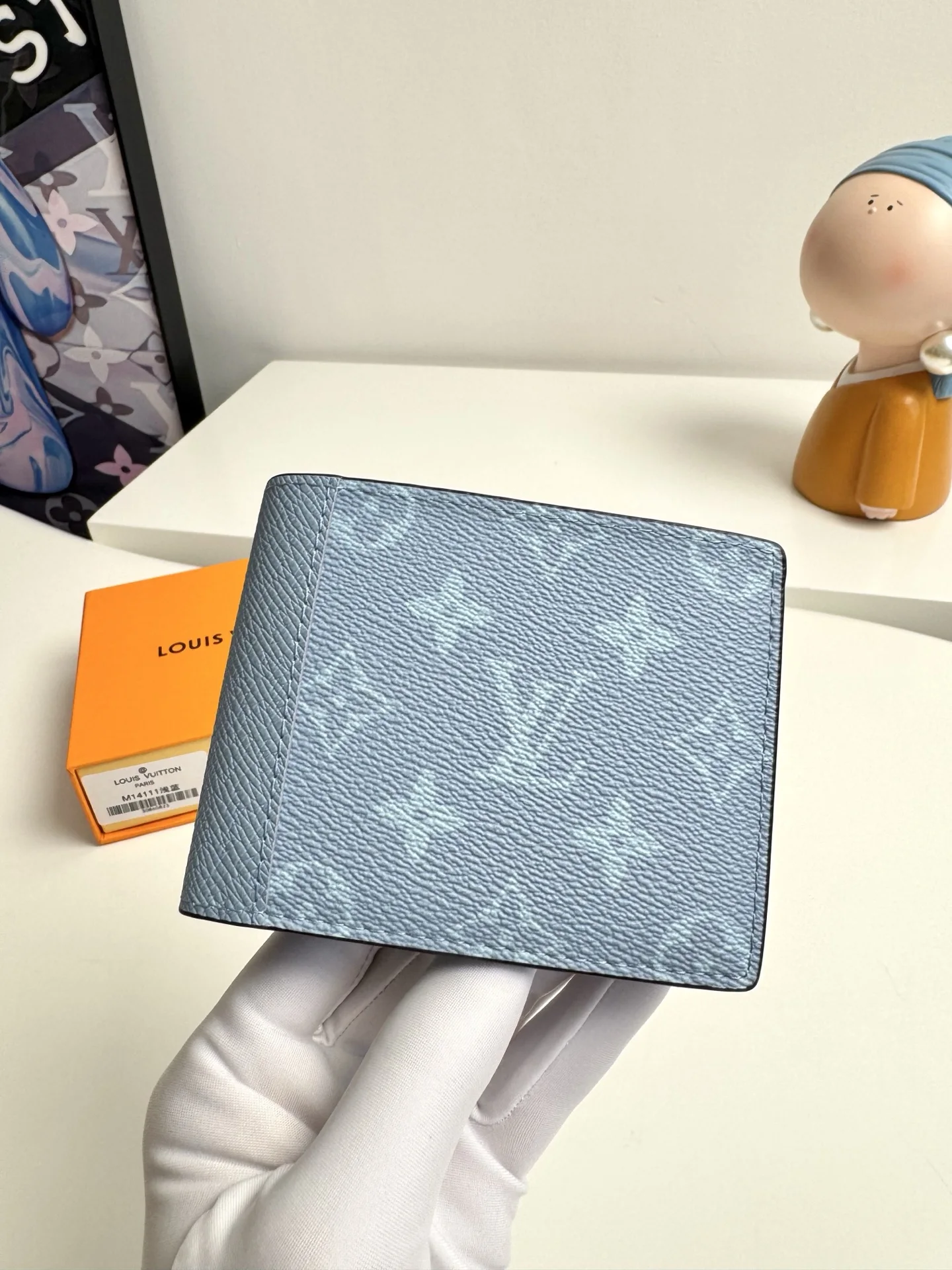Overseas original single M14111 light blue exclusive real shot! This compact Multiple wallet showcases a sleek and refreshing color scheme with Monogram canvas in matching tones paired with Taiga leather, exuding a lively and sporty vibe. The interior features a blue cowhide lining and includes three card slots, two interior pockets, two bill compartments, and two side slots. This Multiple wallet fits into most pockets. Dimensions: 11.5 x 9 x 1.5 cm