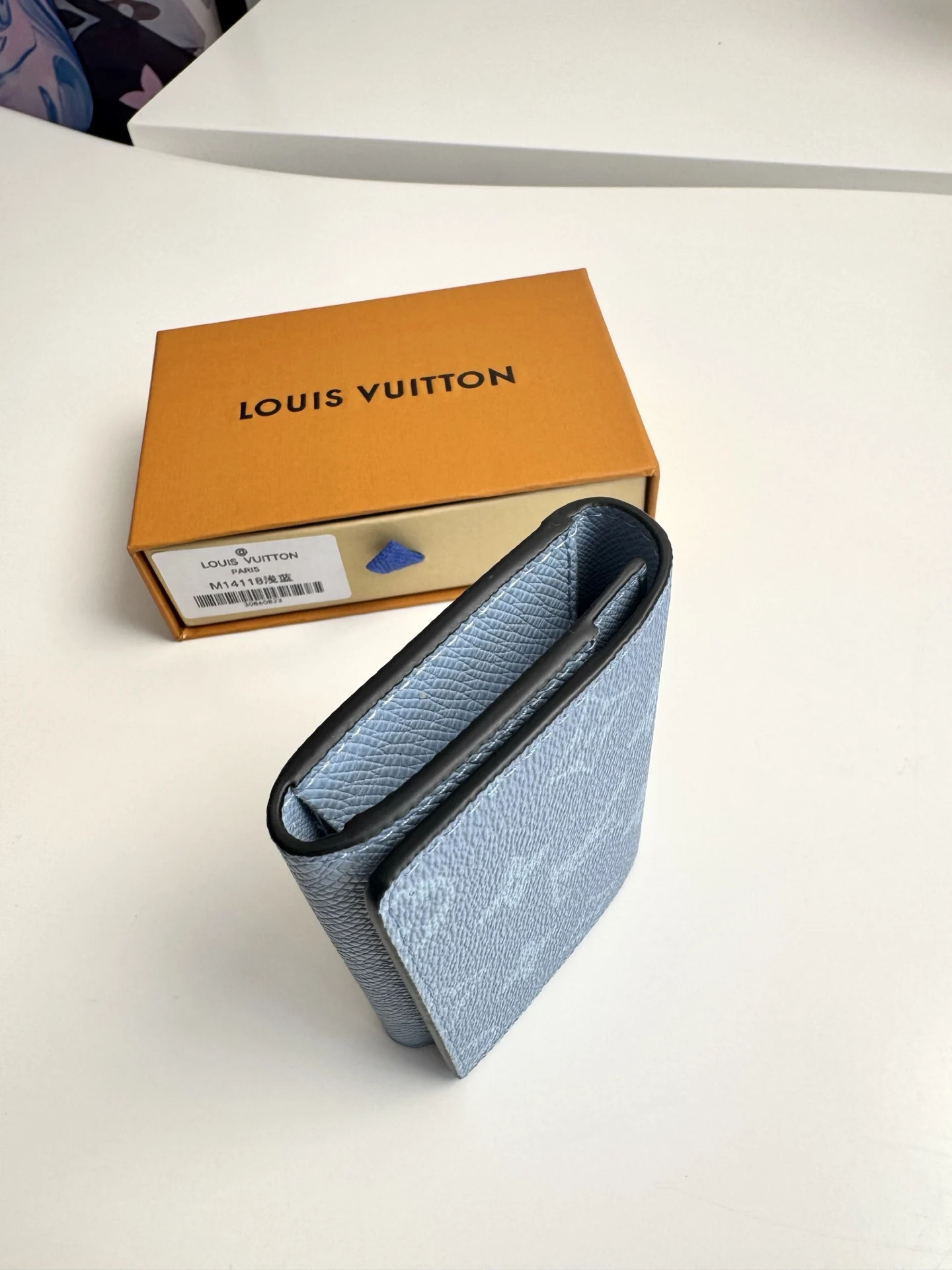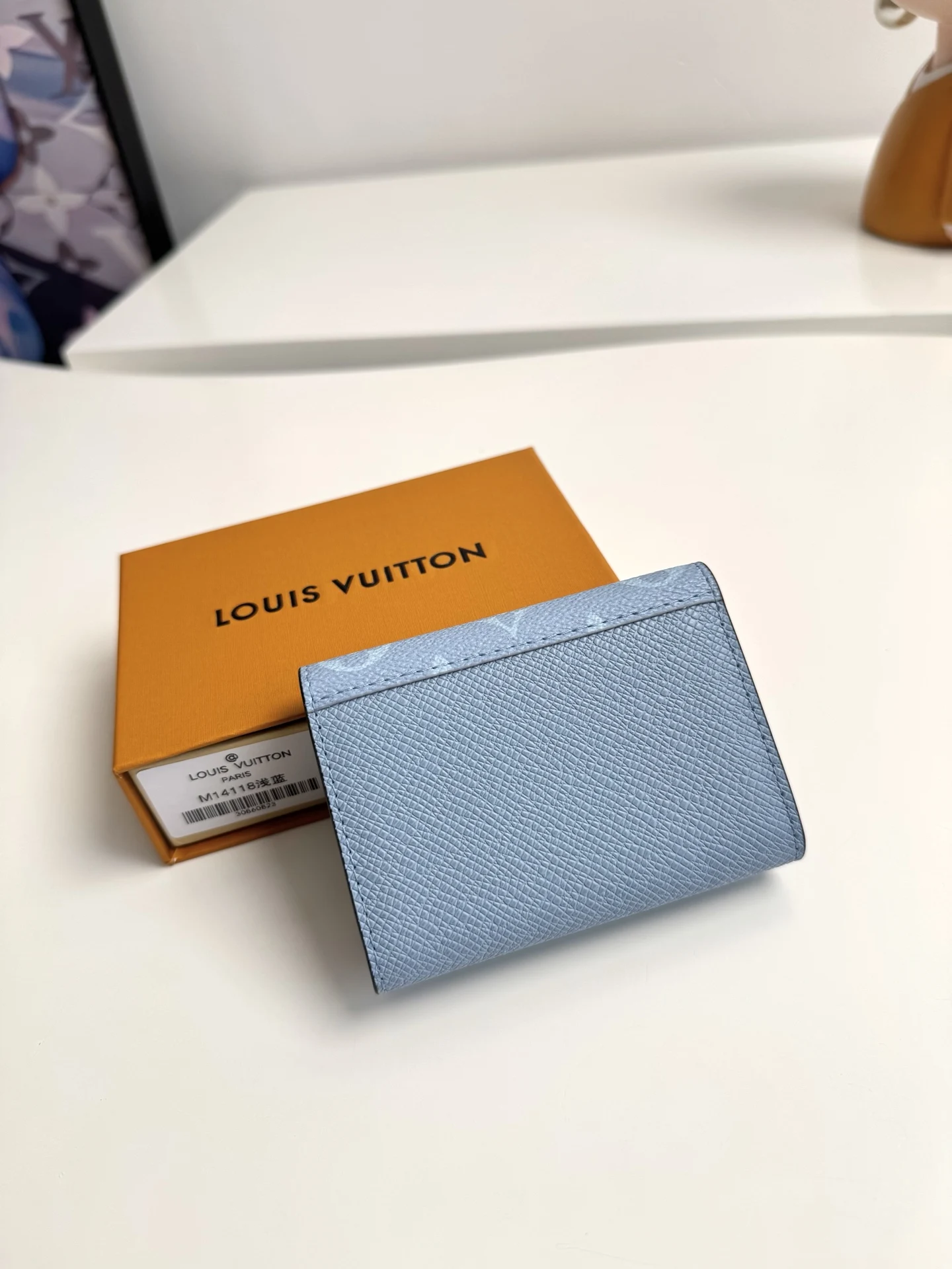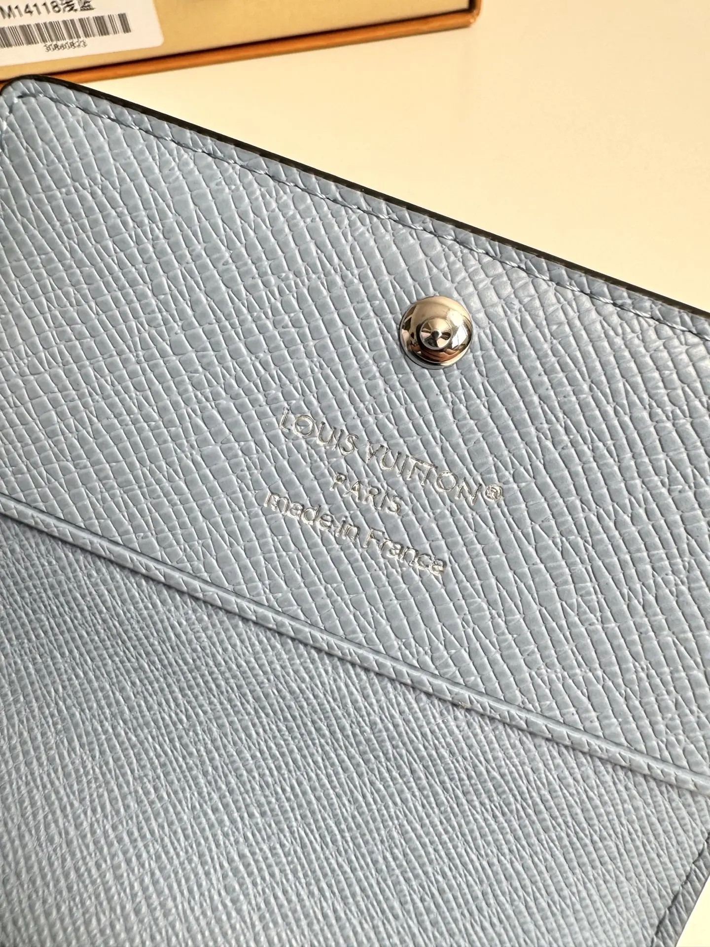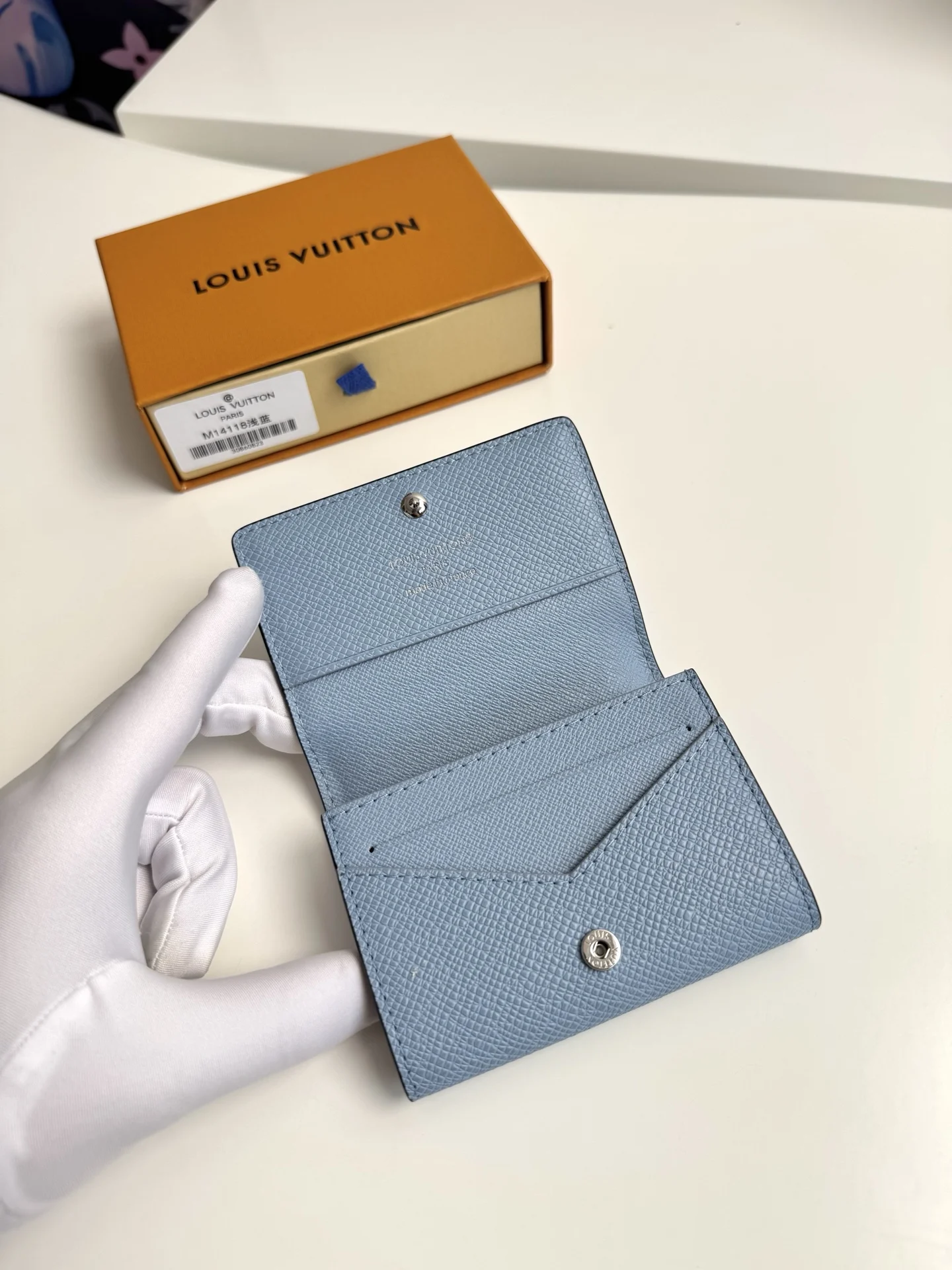 Original overseas order M14118 light blue exclusive real shot! ENVELOPPE CARTE DE VISITE business card holder, crafted from Damier Graphite coated canvas, this slim and refined Enveloppe Carte de Visite business card holder fits easily into a pocket or bag. Snap closure design securely stores business cards and credit cards. Dimensions: 10.5 x 8 cm