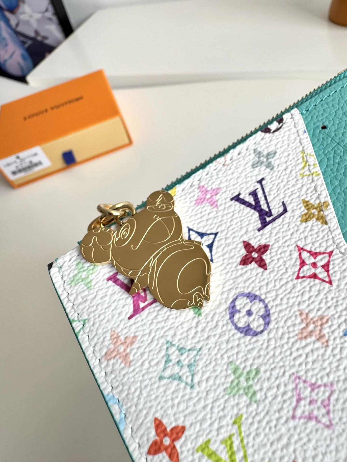 Overseas original M14171 blue exclusive real shot! This Romy card holder is from the Louis Vuitton x Takashi Murakami crossover collaboration series, featuring fresh colors rendered in Monogram Empreinte leather, cleverly paying homage to the rainbow tones of the Japanese artist. The colorful Monogram coated canvas highlights the pocket, while the panda-shaped zipper pull adds a new seasonal charm. Size: 12×8×0.8cm