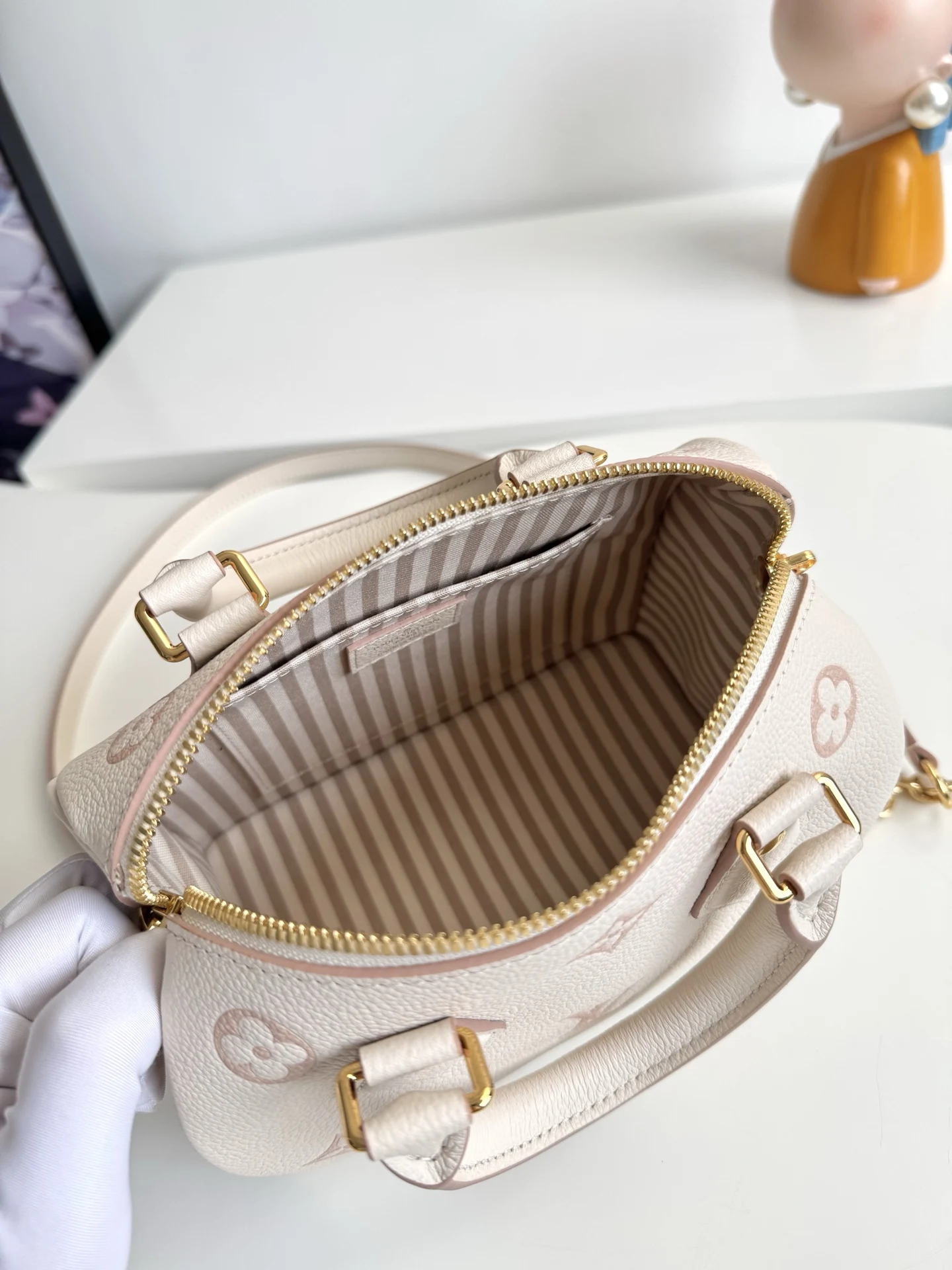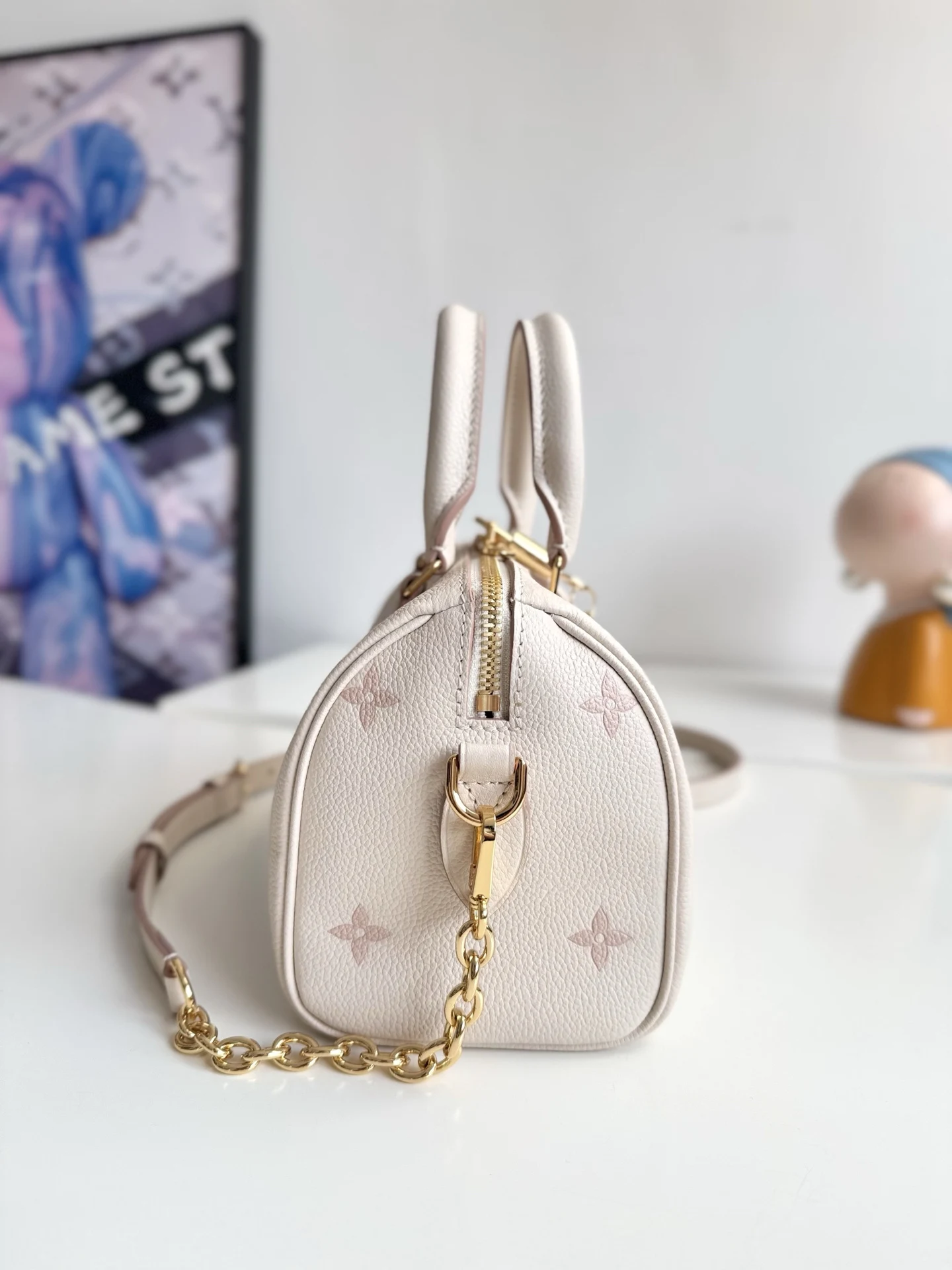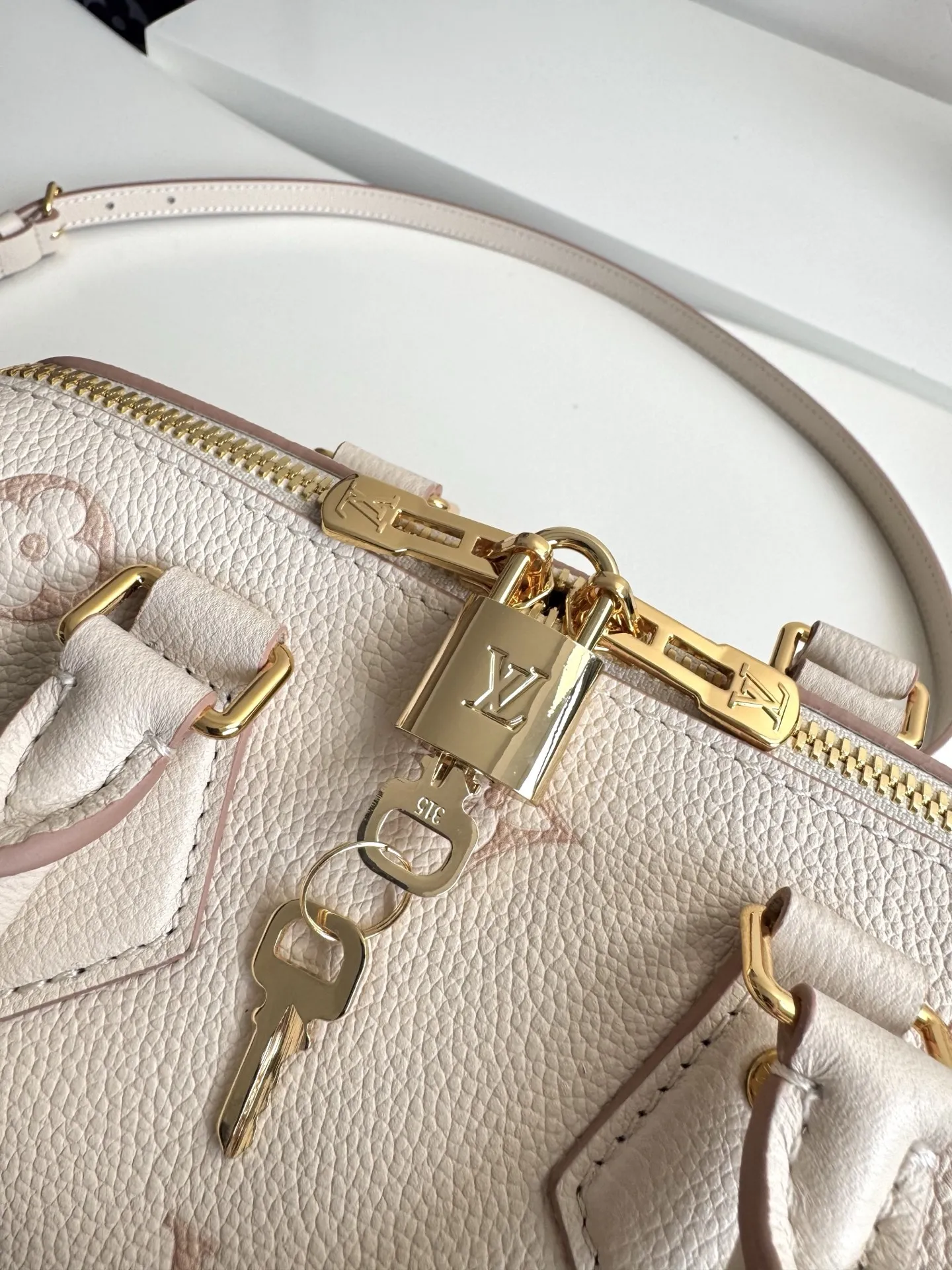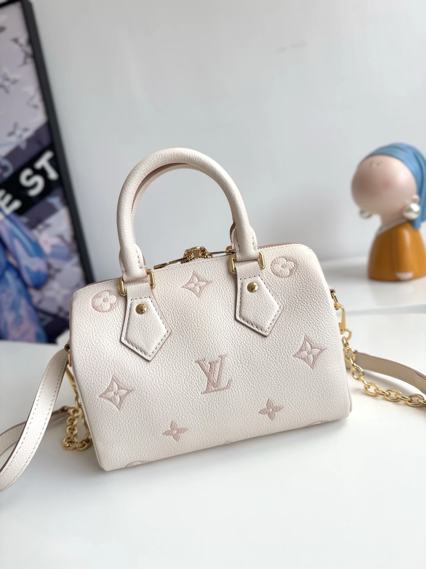 Exclusive real shot of overseas original M14291! This Speedy Bandouliere 20 handbag refreshes the brand s classic Monogram Empreinte leather, outlining the pattern in the same tone, and enriching the details with striped lining, a dazzling padlock, and a detachable chain. The compact design accommodates daily essentials and can be carried by hand or worn crossbody. Dimensions: 20.5×13.5×12cm