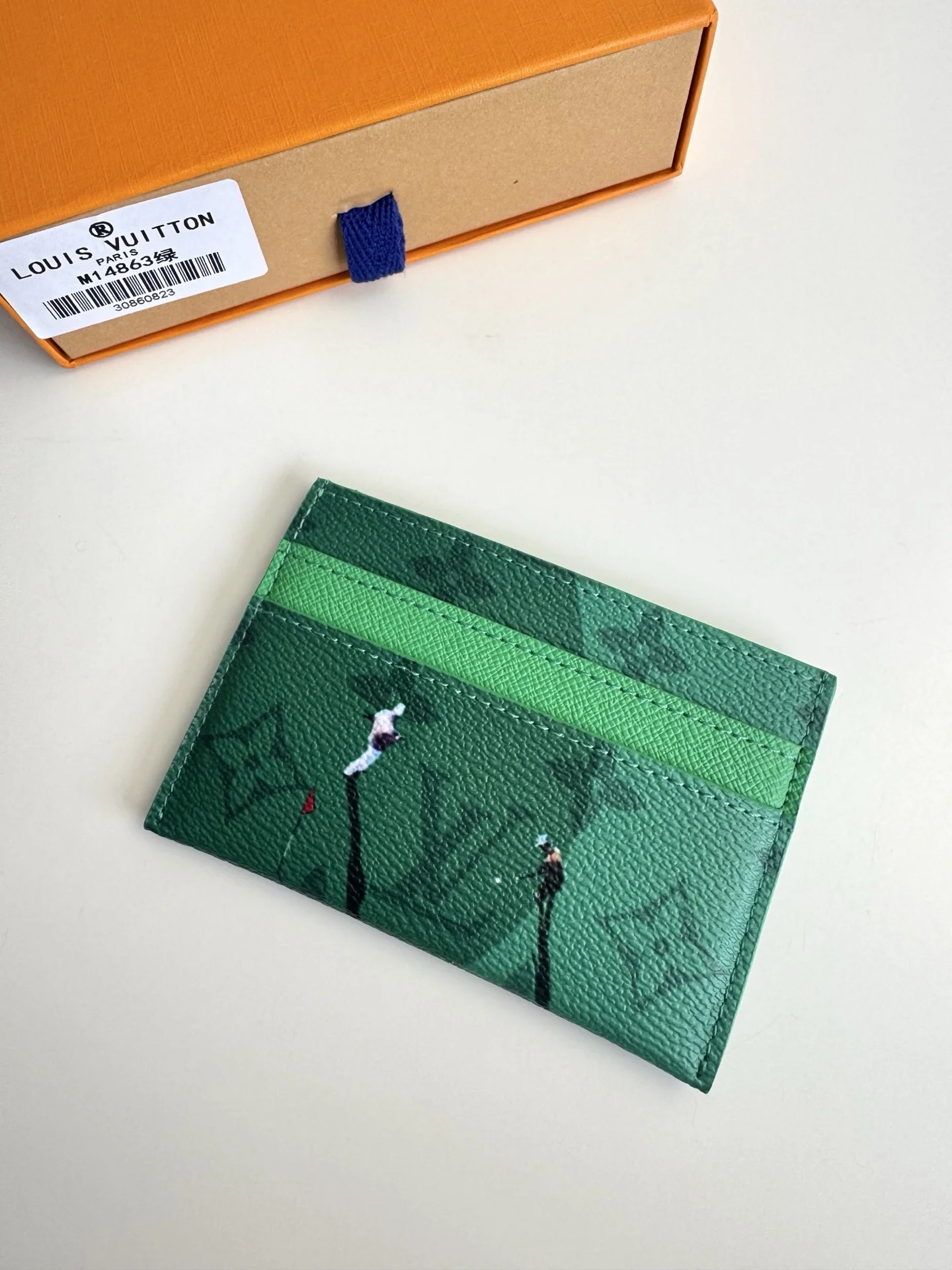 Overseas original M14863 green exclusive real shot! This Double card holder is part of the Father s Day collection, featuring a Colored Monogram canvas infused with a miniature sports scene print, complemented by a leather lining for a classic touch. The card slots and central pocket allow for organized storage. Dimensions: 11×7×1.5cm