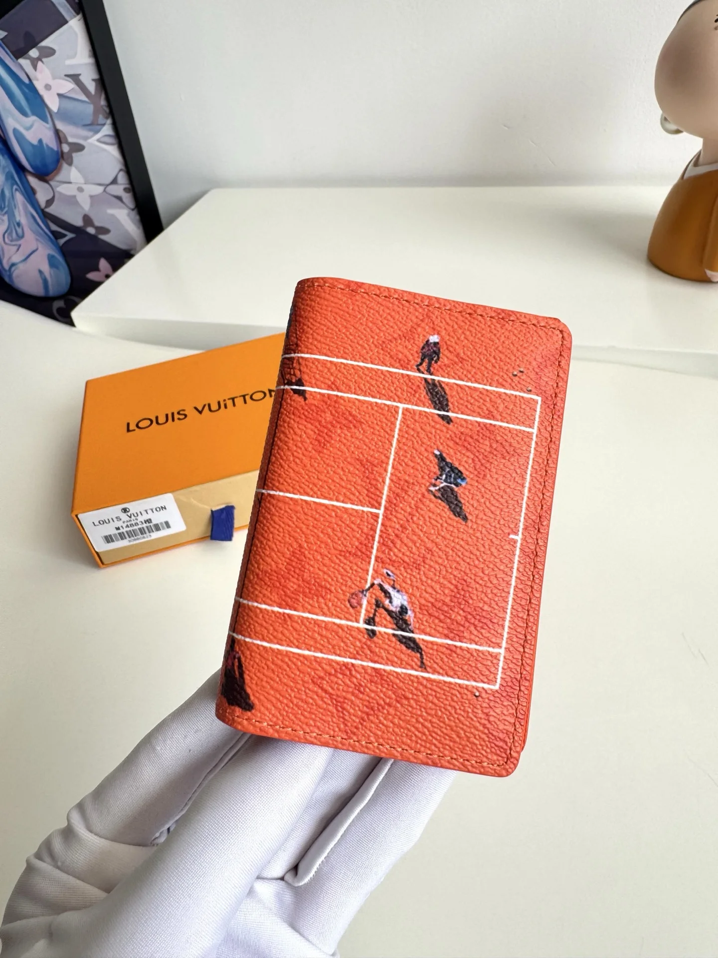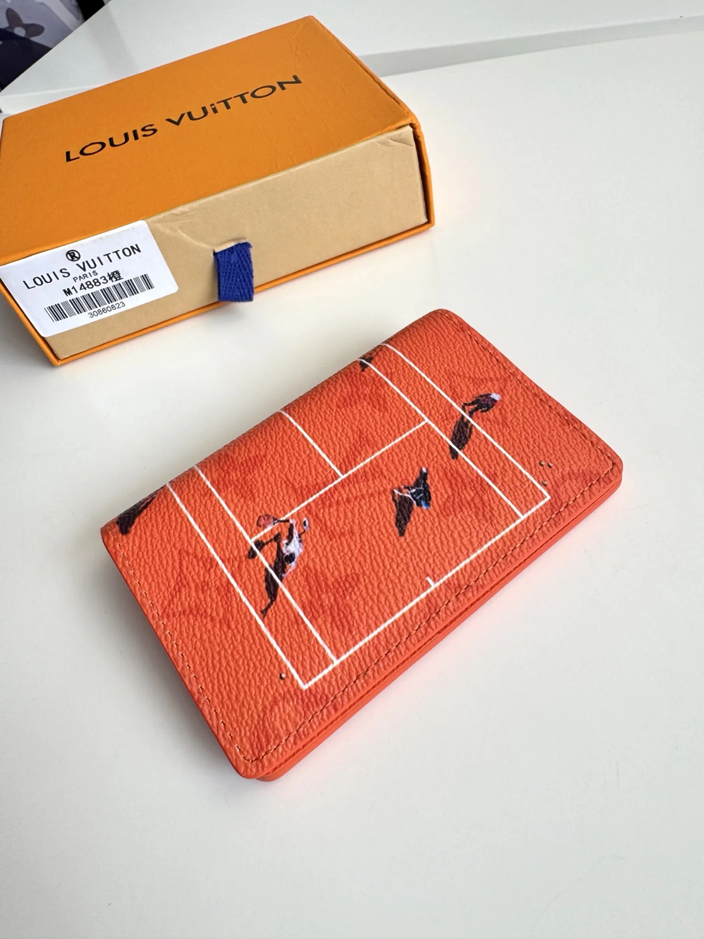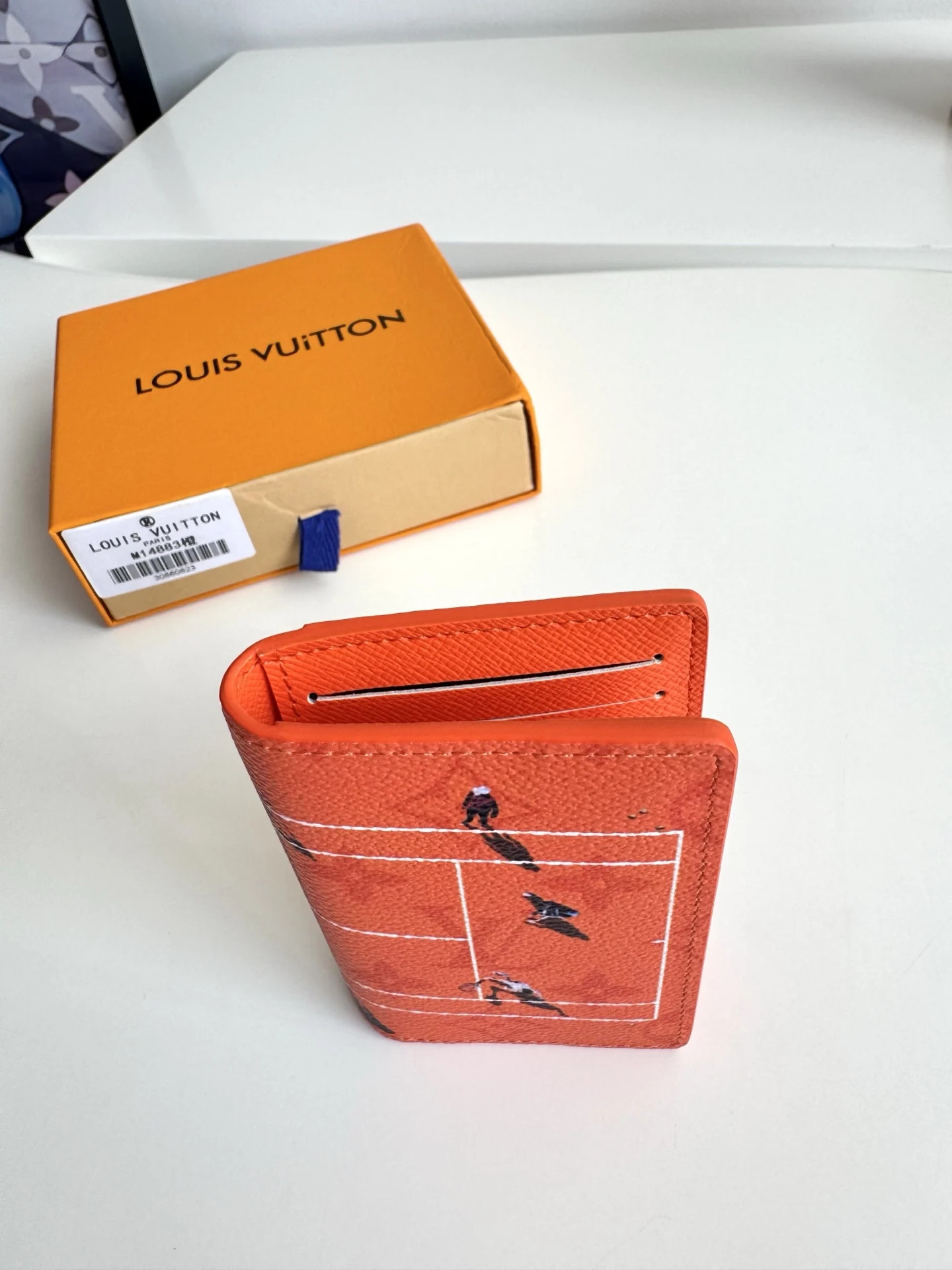 Overseas original M14883 orange exclusive shooting! This pocket wallet is made of Colored Monogram canvas, featuring realistic athlete patterns and silhouettes transformed into miniature sports scene prints, complementing the classic Monogram. The card slots, inner pocket, and outer pocket highlight functional considerations, making it another great Father s Day gift. Size: 11×7.5×1cm