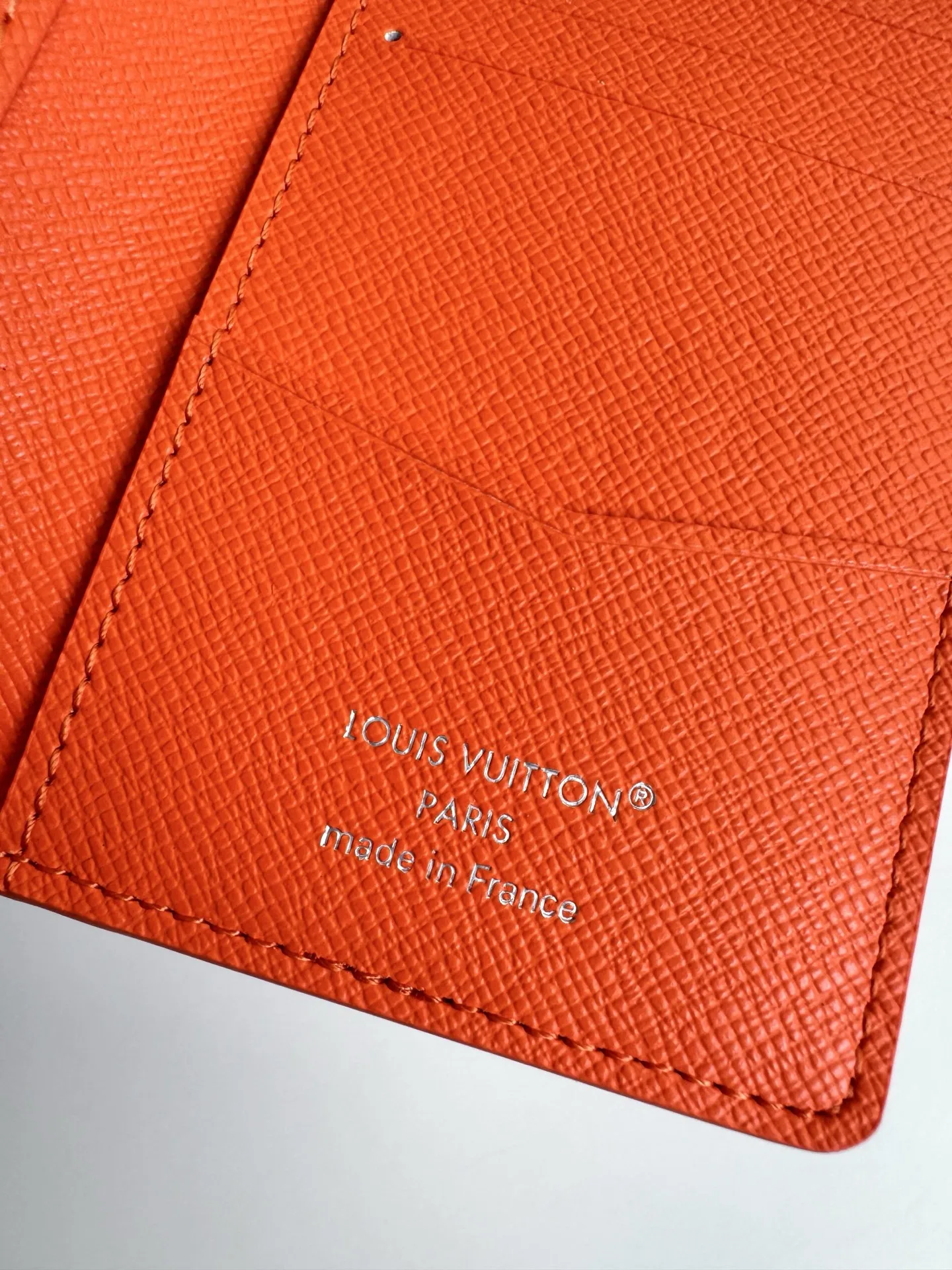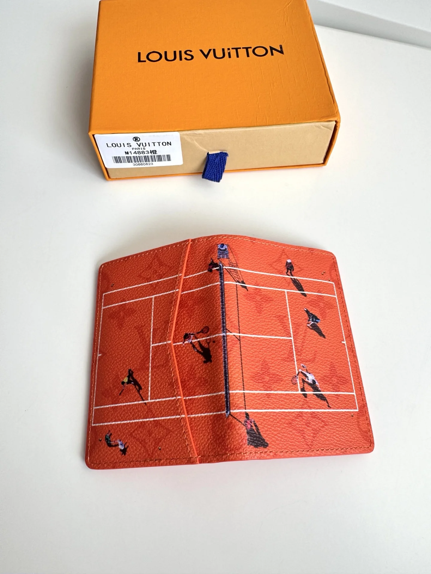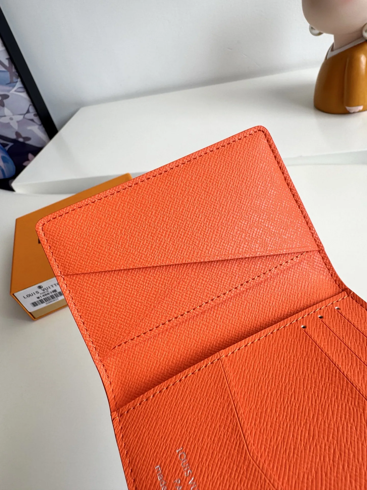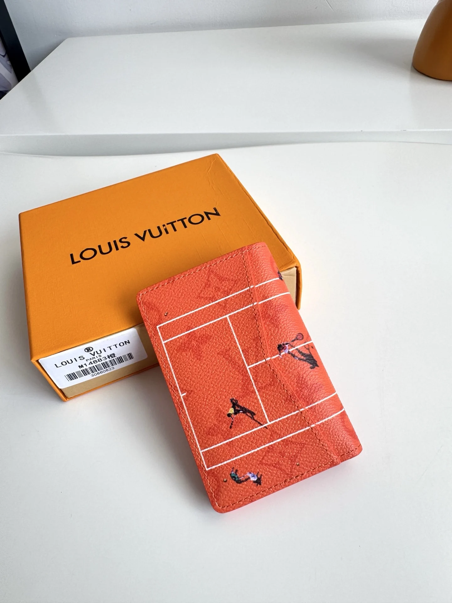 Overseas original M14883 orange exclusive shooting! This pocket wallet is made of Colored Monogram canvas, featuring realistic athlete patterns and silhouettes transformed into miniature sports scene prints, complementing the classic Monogram. The card slots, inner pocket, and outer pocket highlight functional considerations, making it another great Father s Day gift. Size: 11×7.5×1cm