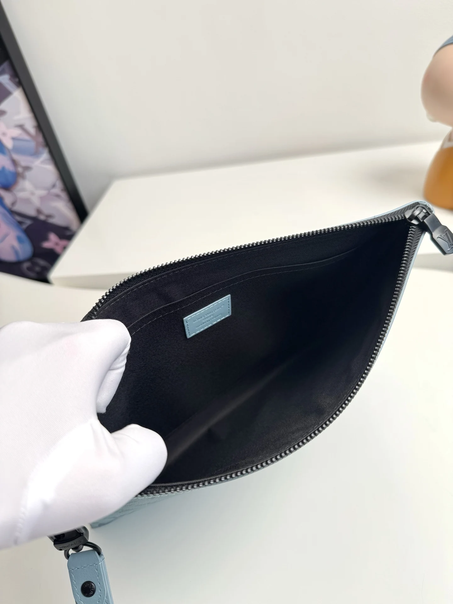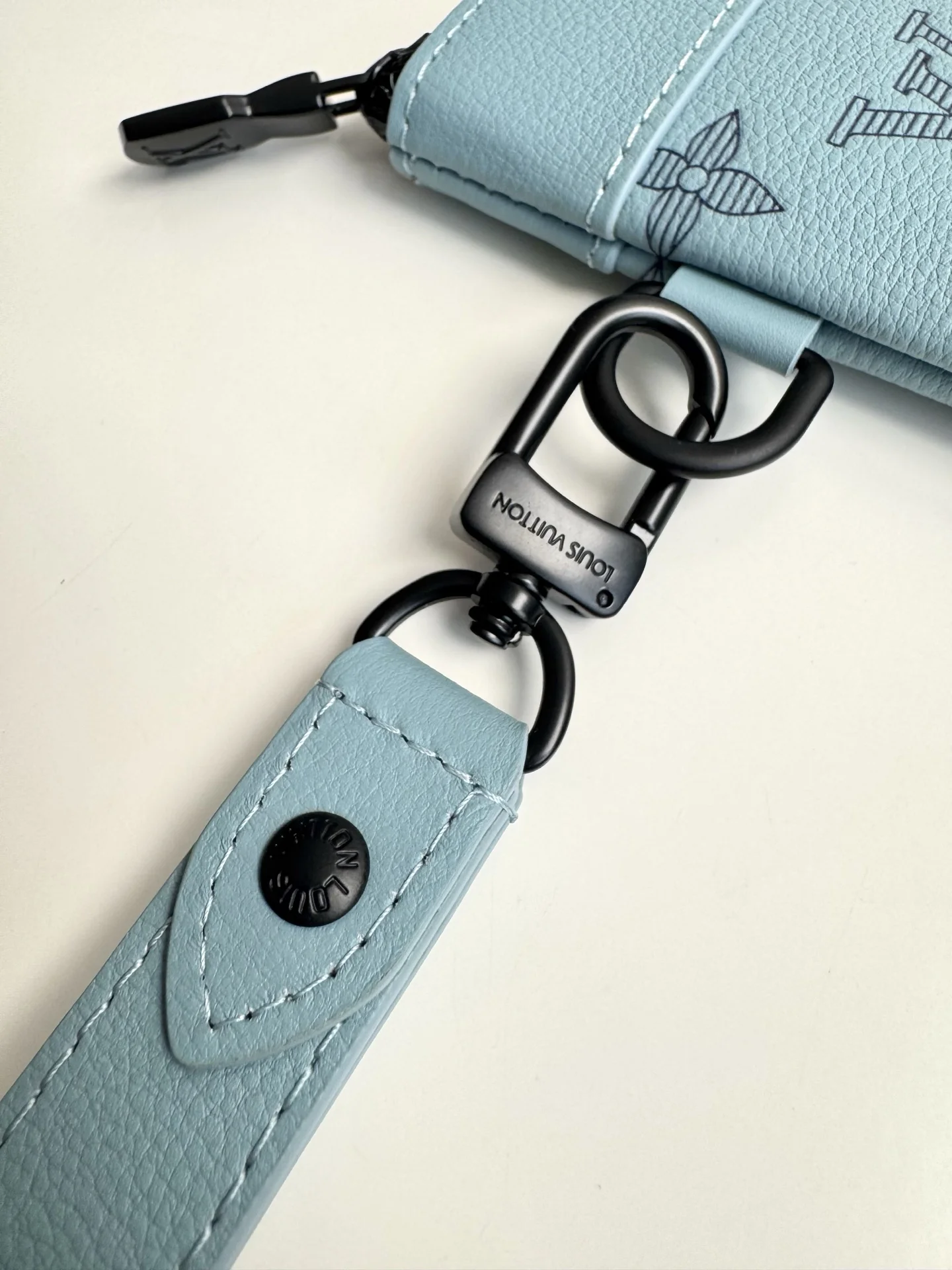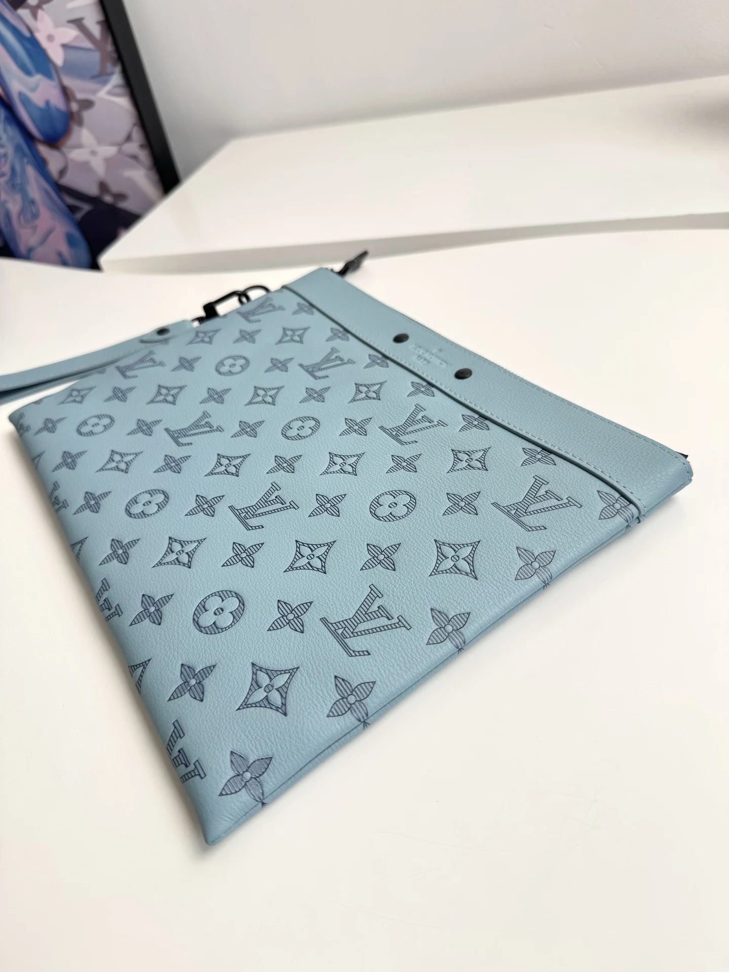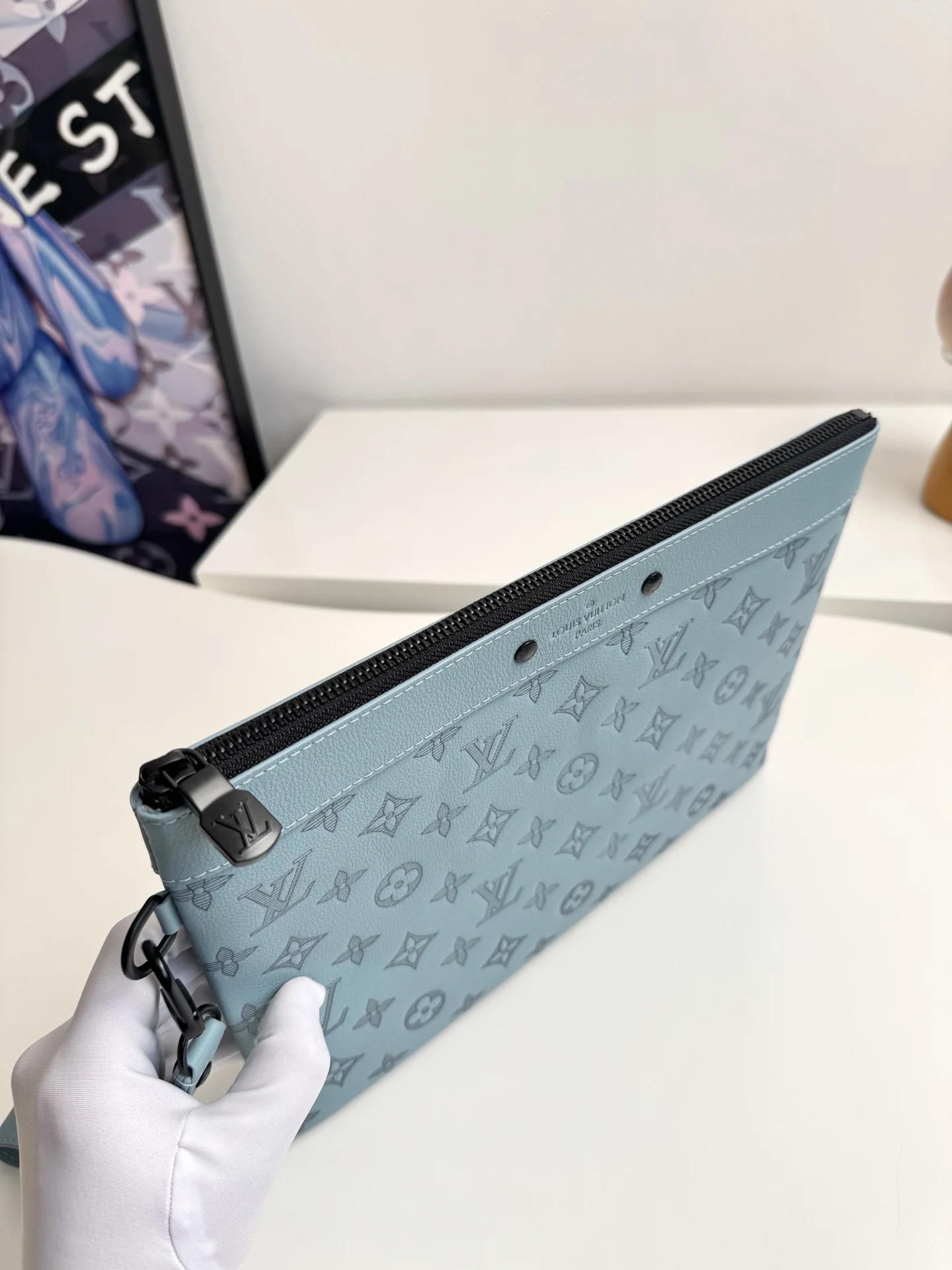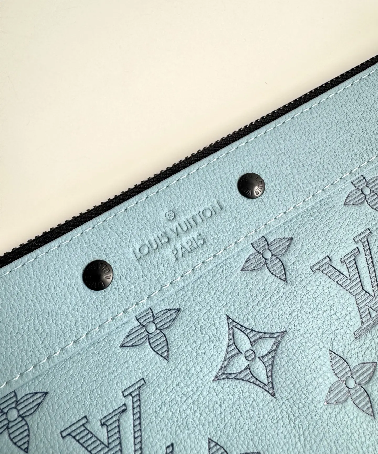 Original overseas order M14914 ice blue exclusive real shot! This Pochette To-Go clutch is crafted from Monogram Shadow embossed cowhide leather, establishing its identity with a slim silhouette, sophisticated hardware, and a detachable wrist strap. Elegant rivets accentuate the Louis Vuitton Paris embossed signature, while ample space accommodates smartphones, wallets, and other small items. Dimensions: 30 × 21 × 1cm