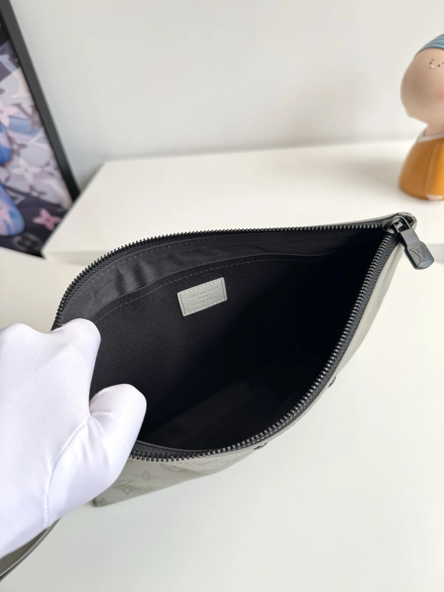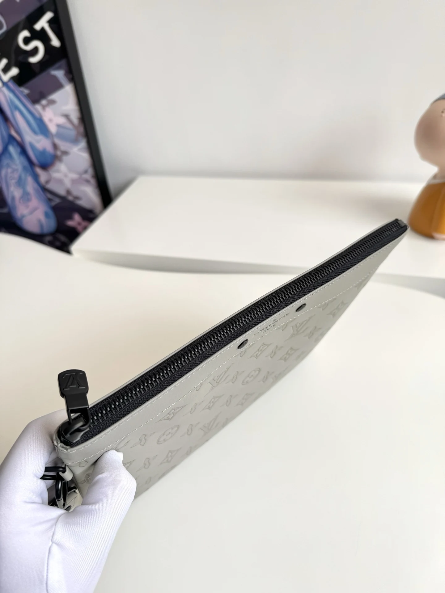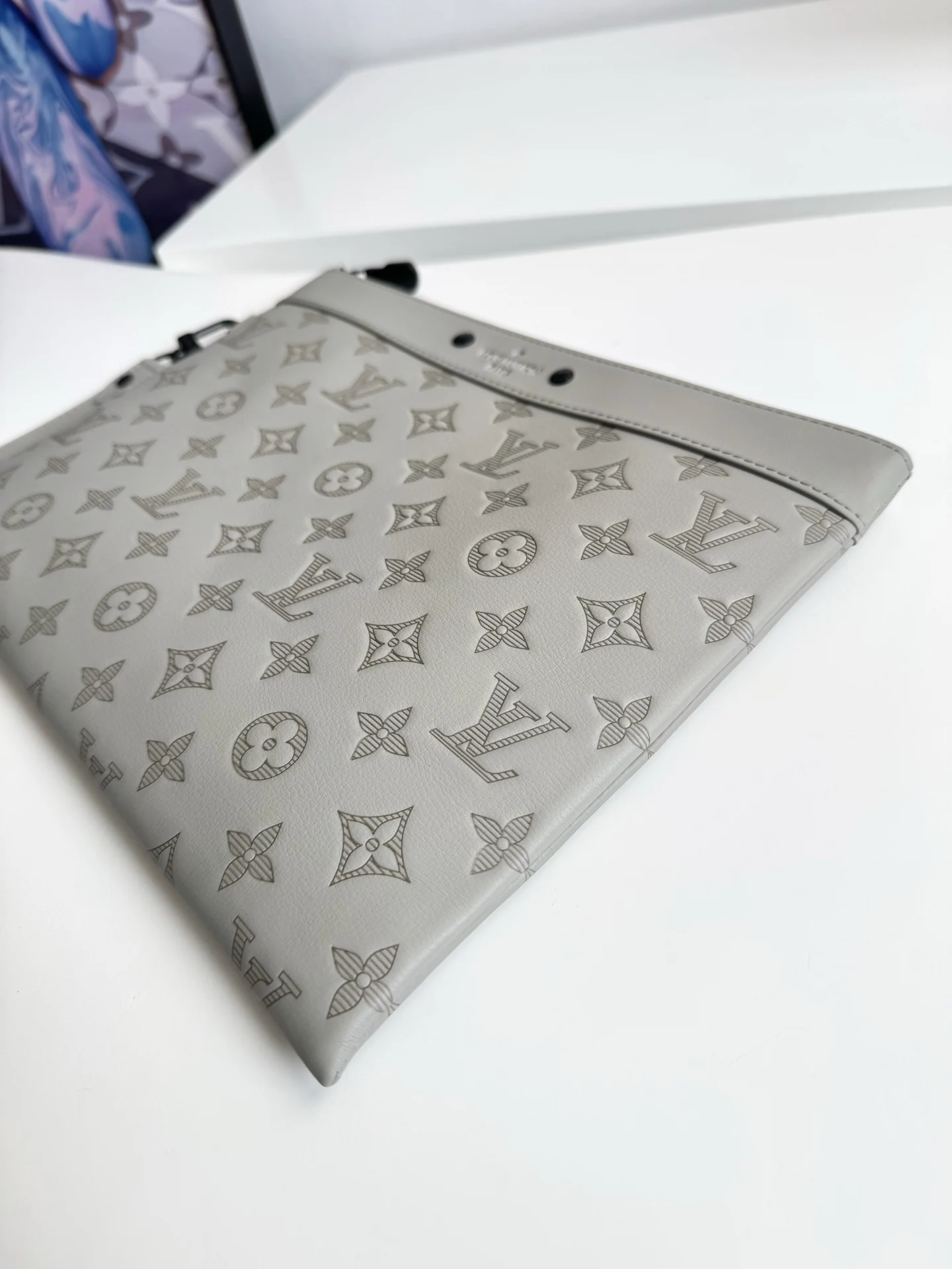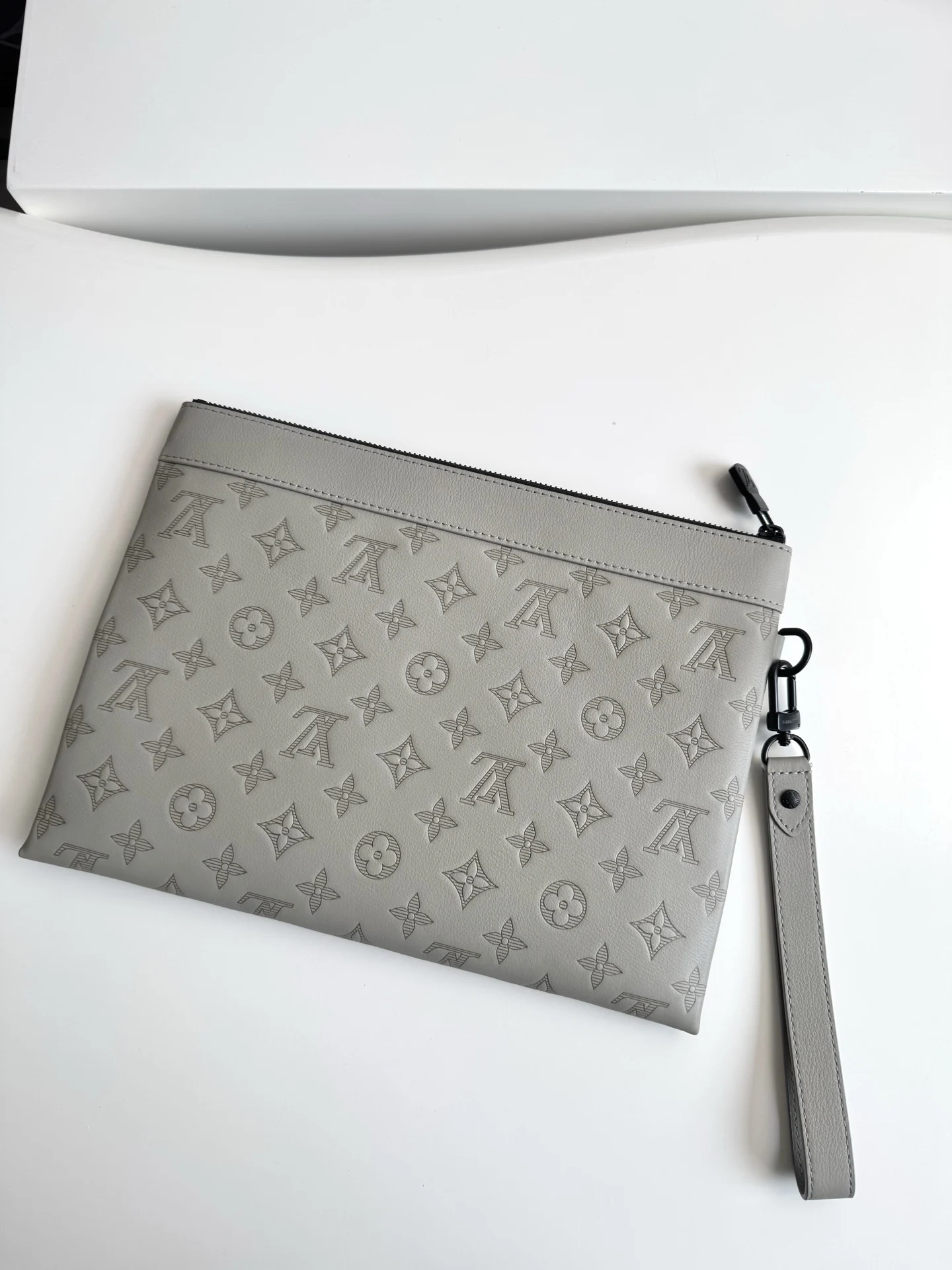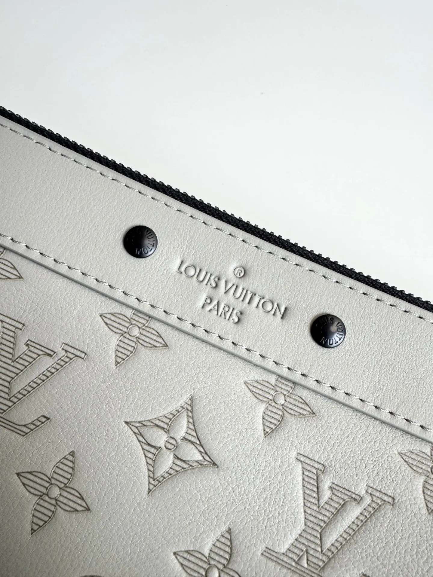Exclusive real shot of overseas original M14914 in Ice Grey! This Pochette To-Go clutch is made from Monogram Shadow embossed leather, featuring a slim silhouette, exquisite metal fittings, and a detachable wrist strap for distinct recognition. Elegant studs highlight the Louis Vuitton Paris embossed logo, and the ample space can accommodate a smartphone, wallet, and other small items. Dimensions: 30×21×1cm