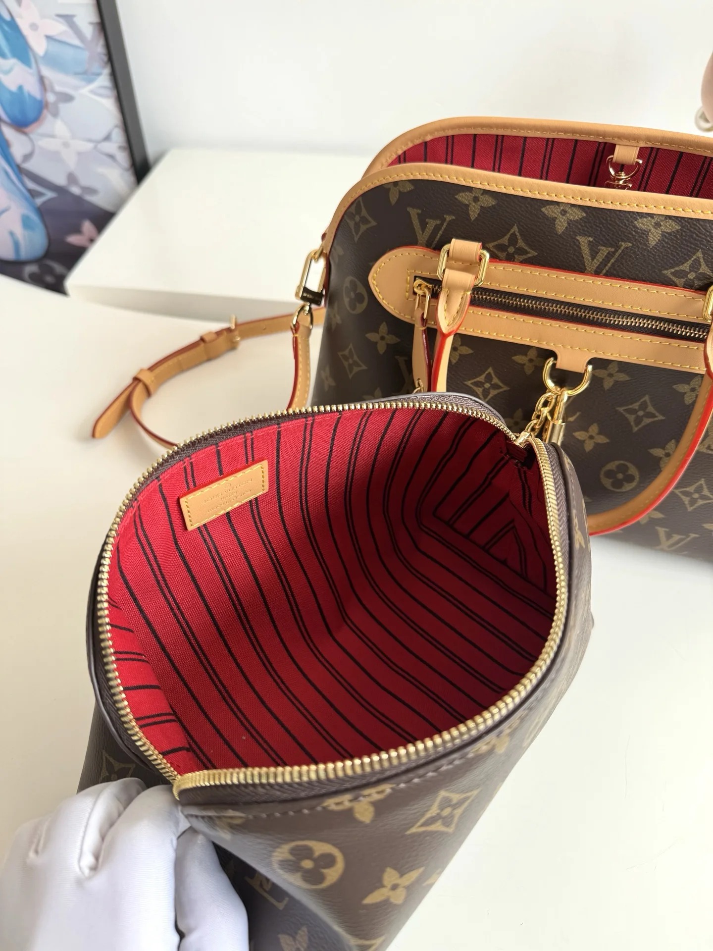 Exclusive real shots of the overseas original M15208! This Ever More small handbag interprets the trendy Parisian style with the smooth lines of the Alma handbag. The classic Monogram canvas body is adorned with a dazzling decorative chain and leather trim. Both the shoulder strap and the Monogram clutch are detachable, providing versatile carrying options for the former, while the latter can serve as an internal compartment or be held separately, achieving a subtle balance between elegance and functionality. Dimensions: 35×21×12cm