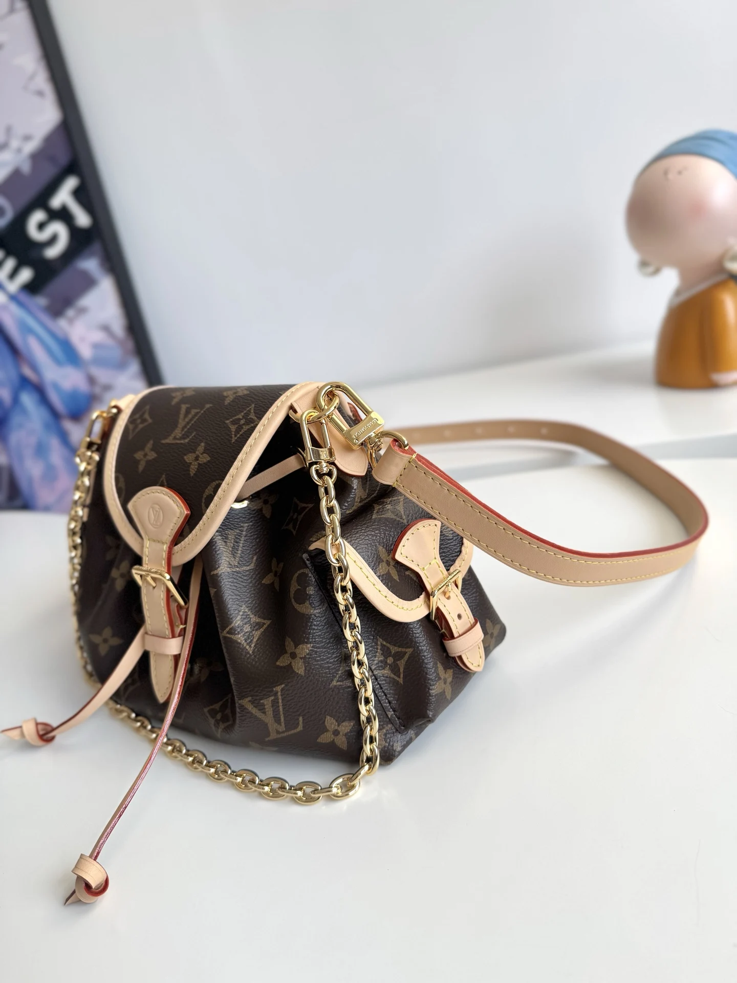 Exclusive real shot of overseas original M25085! The Odysee handbag is from the early autumn 2025 collection, paying tribute to the brand s heritage with a stylish everyday design. The eye-catching clasp and detachable chain brighten up the Monogram canvas body, while the side pocket conveniently holds keys, lipsticks, and other small essentials. Dimensions: 27×17×12cm