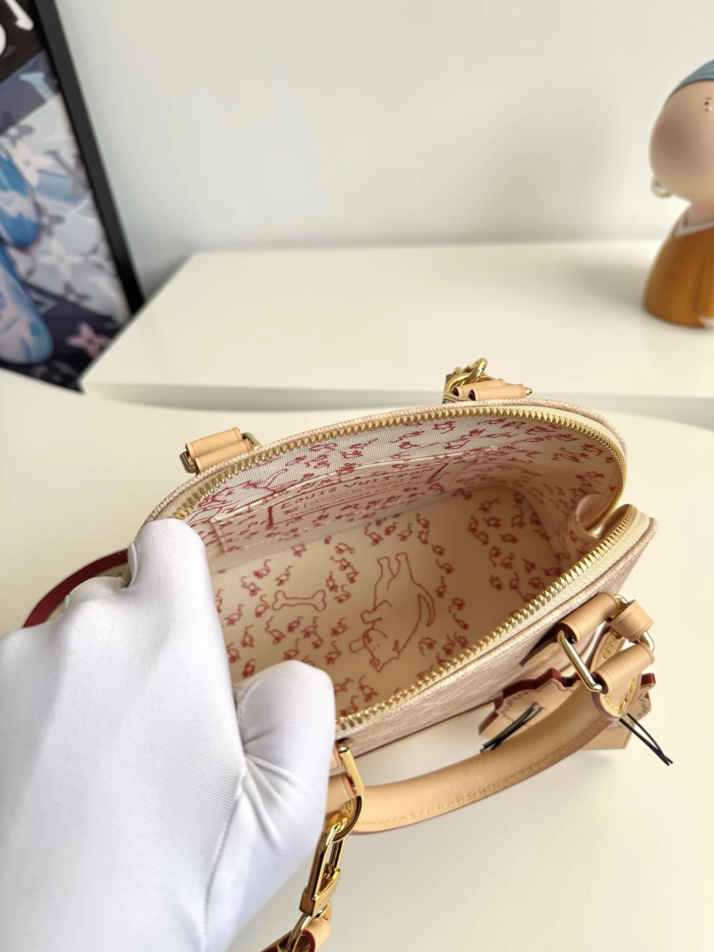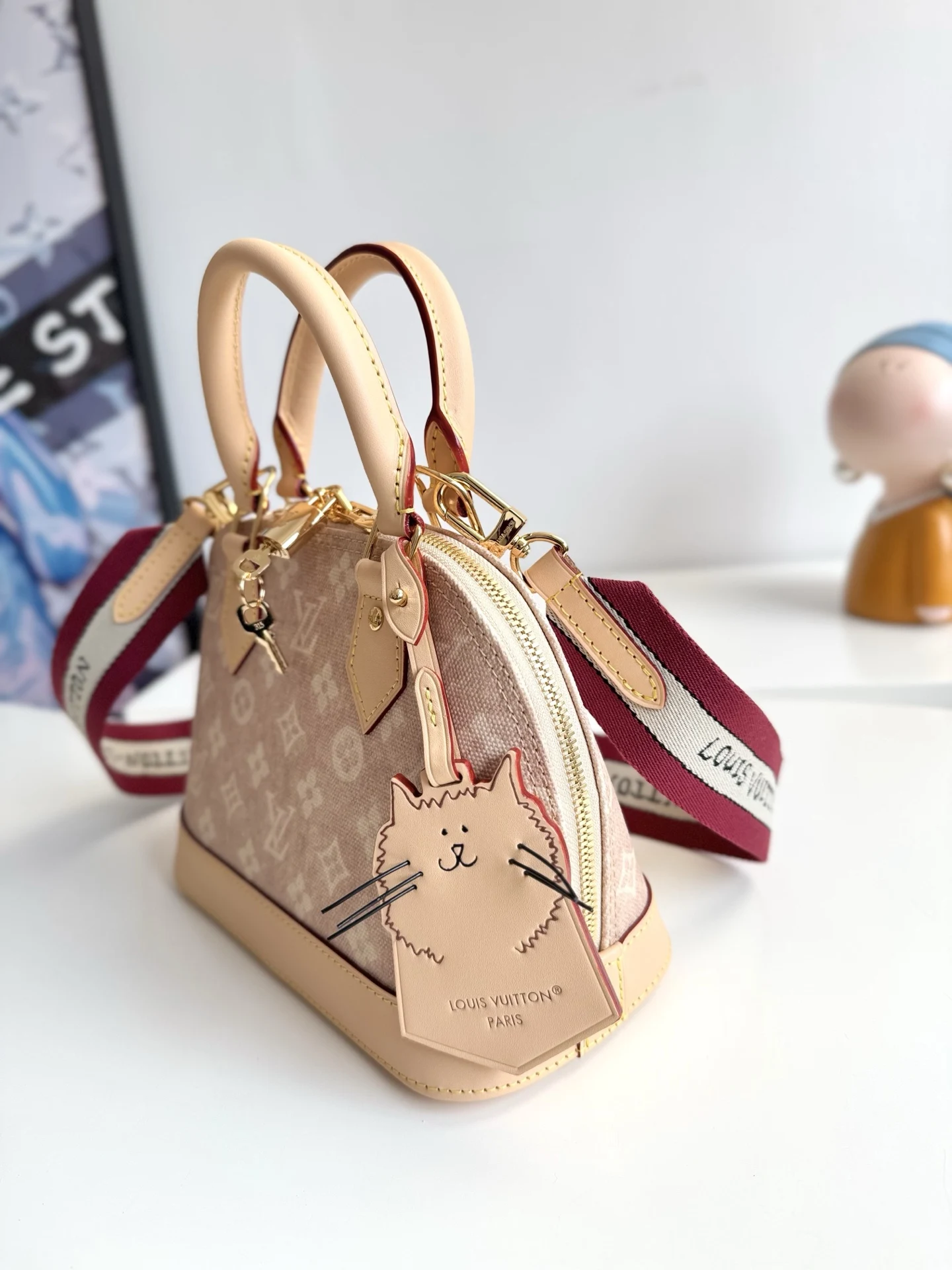 Exclusive real shot of overseas original M25728! This Alma BB handbag is part of the Travels With Grace Coddington collection launched in collaboration with Louis Vuitton and Grace Coddington, focusing on the whimsical Meowgram pattern. The canvas body is complemented by leather trim, and the fabric shoulder strap features the Louis Vuitton name in Coddington s handwriting. The exquisite padlock and key pouch further attest to the brand s superb craftsmanship. Dimensions: 23.5×17.5×11.5cm