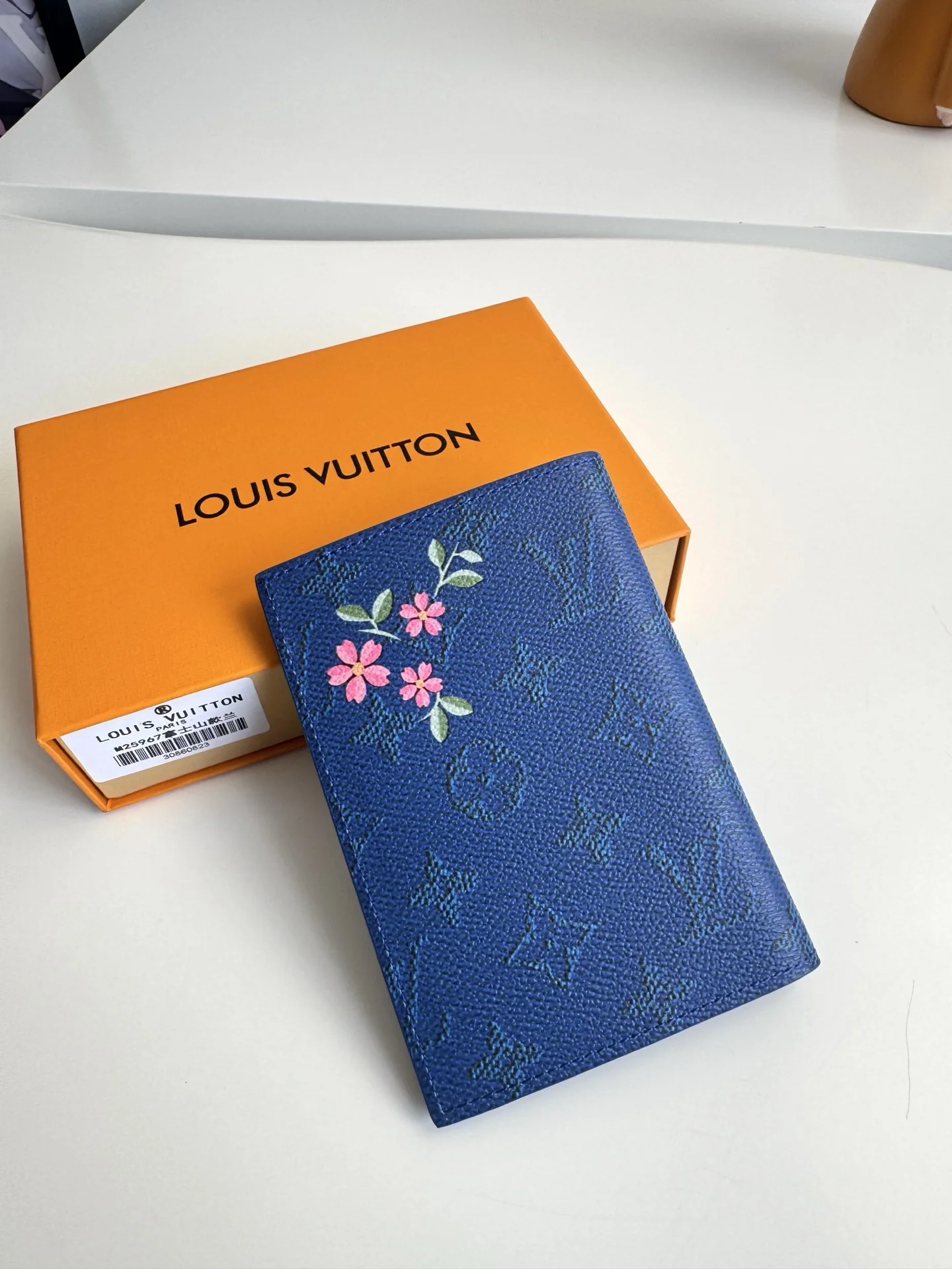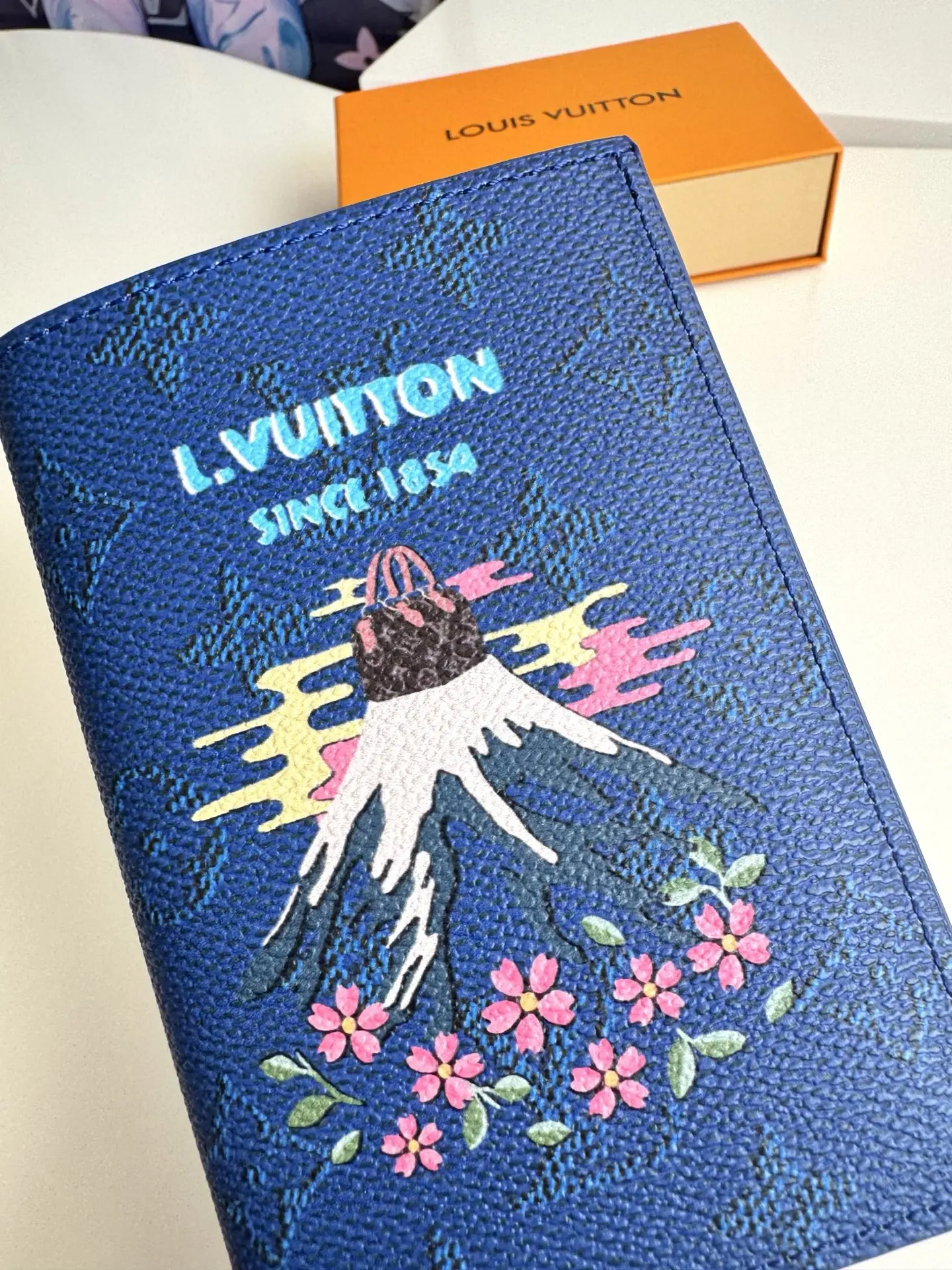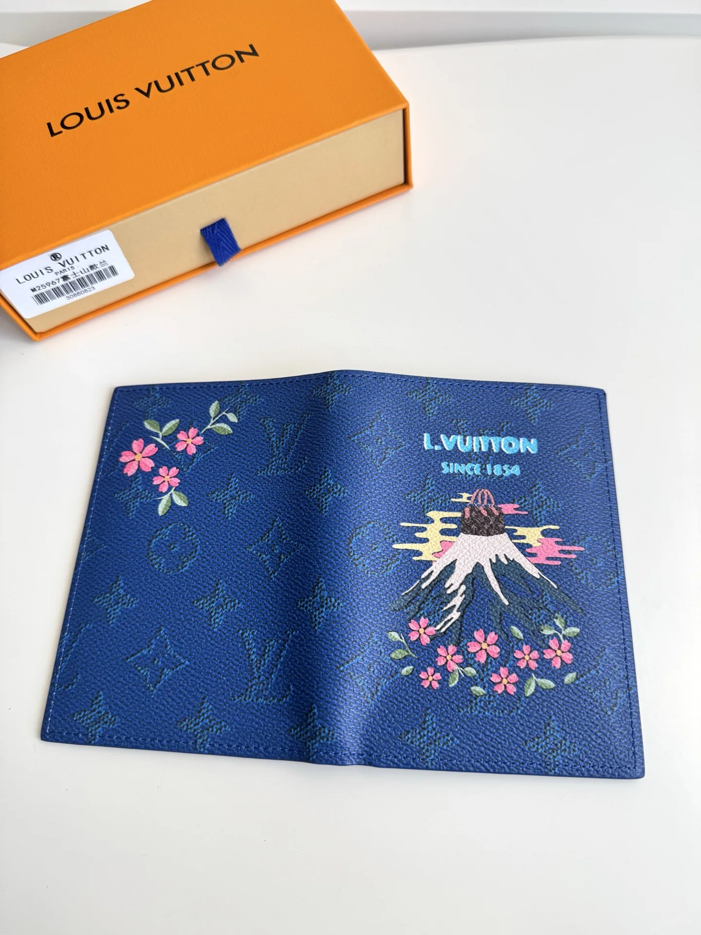 Overseas original M25967 Fuji blue exclusive real shot! This passport cover features a vibrant Japanese print on Monogram canvas. It has multiple card slots and ticket pockets inside. Size: 14×10×2.5cm