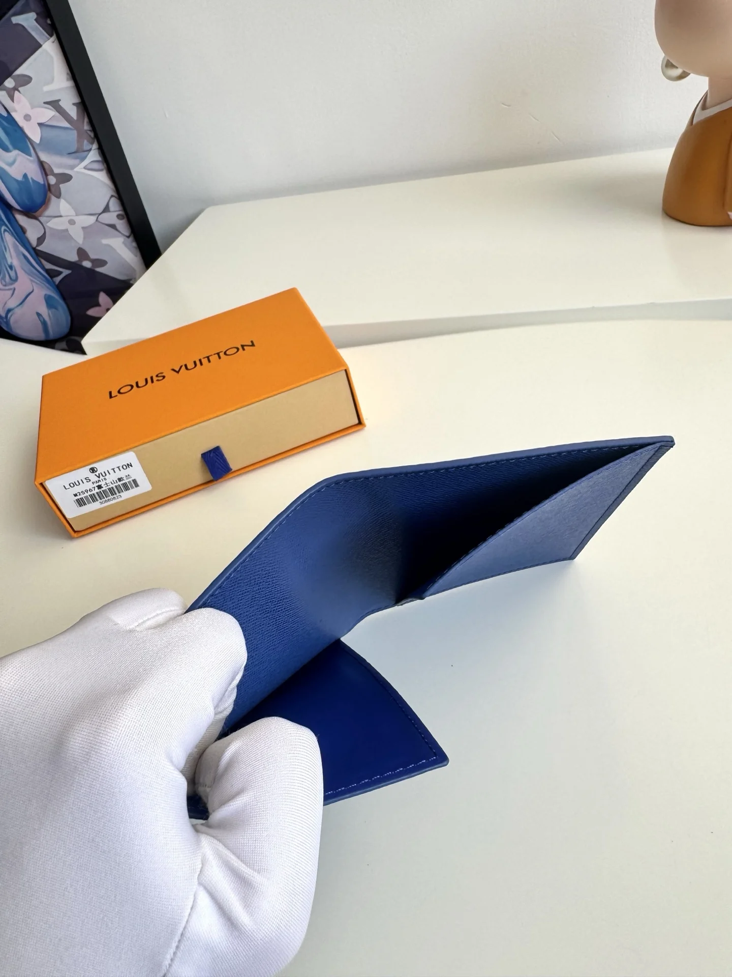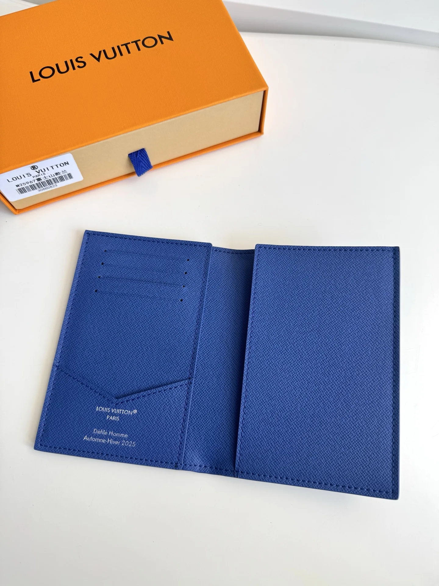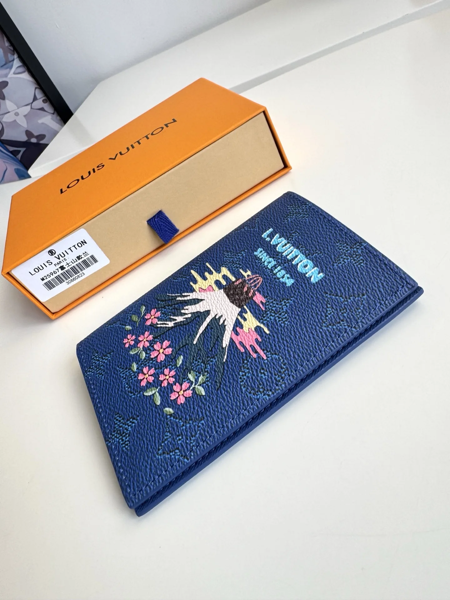 Overseas original M25967 Fuji blue exclusive real shot! This passport cover features a vibrant Japanese print on Monogram canvas. It has multiple card slots and ticket pockets inside. Size: 14×10×2.5cm