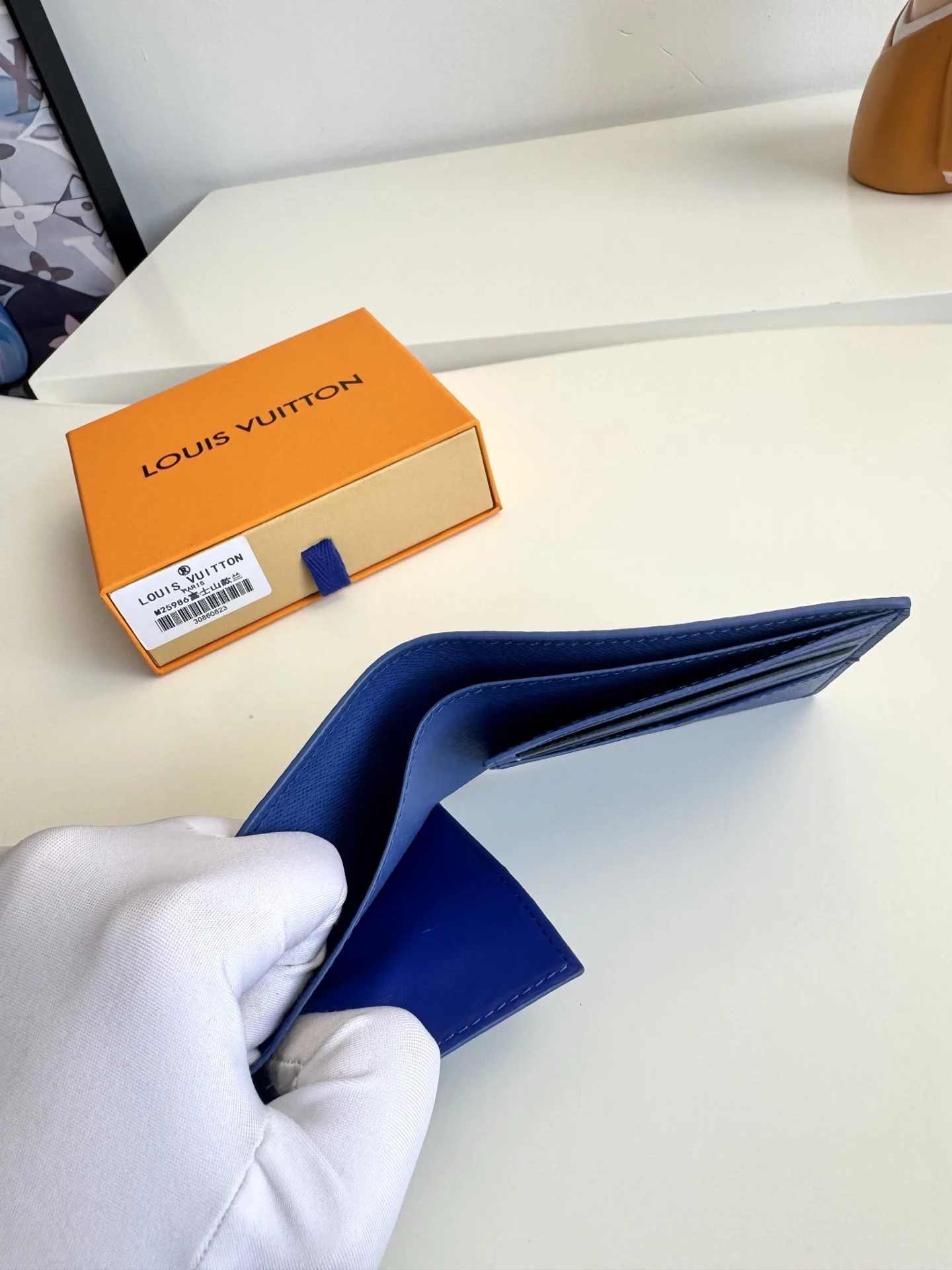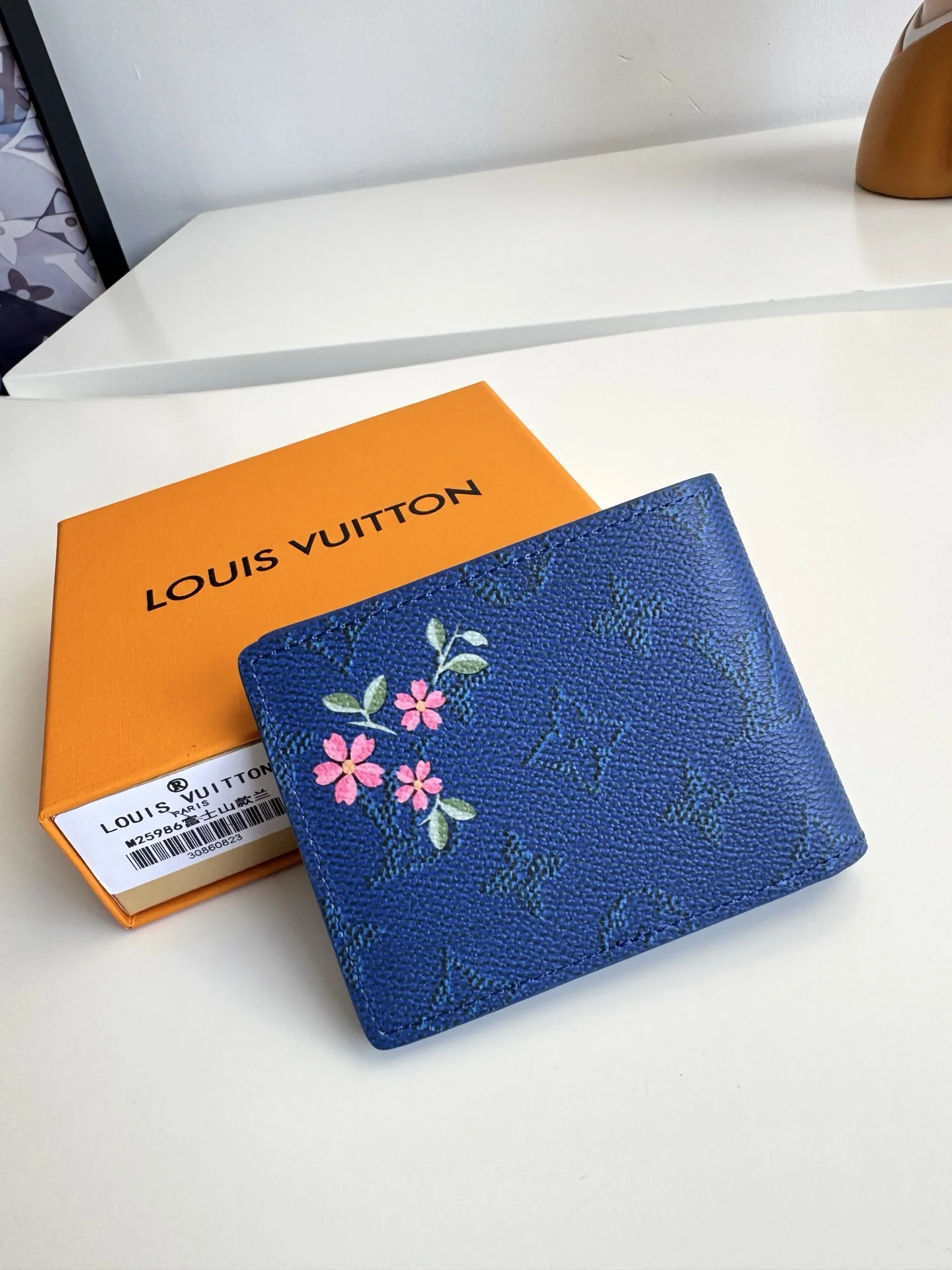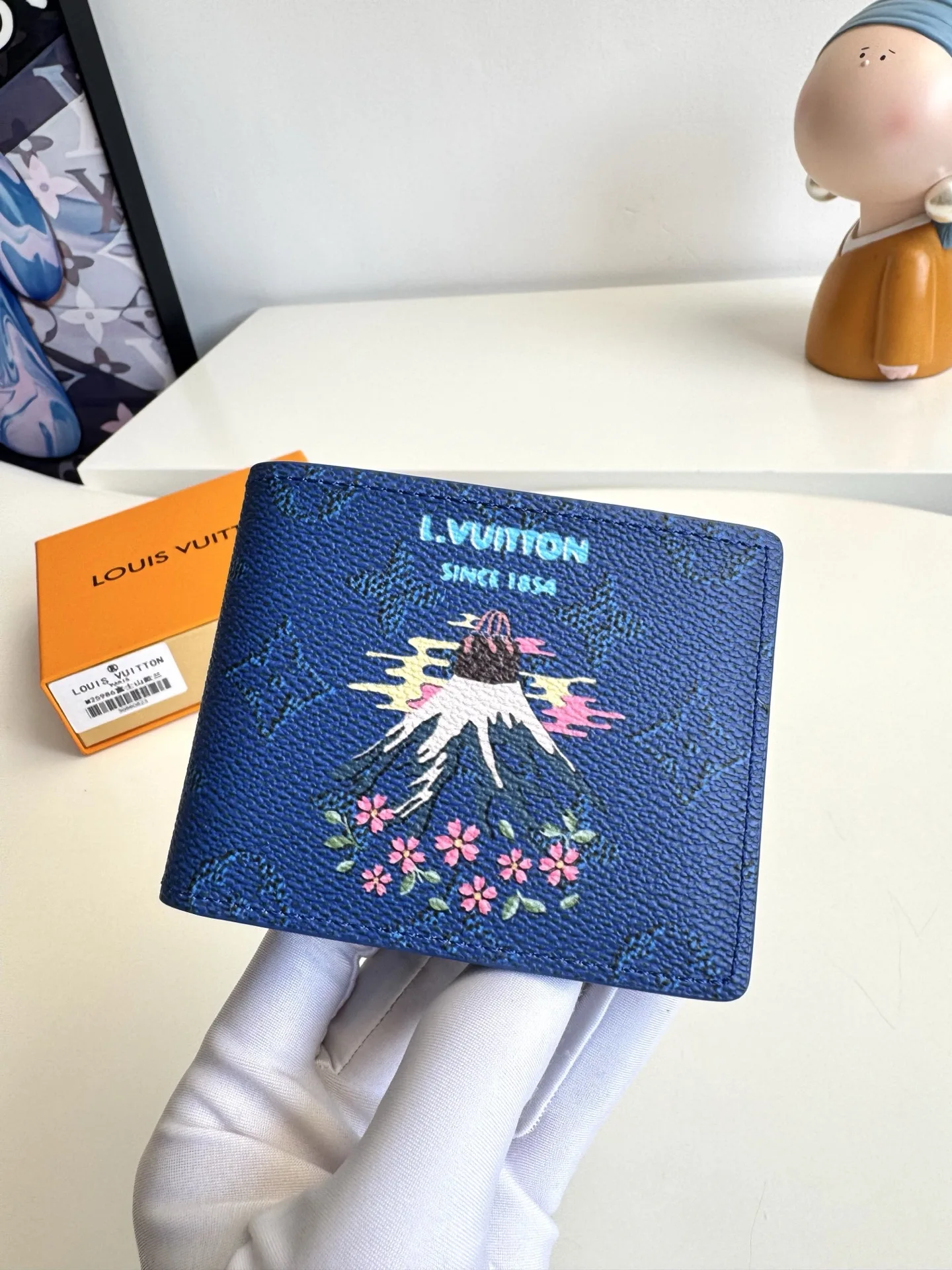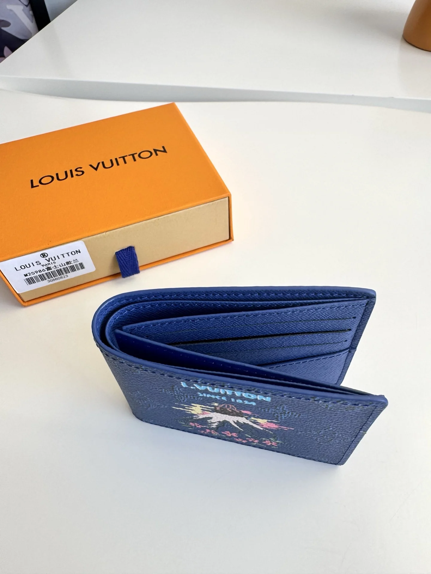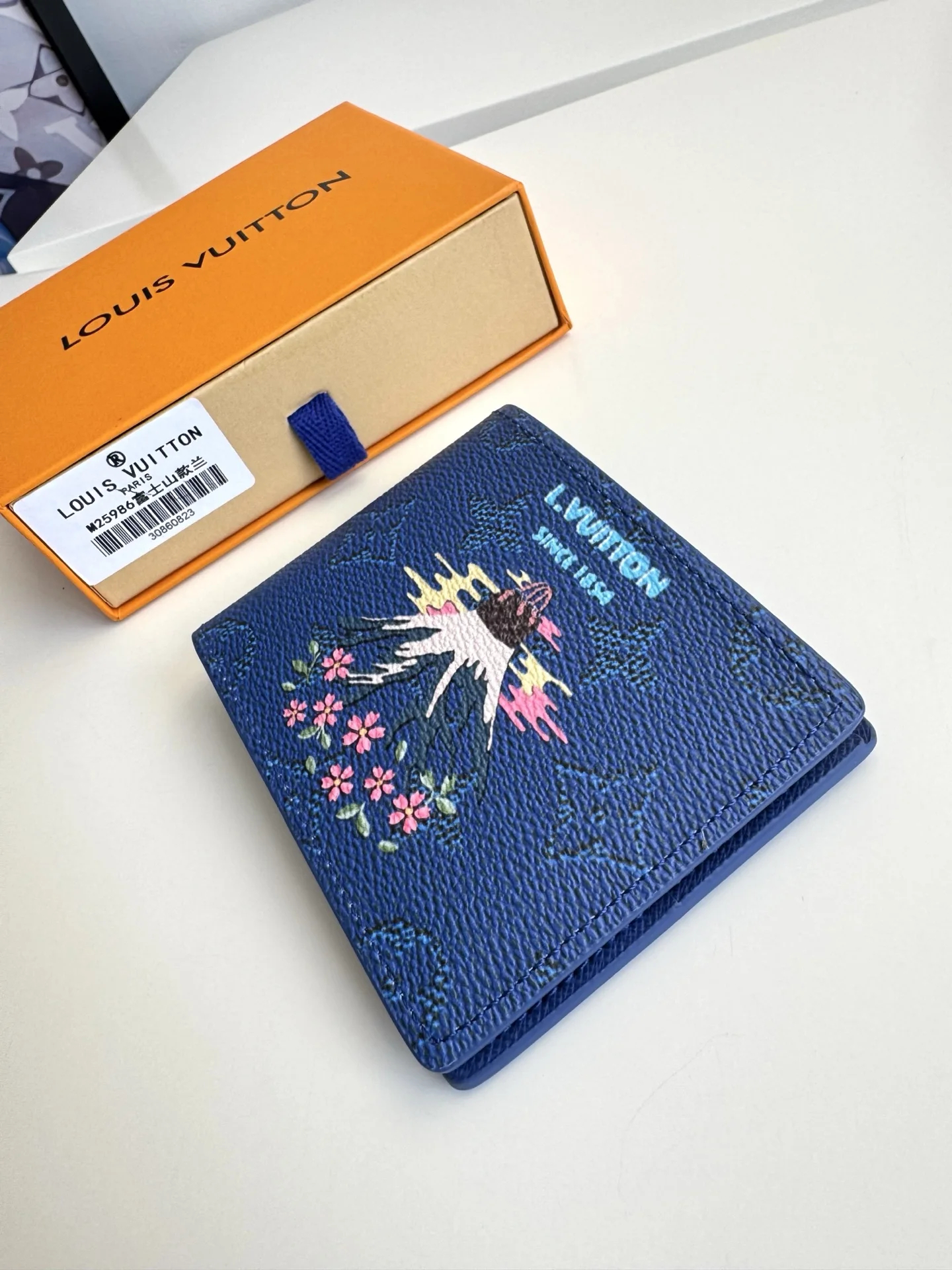 Original overseas order M25986 Fuji blue exclusive real shot! This Slender wallet is crafted from Monogram coated canvas and features a vibrant Japanese print. The ingenious design includes multiple card slots and bill compartments. Dimensions: 11×8.5×2cm