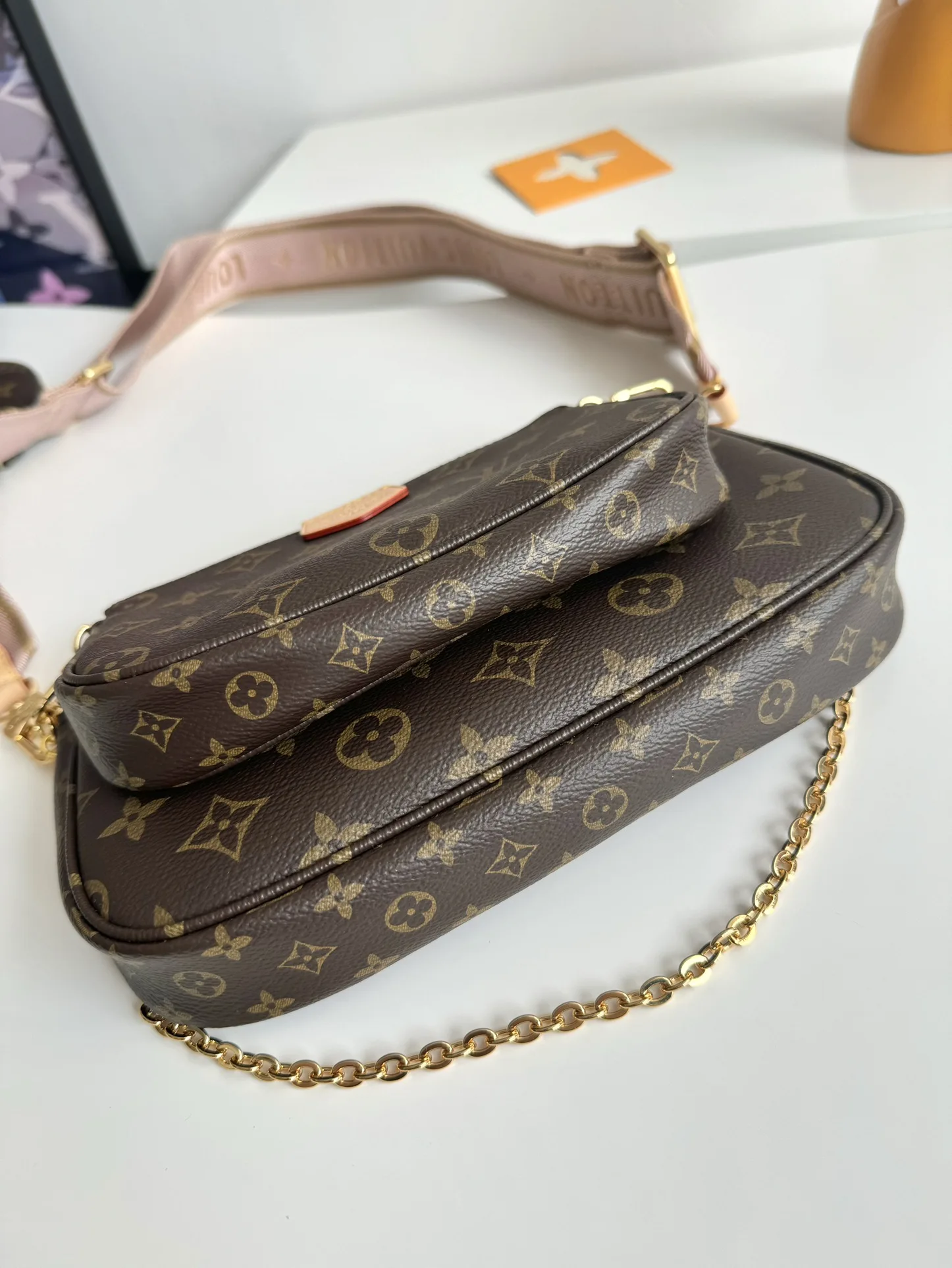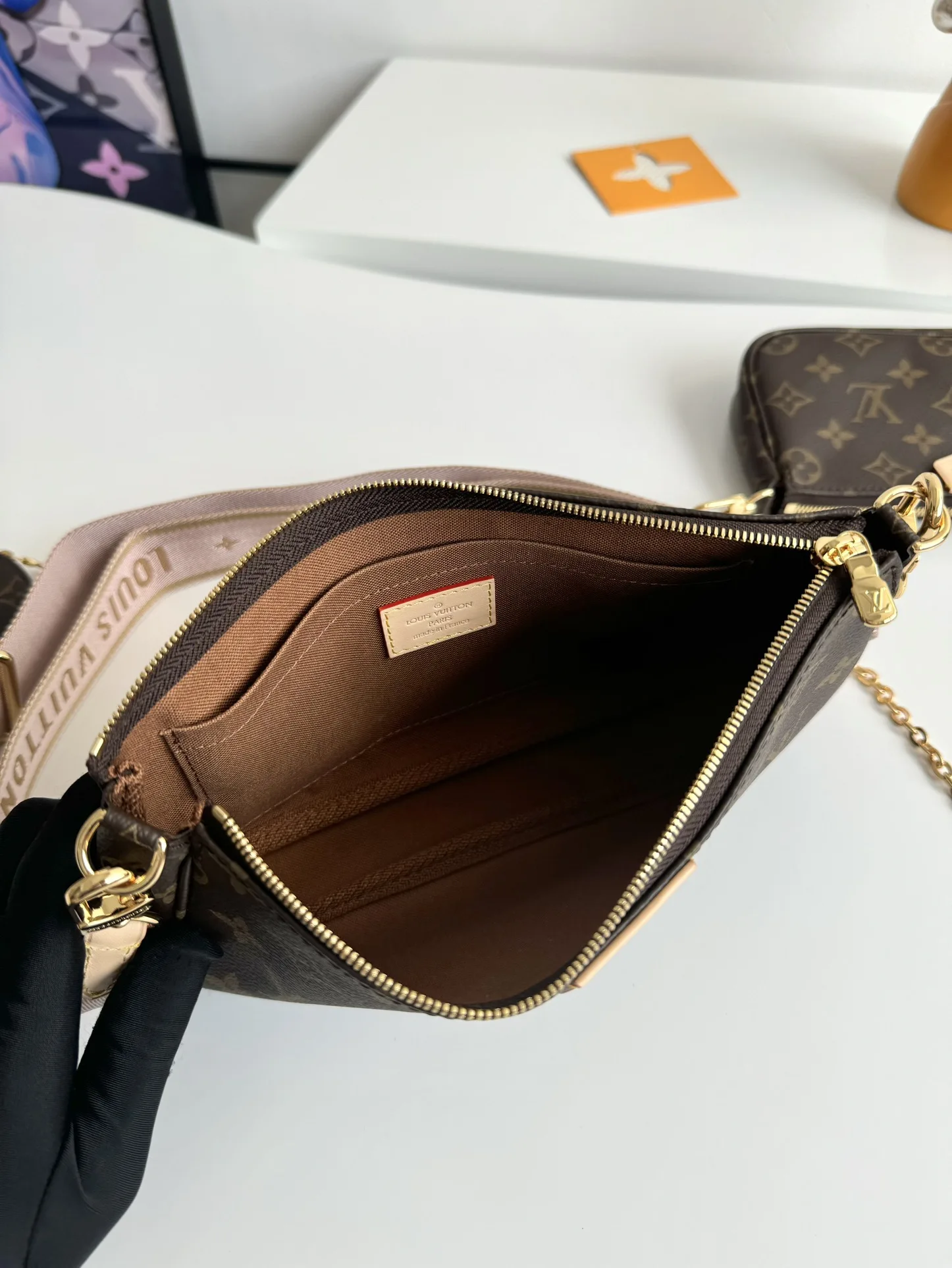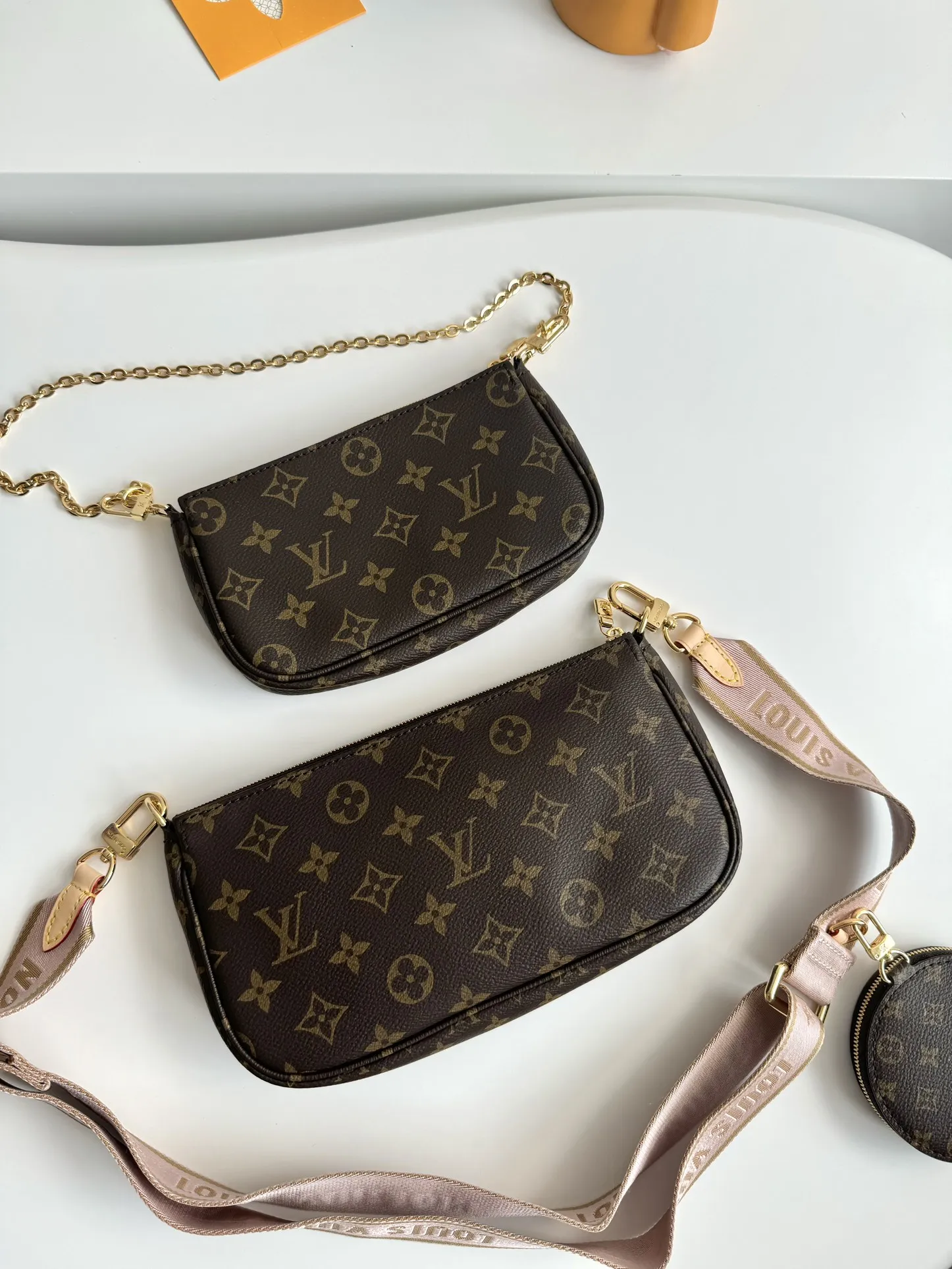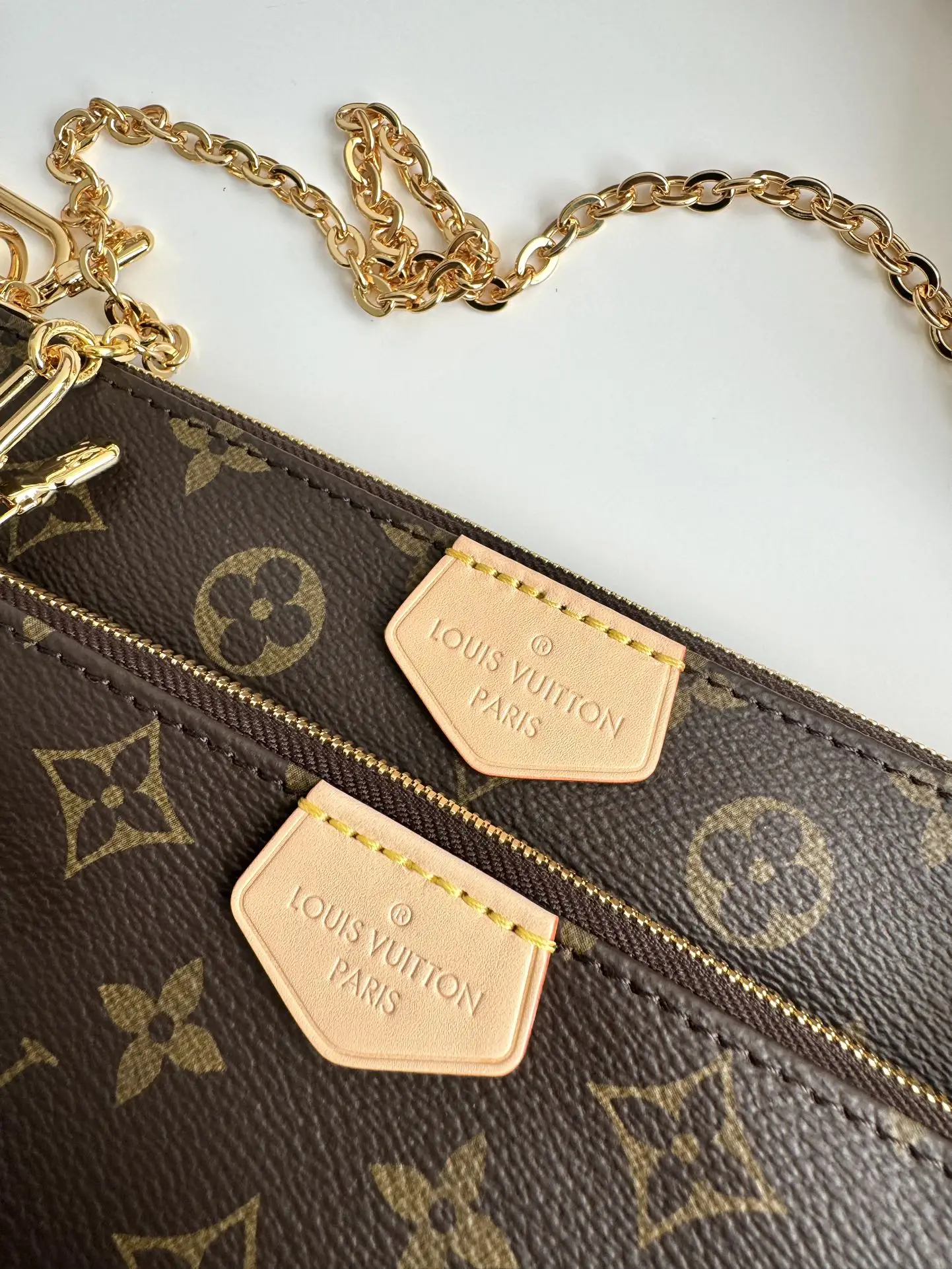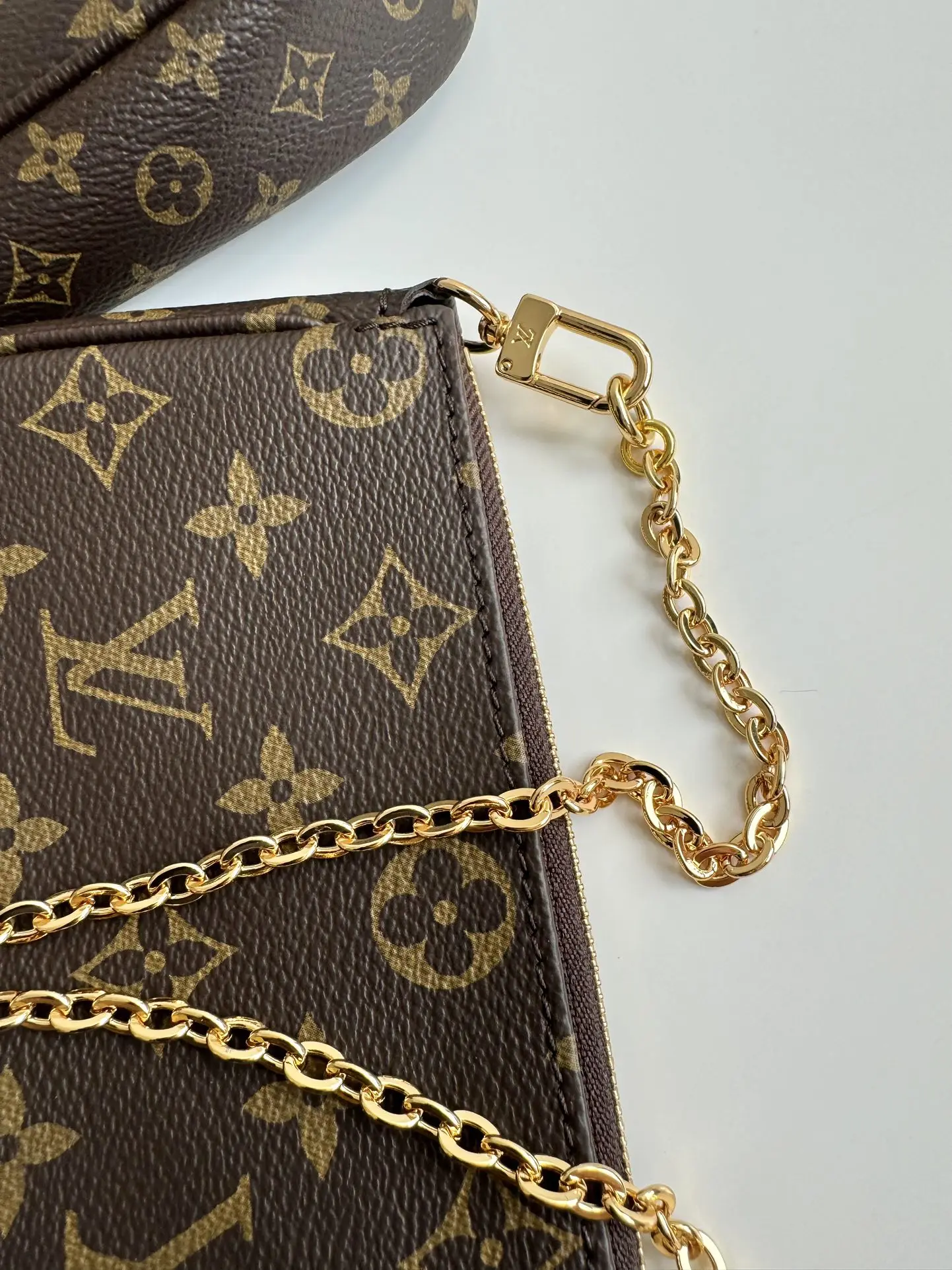 Exclusive real shots of overseas original M44840! The Multi Pochette Accessories handbag features a vibrant three-in-one design in Monogram canvas, with multiple pockets and compartments. An adjustable gold-tone chain and Louis Vuitton-engraved jacquard strap offer multiple carry options, including cross-body wear. Dimensions: 24 × 16 × 6 cm