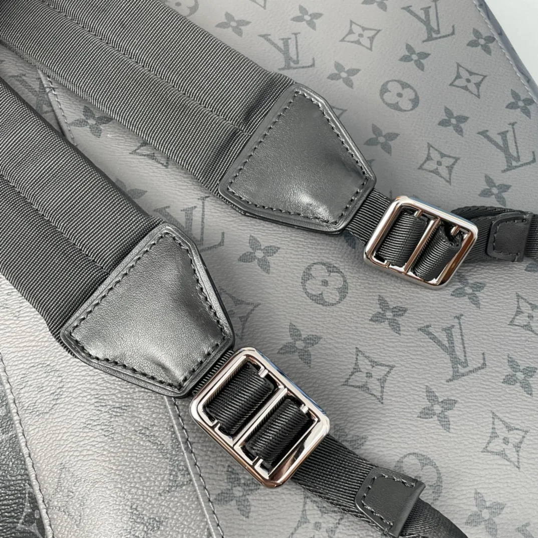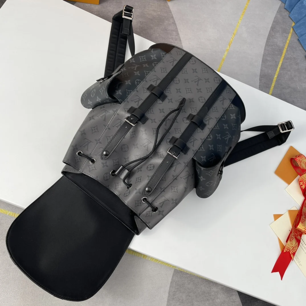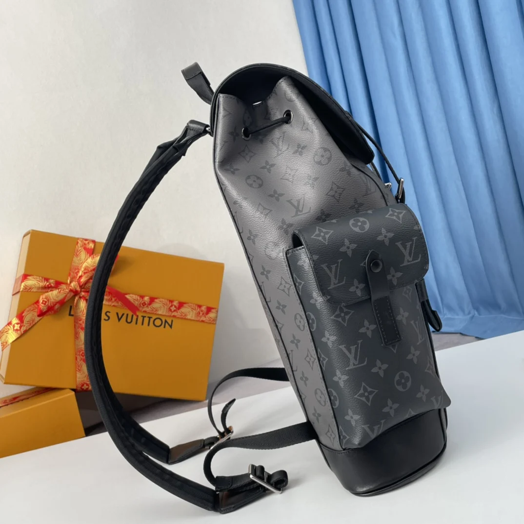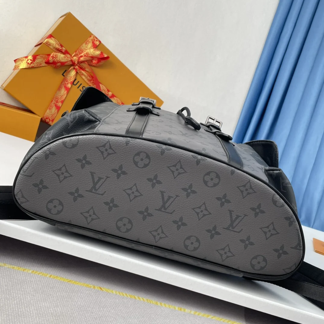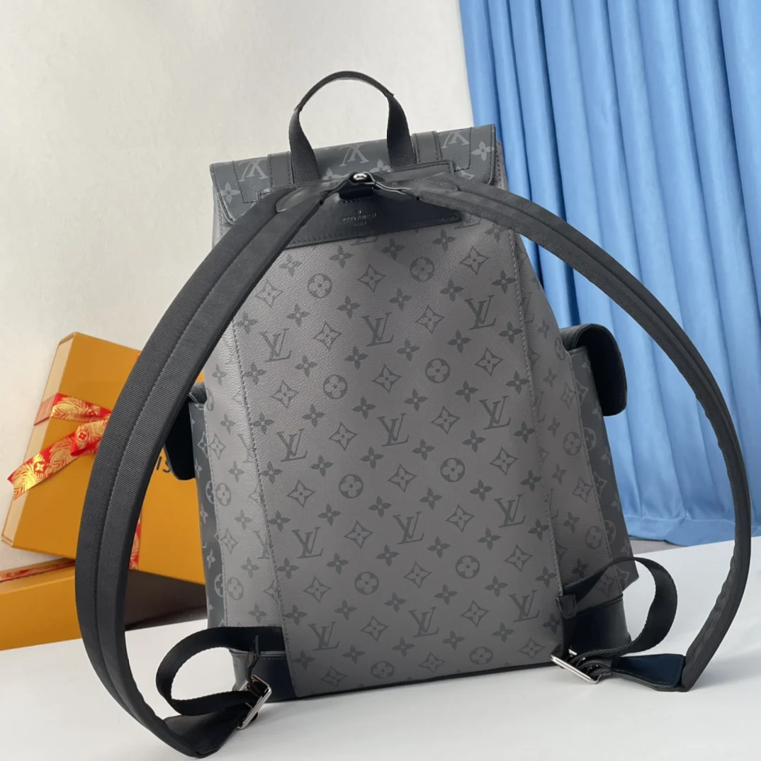 Exclusive real shots of overseas original M45419! The Christopher Small Backpack is made of masculine Monogram Eclipse canvas and Monogram Eclipse Reverse canvas, complemented by black leather trim, reinterpreting the spirit of the hiking backpack. Gray and black tones are paired with silver snaps and zippers. It has multiple pockets and a leather flap with a snap to ensure the safety of the contents. Size: 38×44×21cm