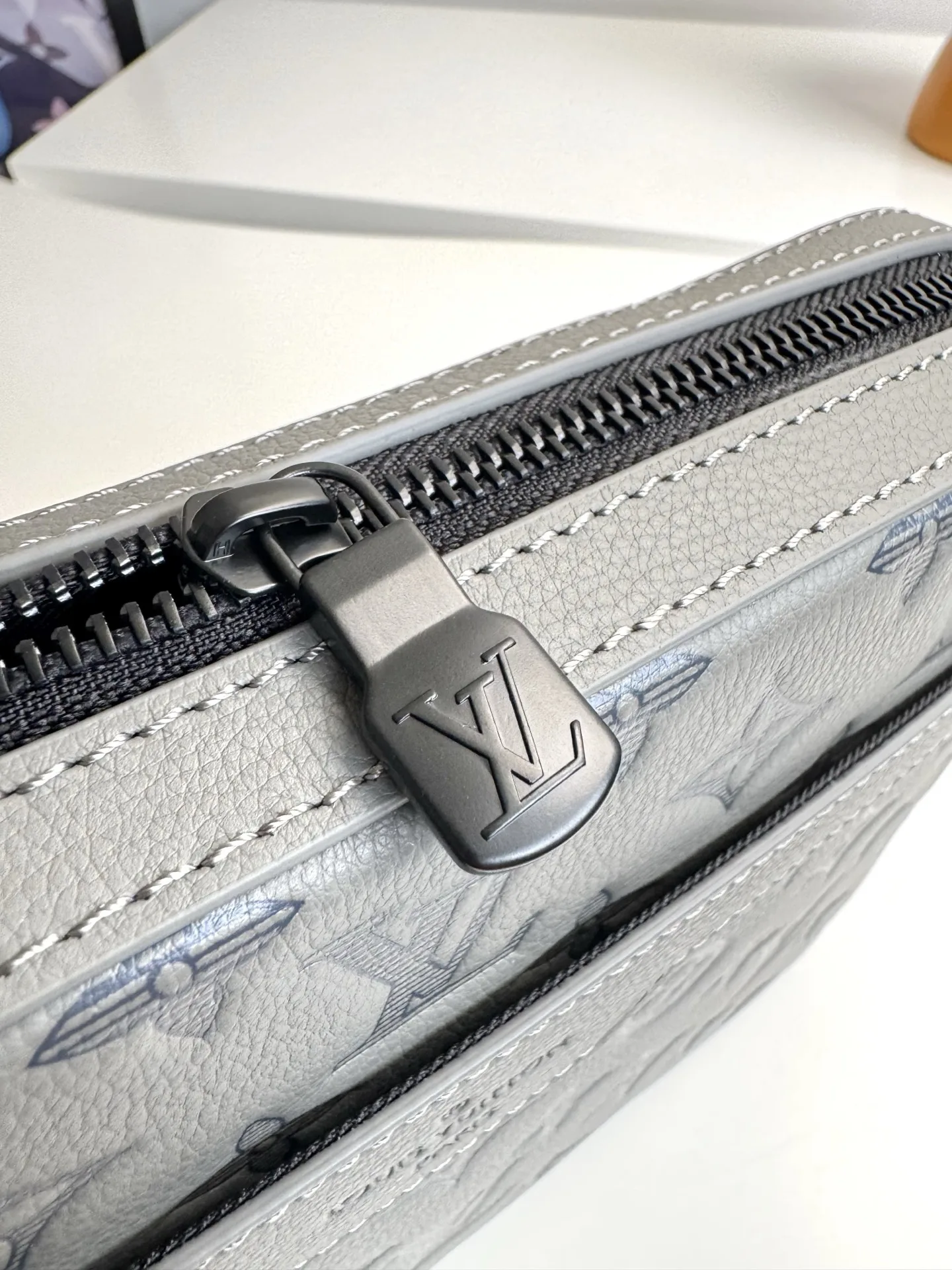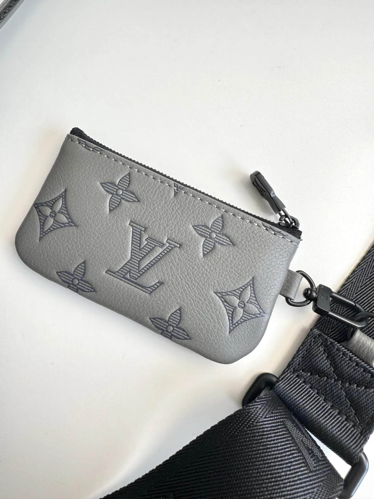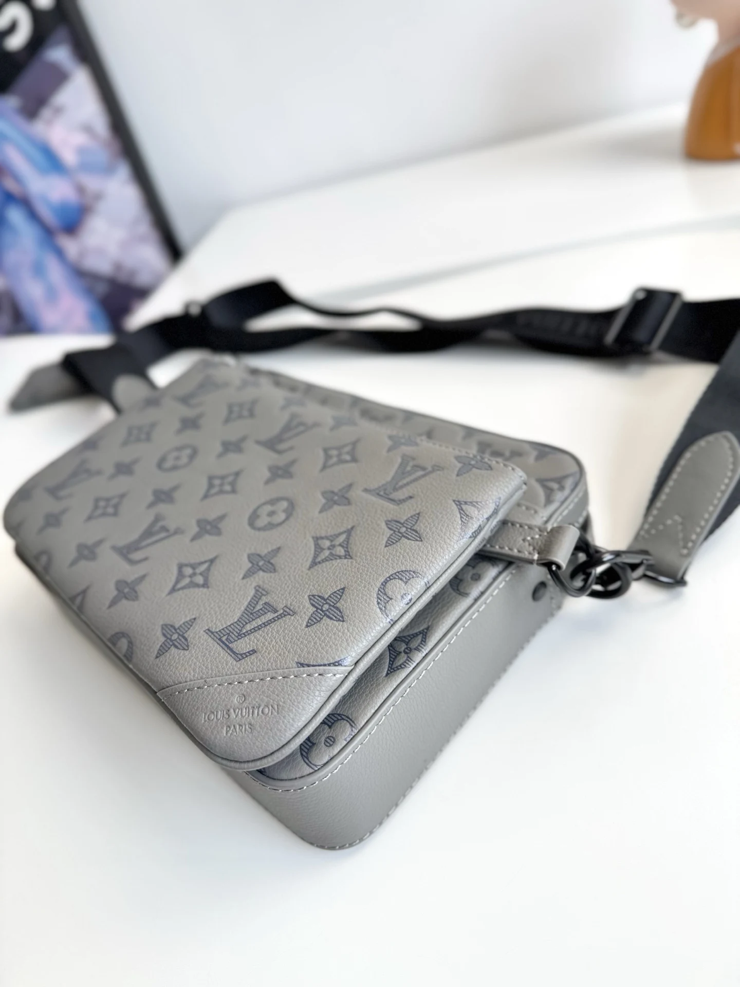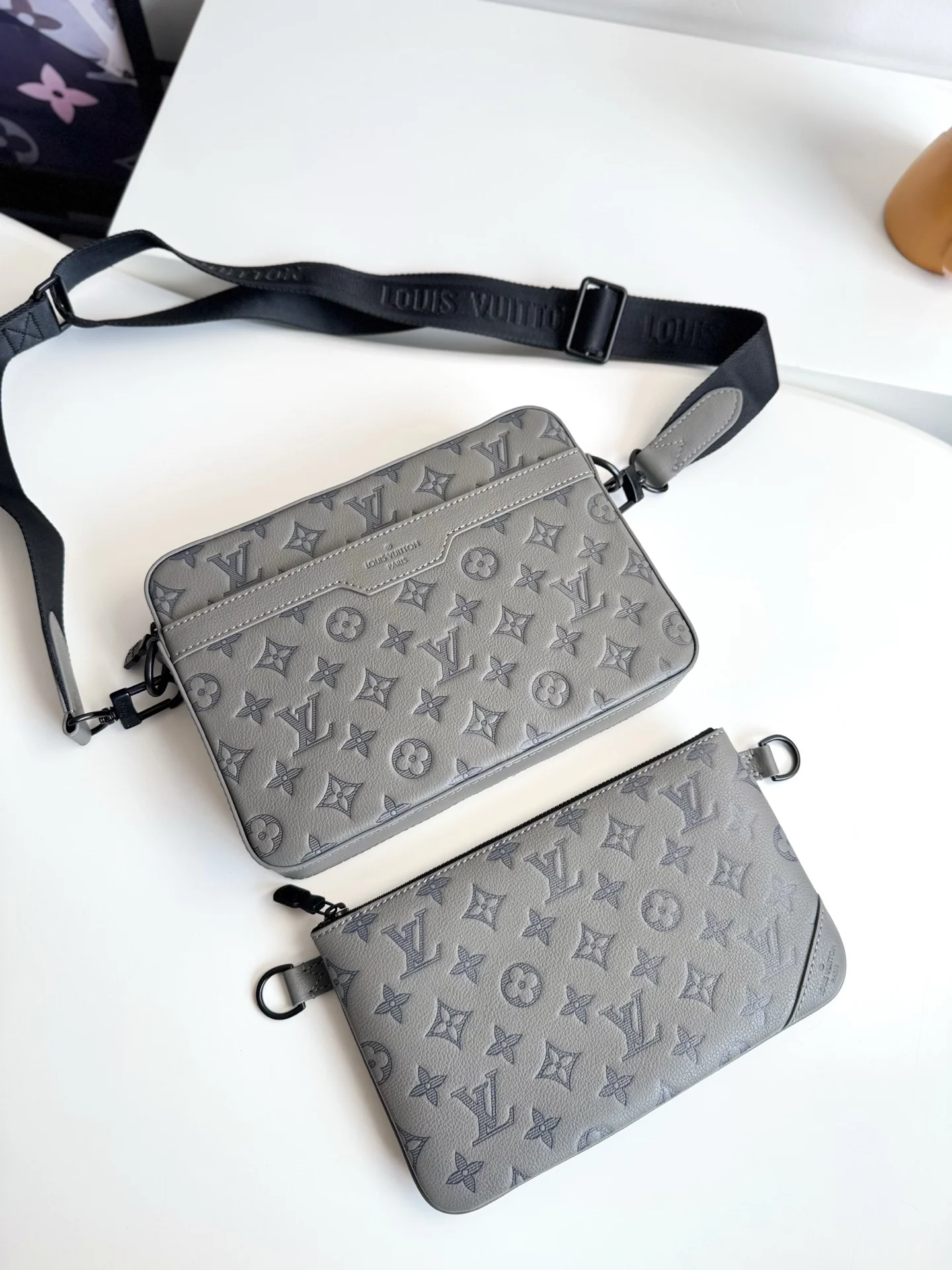 Exclusive live photos of the overseas original M46603! This Trio messenger bag is made from Monogram embossed cowhide leather, featuring a zippered front pocket and a small de..