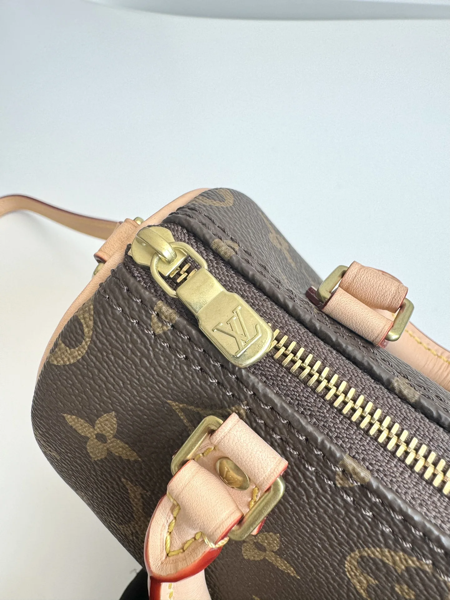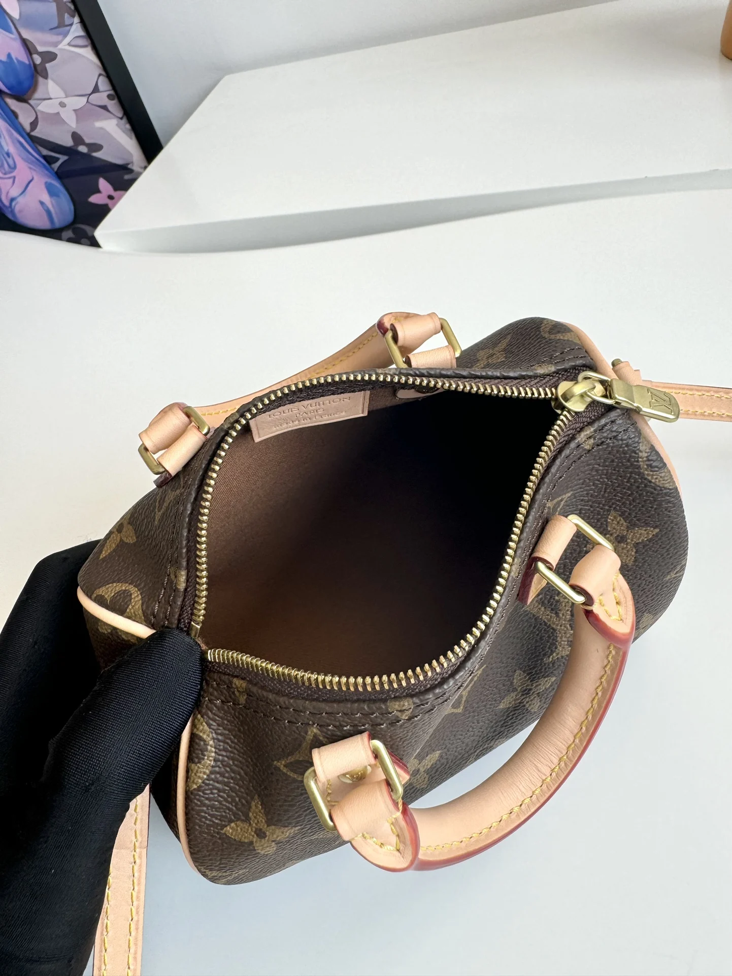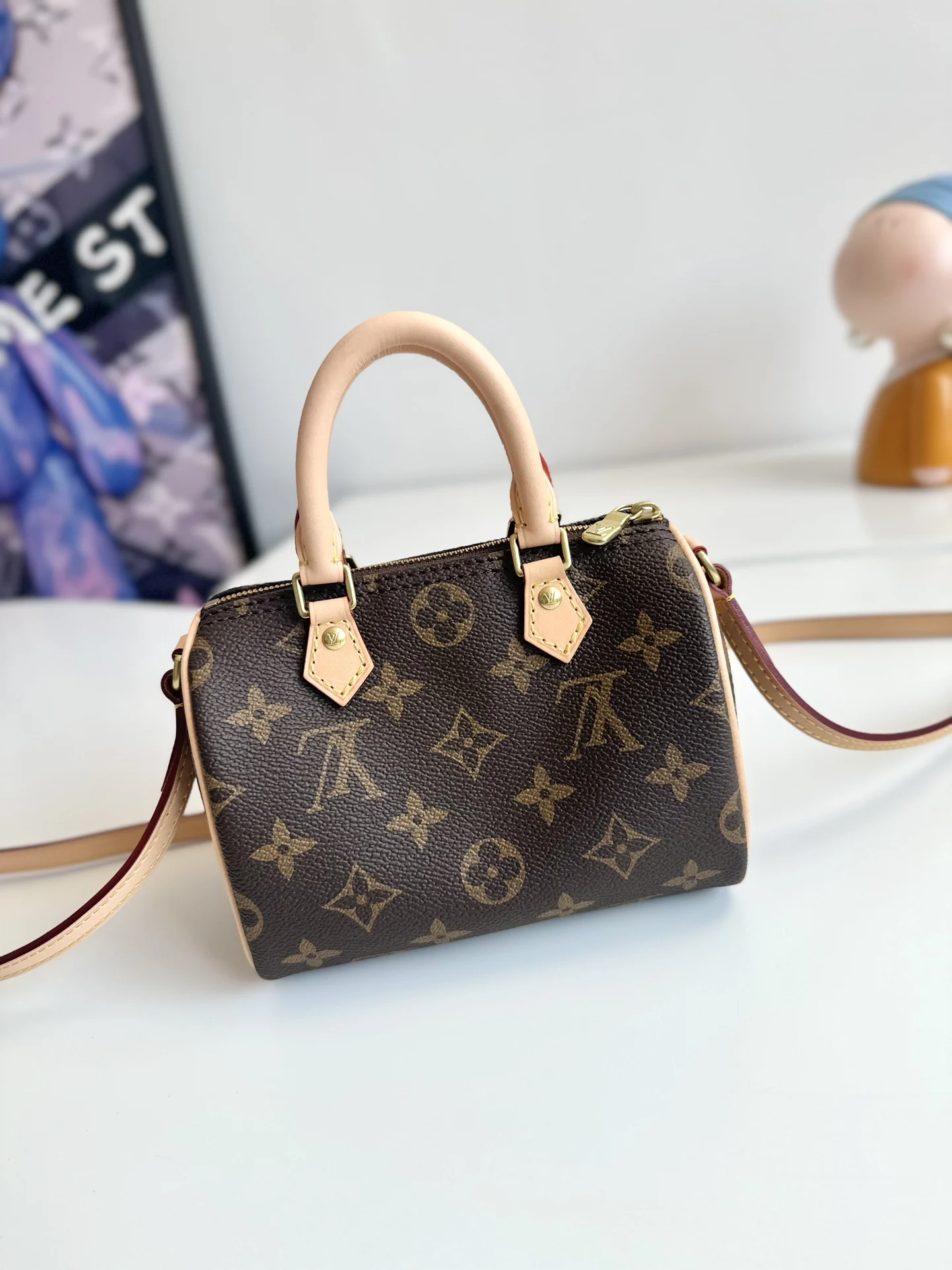 Exclusive real shot of the overseas original M61252! The Nano Speedy handbag made of classic Monogram canvas exudes ultimate femininity and is the ideal choice for carrying daily essentials. This handbag is the perfect mini version of the prototype Speedy handbag, featuring exquisite stitching and an incredibly lightweight design, easily accommodating your smartphone, credit cards, and keys. Dimensions: 16×12.5×10cm