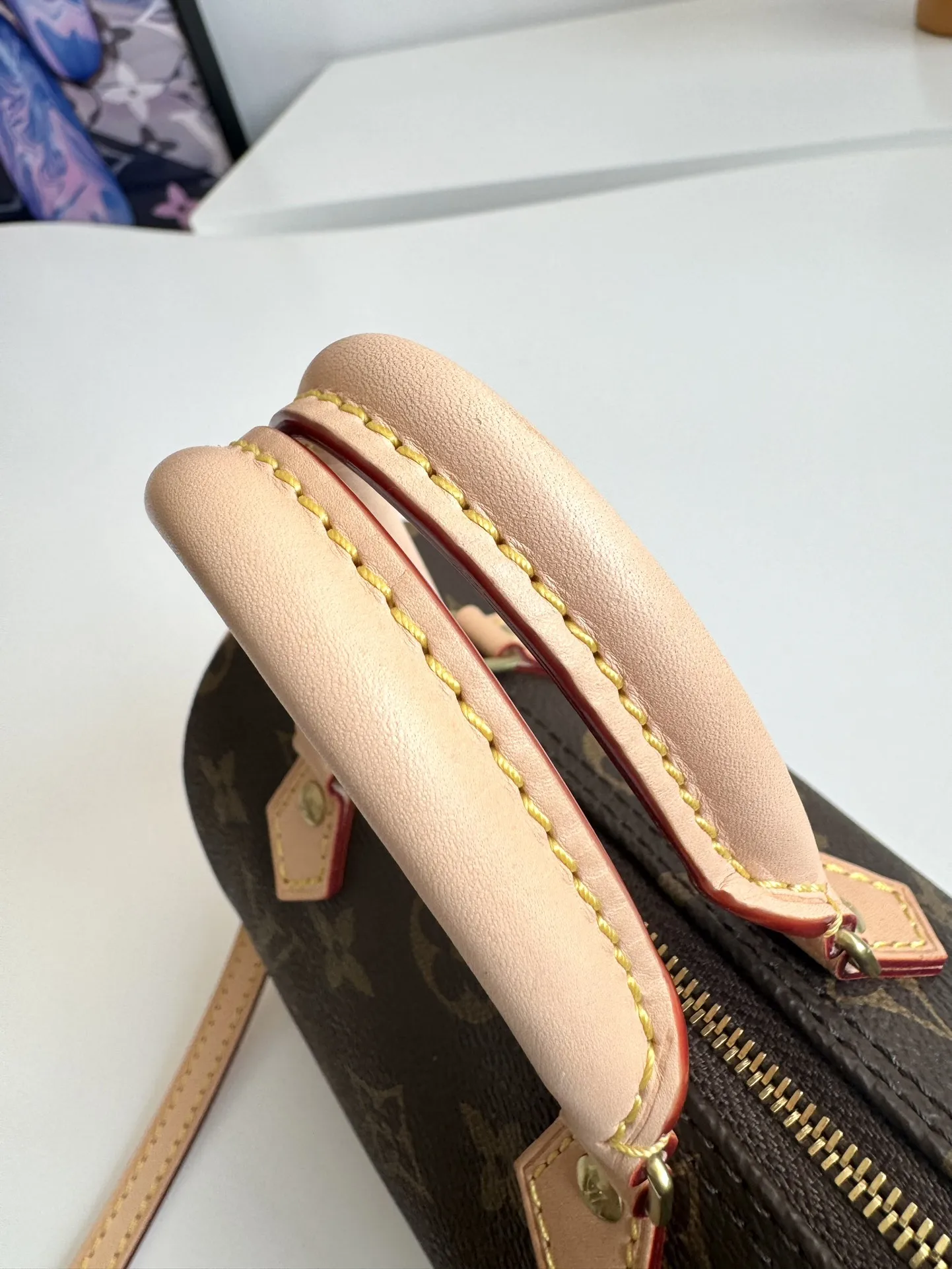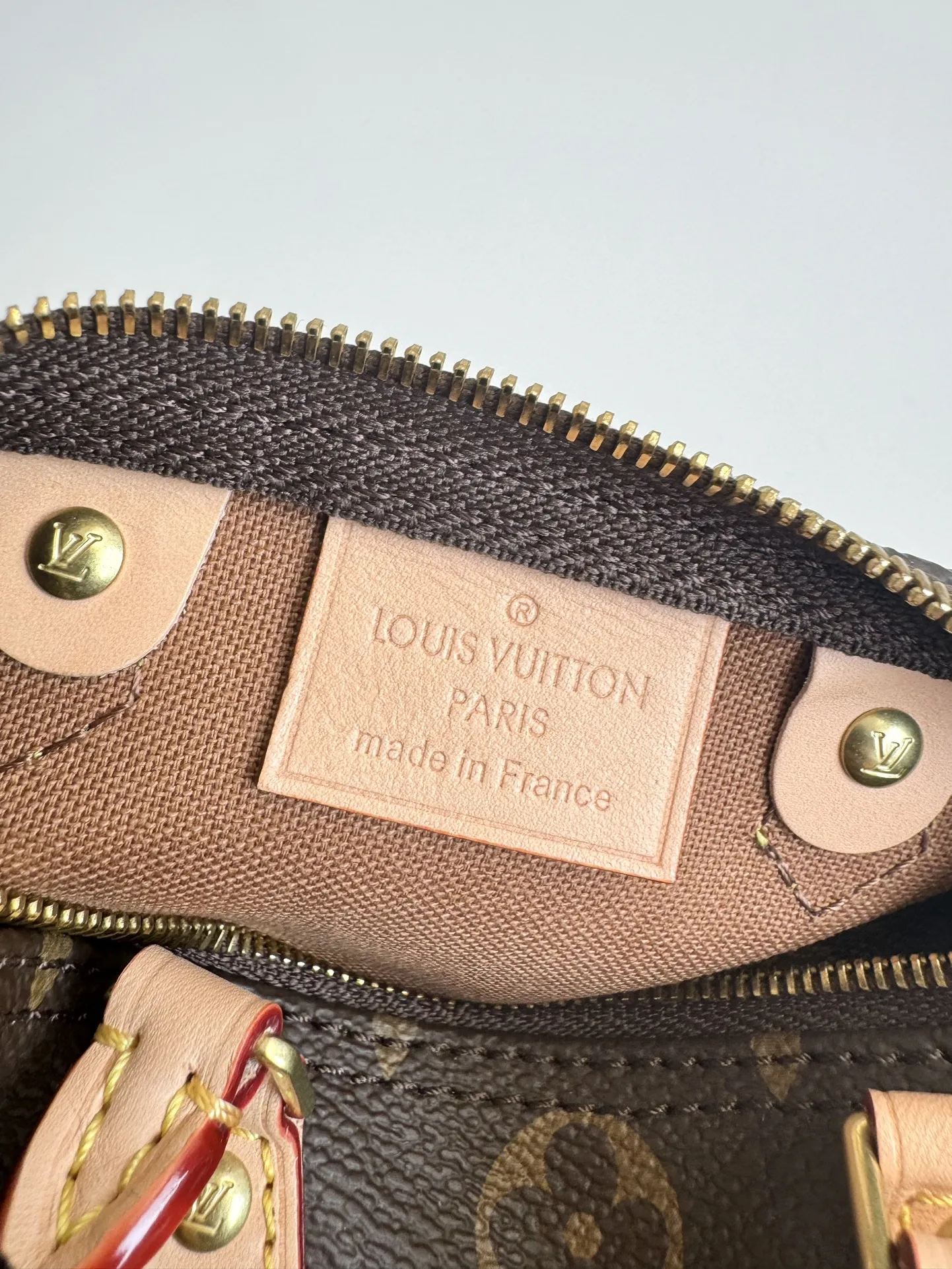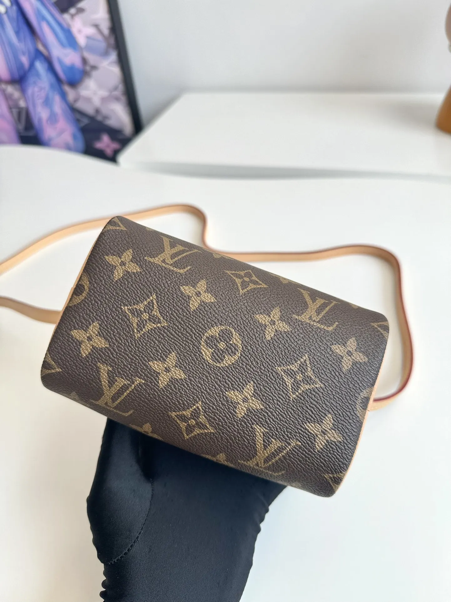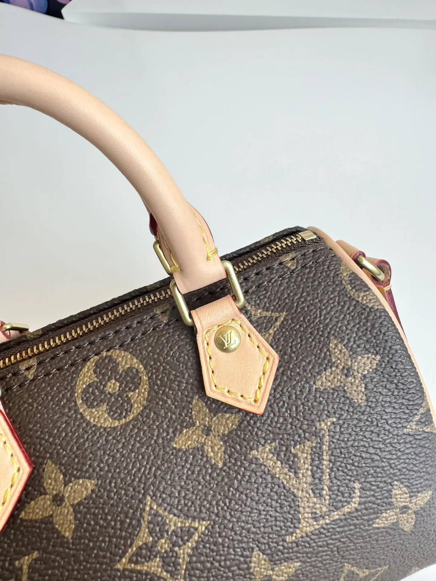 Exclusive real shot of the overseas original M61252! The Nano Speedy handbag made of classic Monogram canvas exudes ultimate femininity and is the ideal choice for carrying daily essentials. This handbag is the perfect mini version of the prototype Speedy handbag, featuring exquisite stitching and an incredibly lightweight design, easily accommodating your smartphone, credit cards, and keys. Dimensions: 16×12.5×10cm