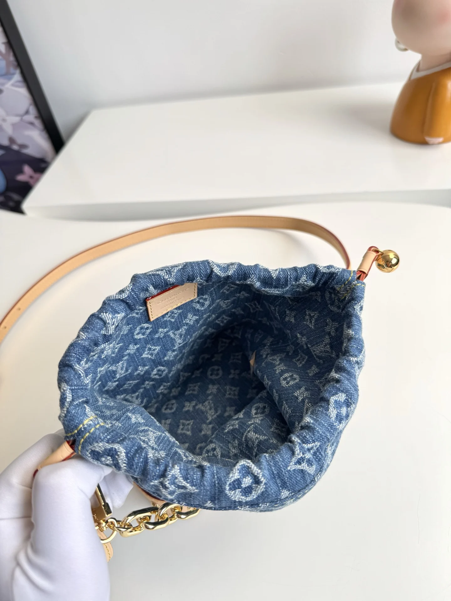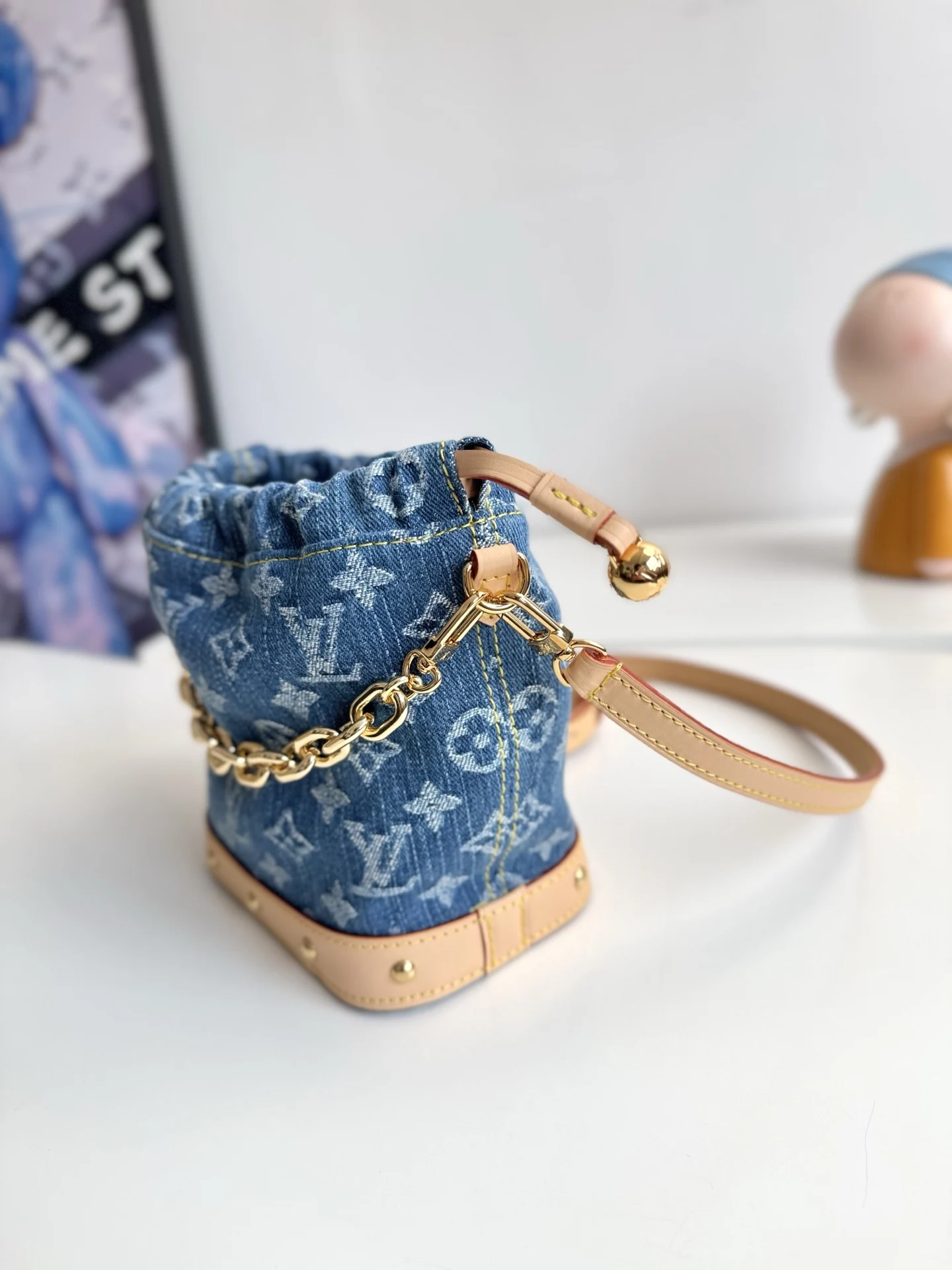Exclusive real shot of the overseas original M83043! This Nano Noe backpack features a cotton fabric rendered in trendy denim tones, layered with the classic Monogram pattern, complemented by leather trims and a dazzling chain. The LV engraved decoration at the drawstring opening adds a playful touch while paying homage to the brand s rich heritage. Dimensions: 20.5×17.5×8.8cm