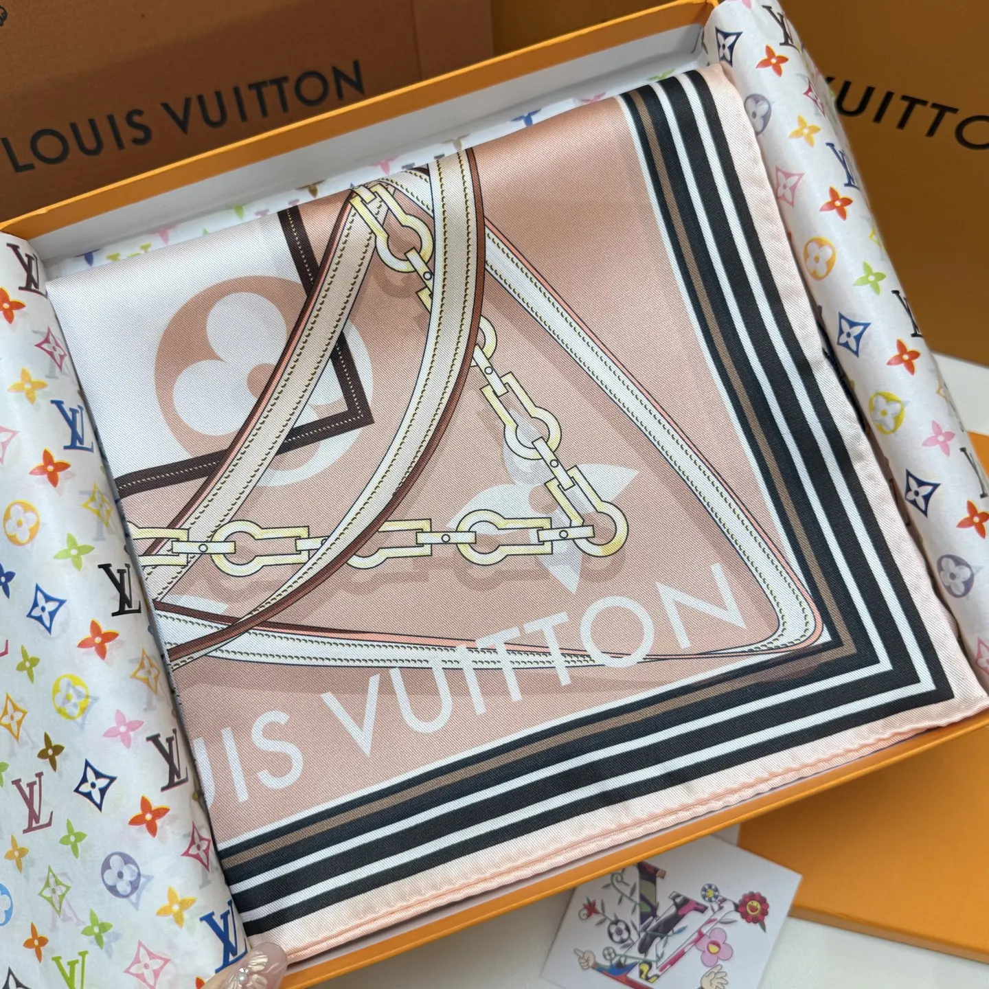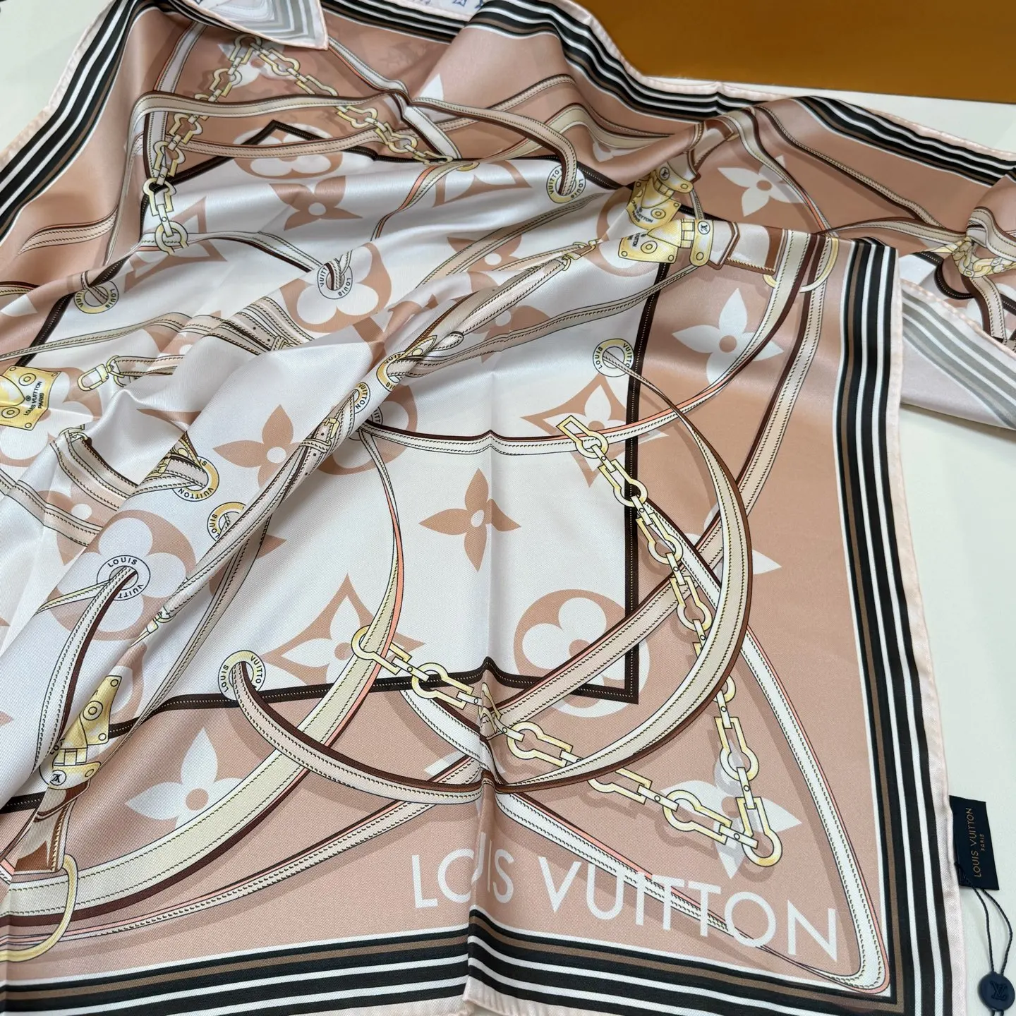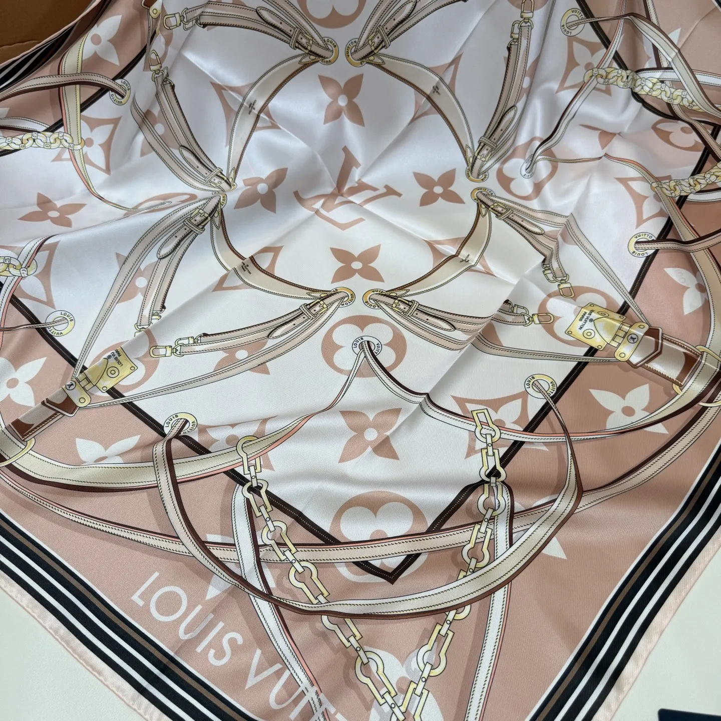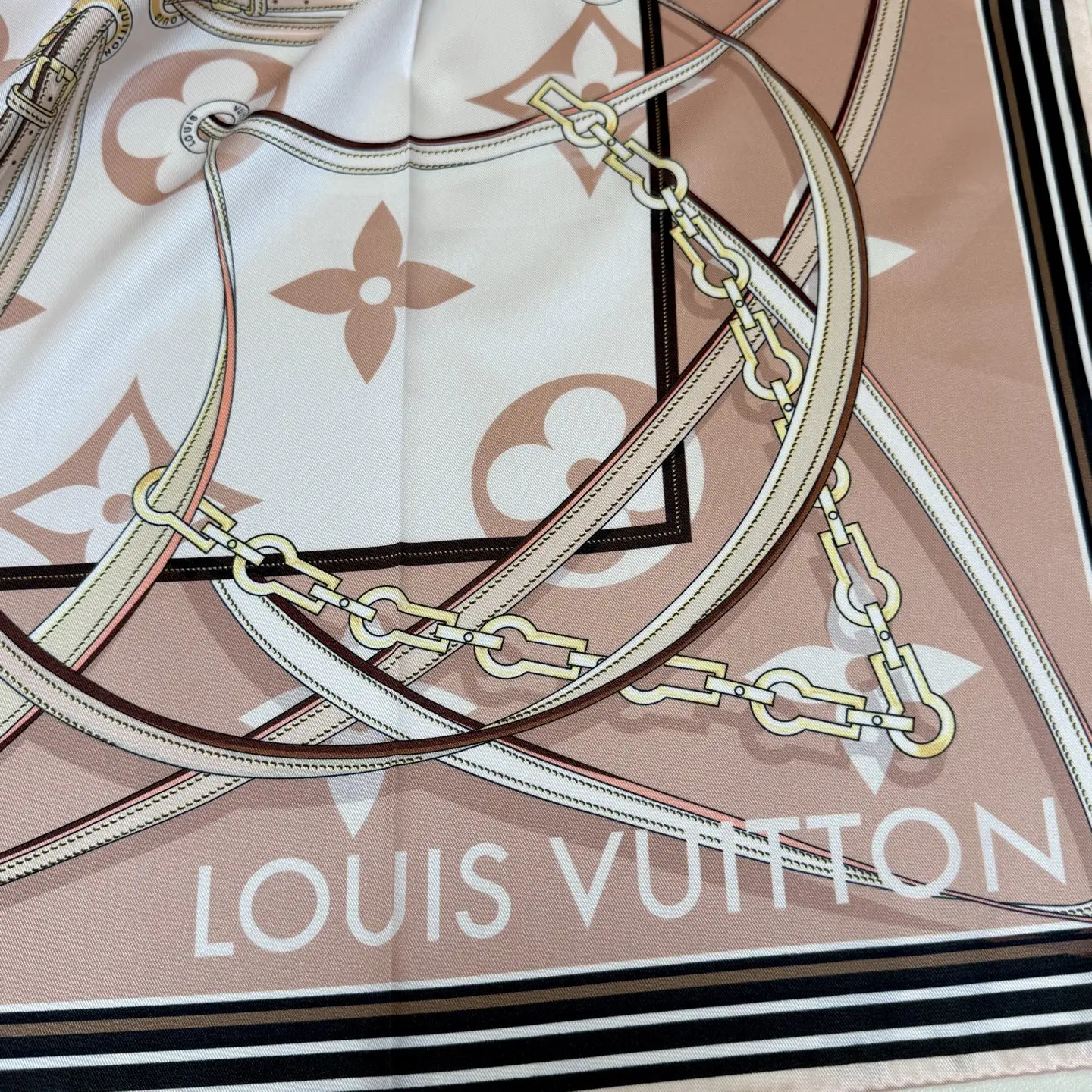 I sincerely recommend the new L Strap Pattern 90 Ultimate Monogram square scarf from LV, which reinterprets classic elements of Louis Vuitton with a modern style: the Giant Monogram pattern takes center stage, while the strap, padlock, and chain patterns form a Monogram floral tribute to the brand s leather goods collection. The contrasting border adds an eye-catching touch. Highly recommended, act fast 100% top-grade twill silk The price is truly great, and this size is just right for easy pairing, with exceptional quality You will understand the high-end quality and details as soon as you receive it; this is a heavyweight masterpiece A must-have recommendation for VIP clients 90*90cm