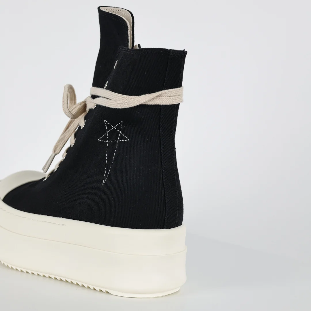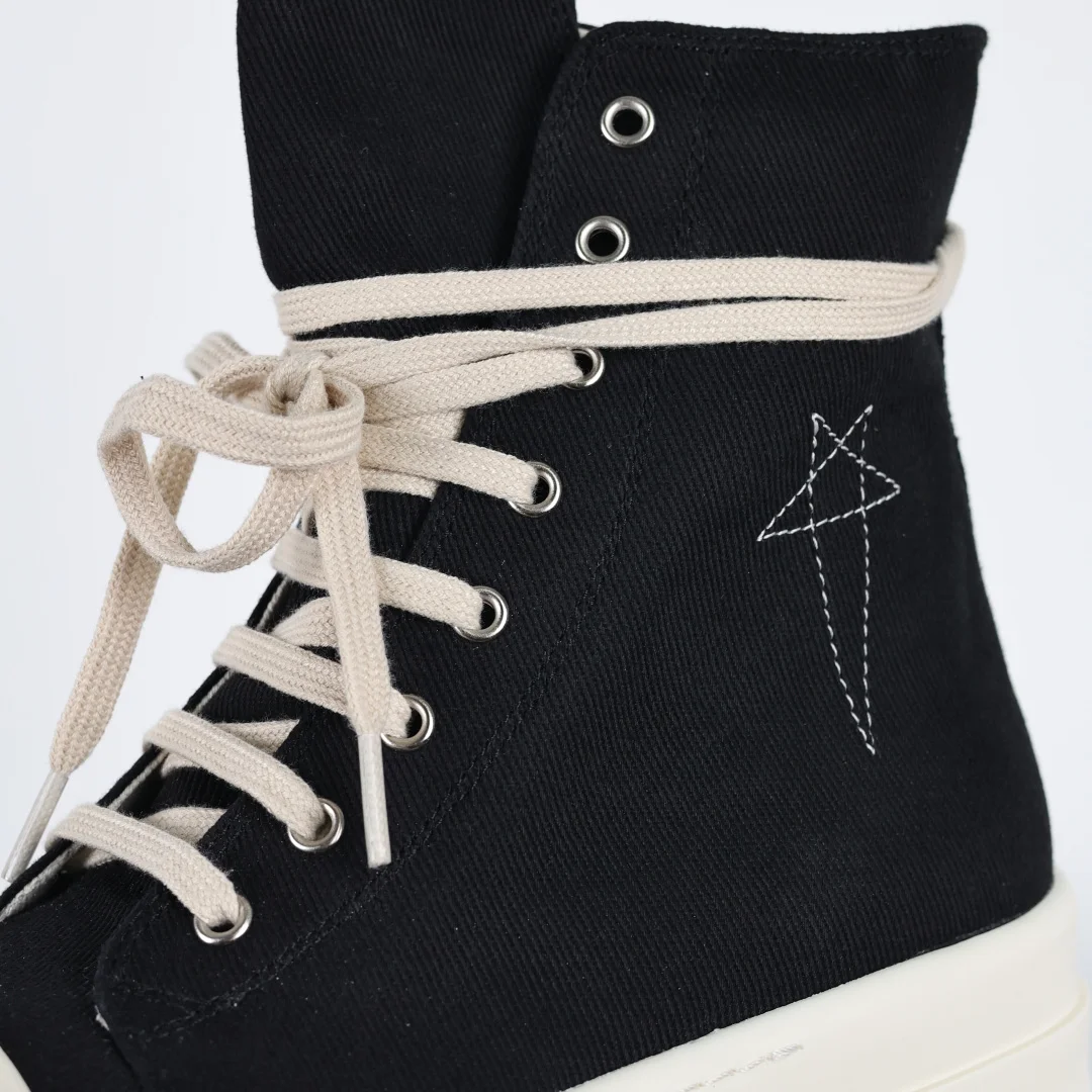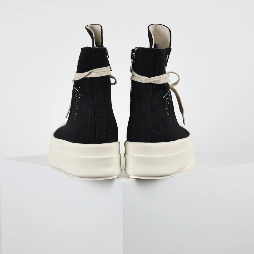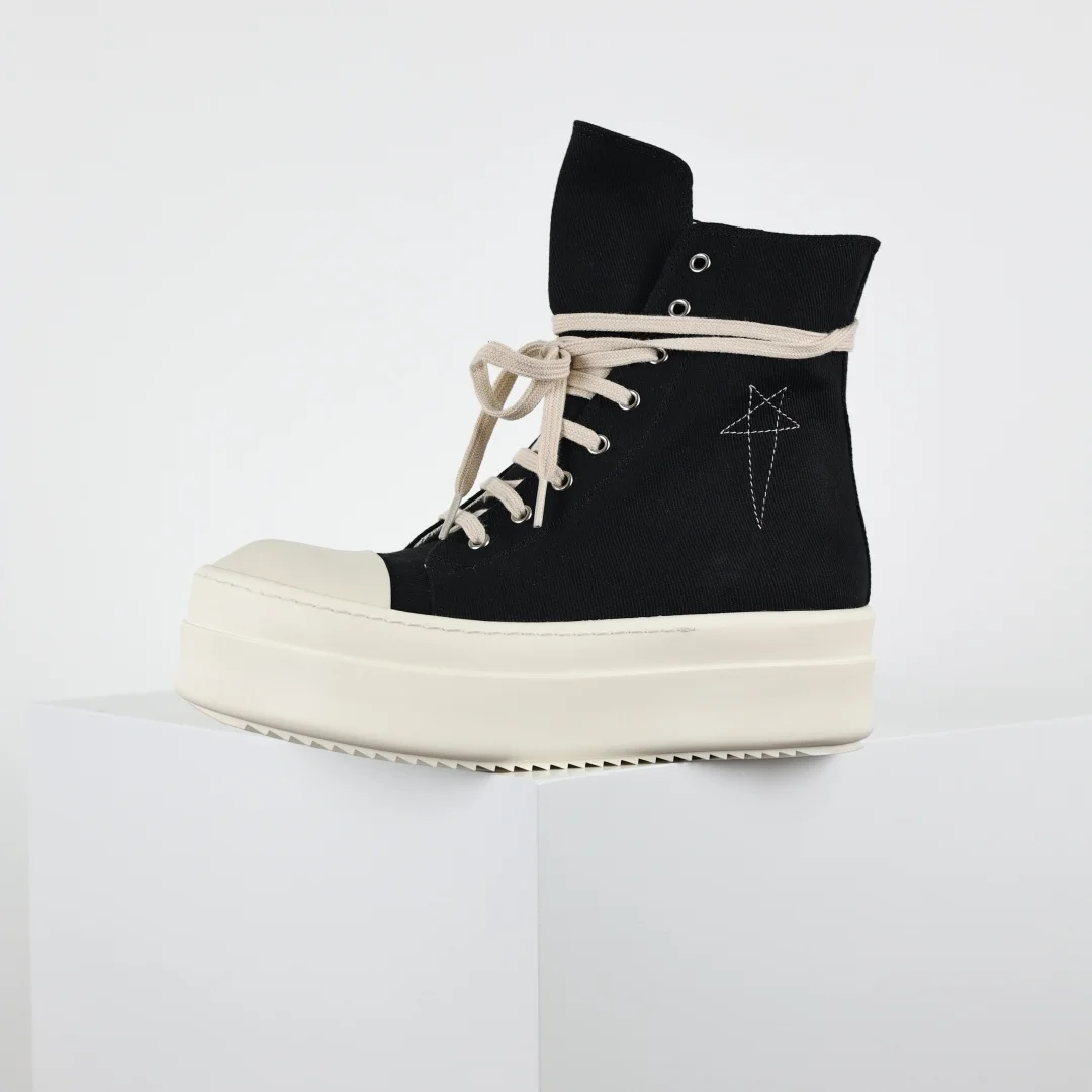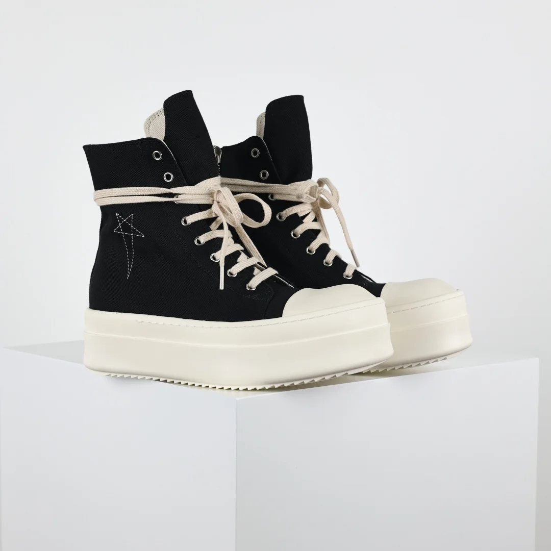 Rick Owens High-Street Casual Sneakers with Exclusive Private Mold Thick Sole, Custom Fabric. Stitching distance meticulously replicated. 1:1 specification gift box set, weighing over 3 lbs, plus custom Owens protective box. Complete packaging and accessories. High-end retail exclusive quality, differentiated from market goods. Purely handmade, each pair is unique with a handmade texture.