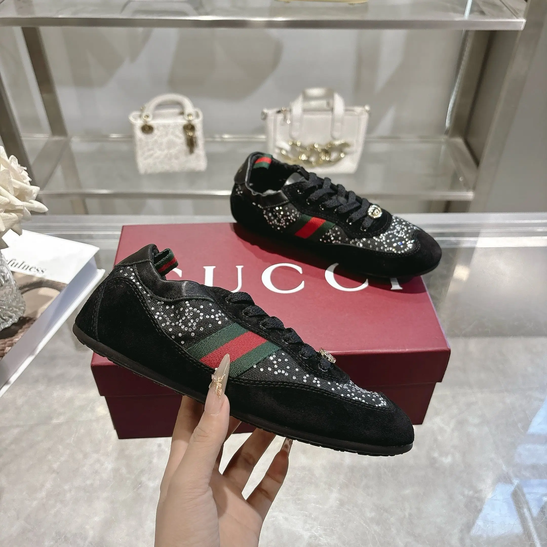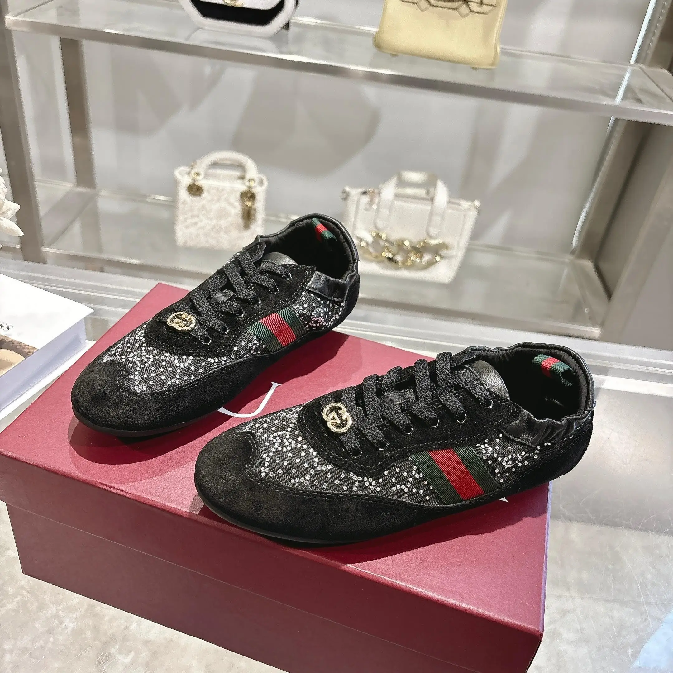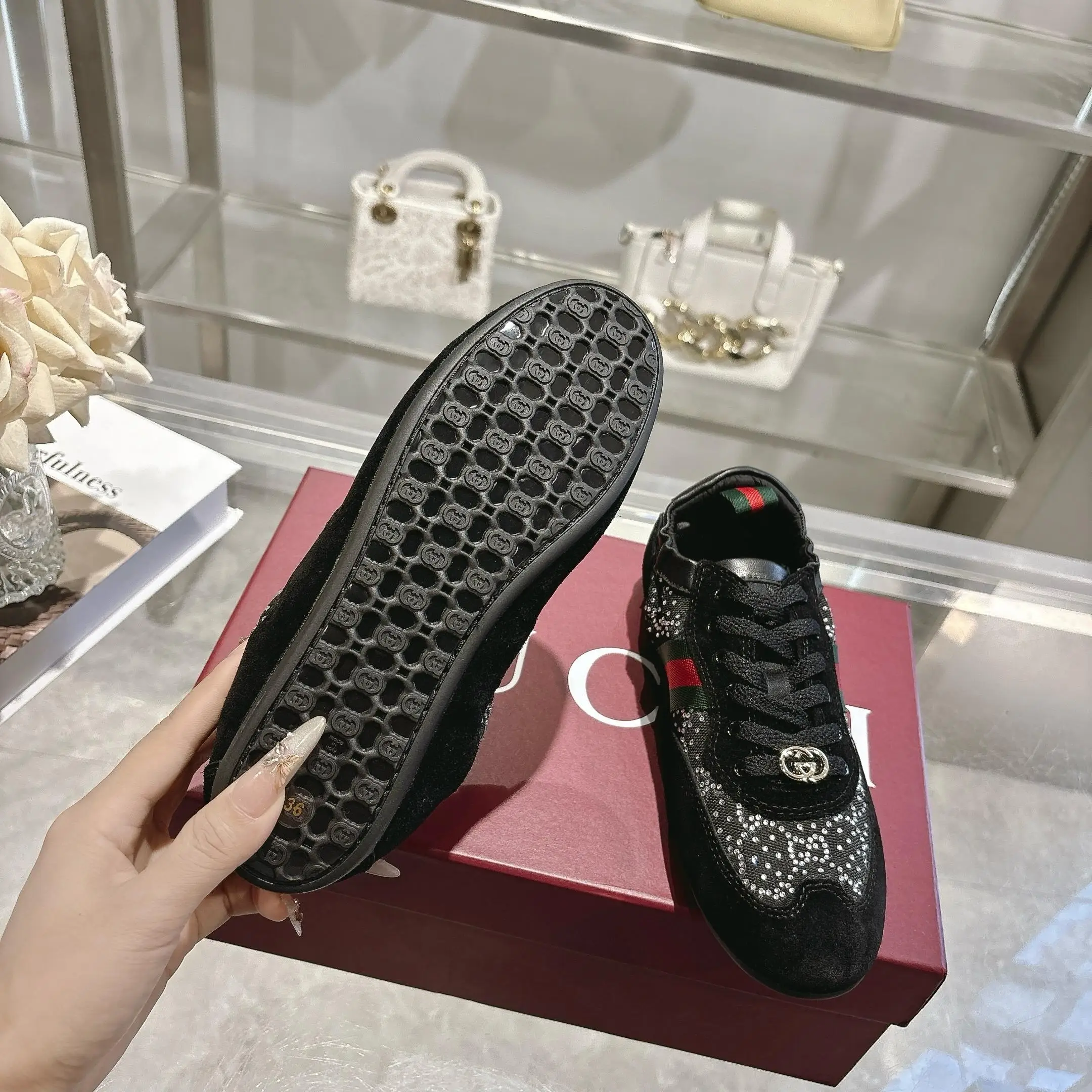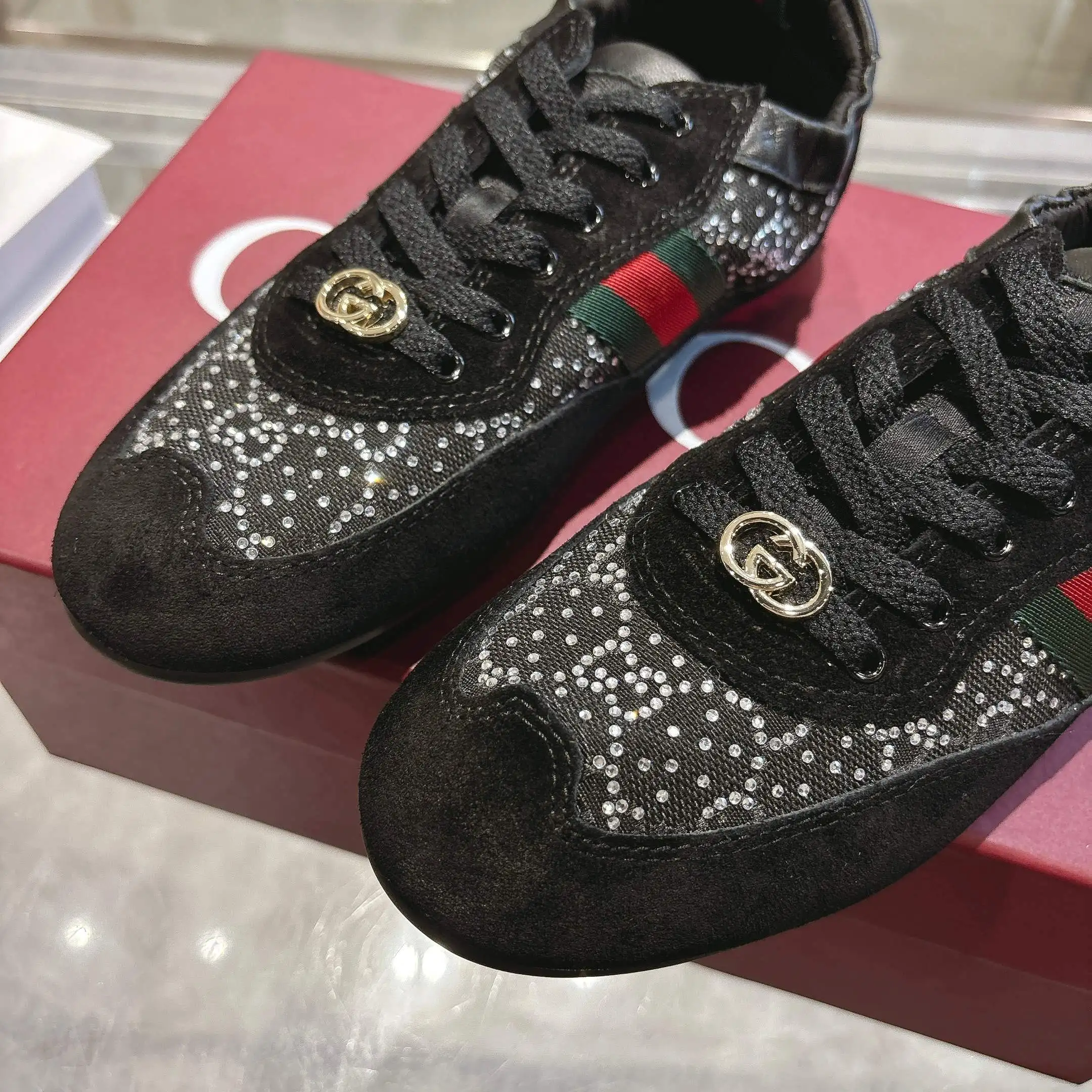 GG crystal diamond shoes are an incredibly lightweight and soft pair of dance shoes that can be rolled up. Made of black suede leather and GG fabric, they are meticulously adorned with GG crystal diamonds. They combine a lightweight feel with a dazzling appearance. The shoe opening features a lambskin-lined elastic craftsmanship. Flexible and comfortable, allowing for unrestricted movement! Lambskin and latex insole! TPU outsole! Available in sizes 35-40. Black color.
