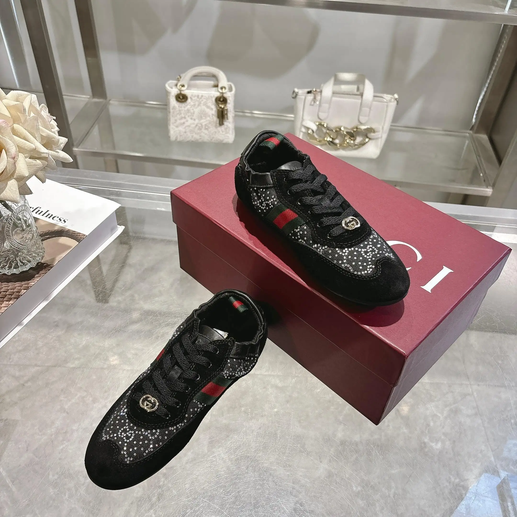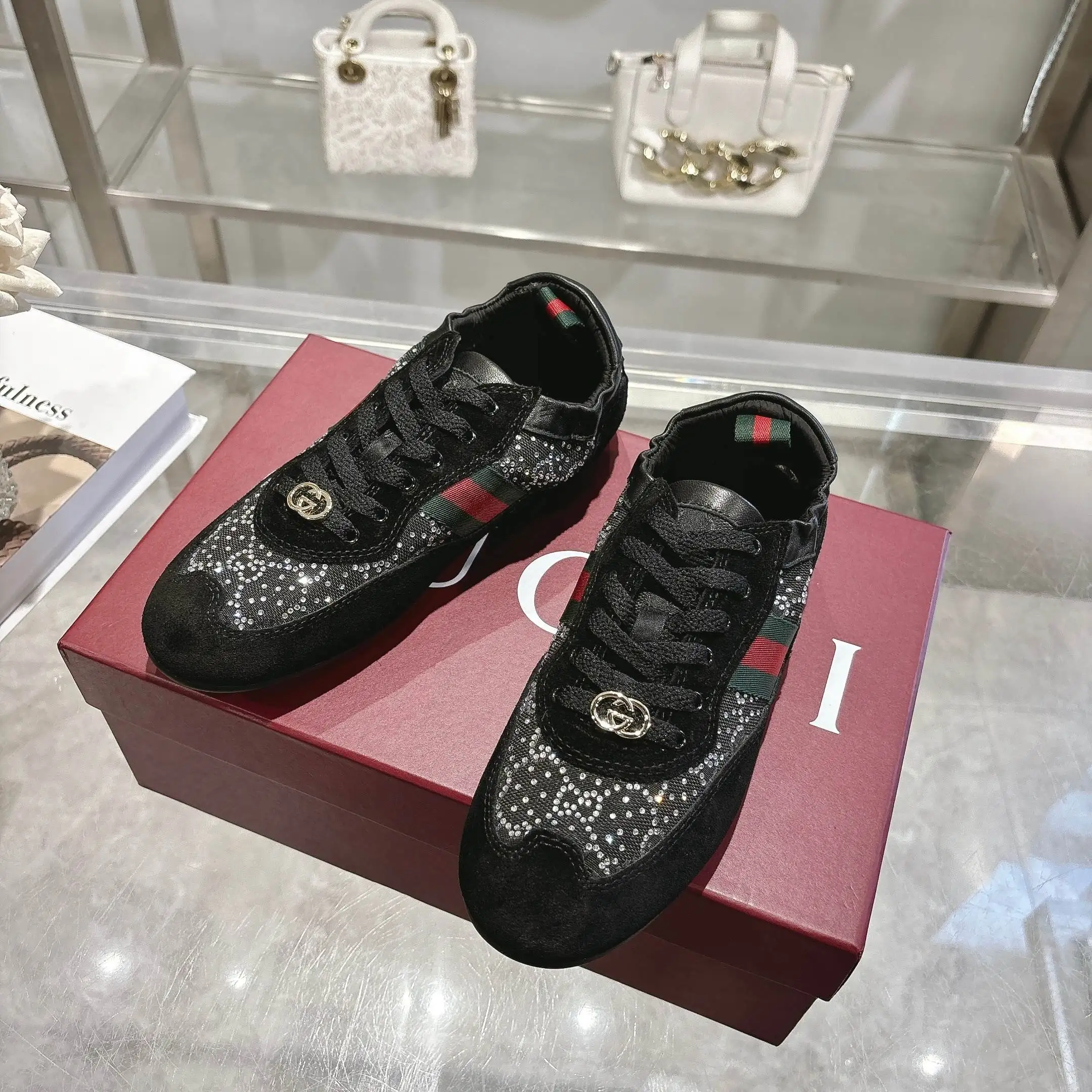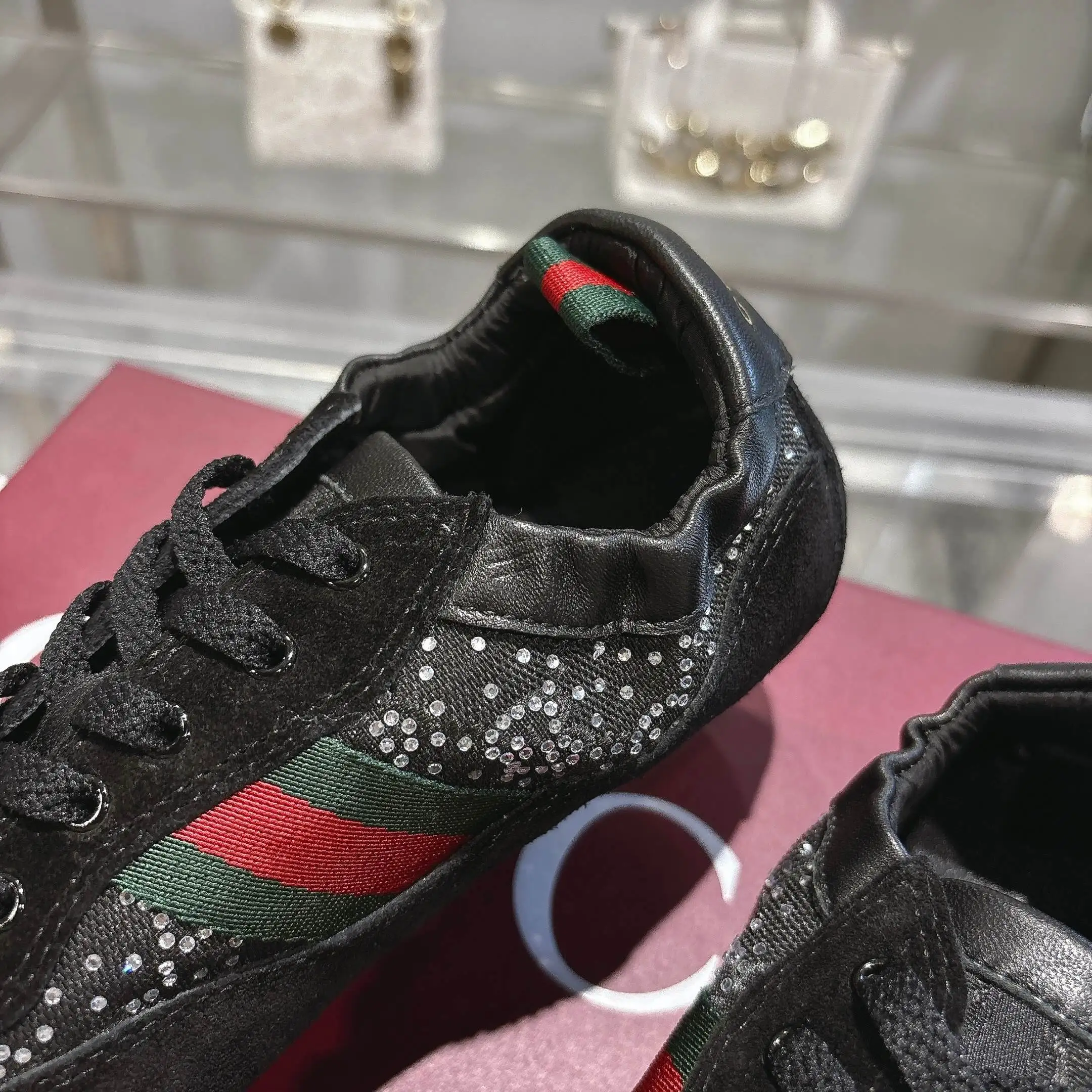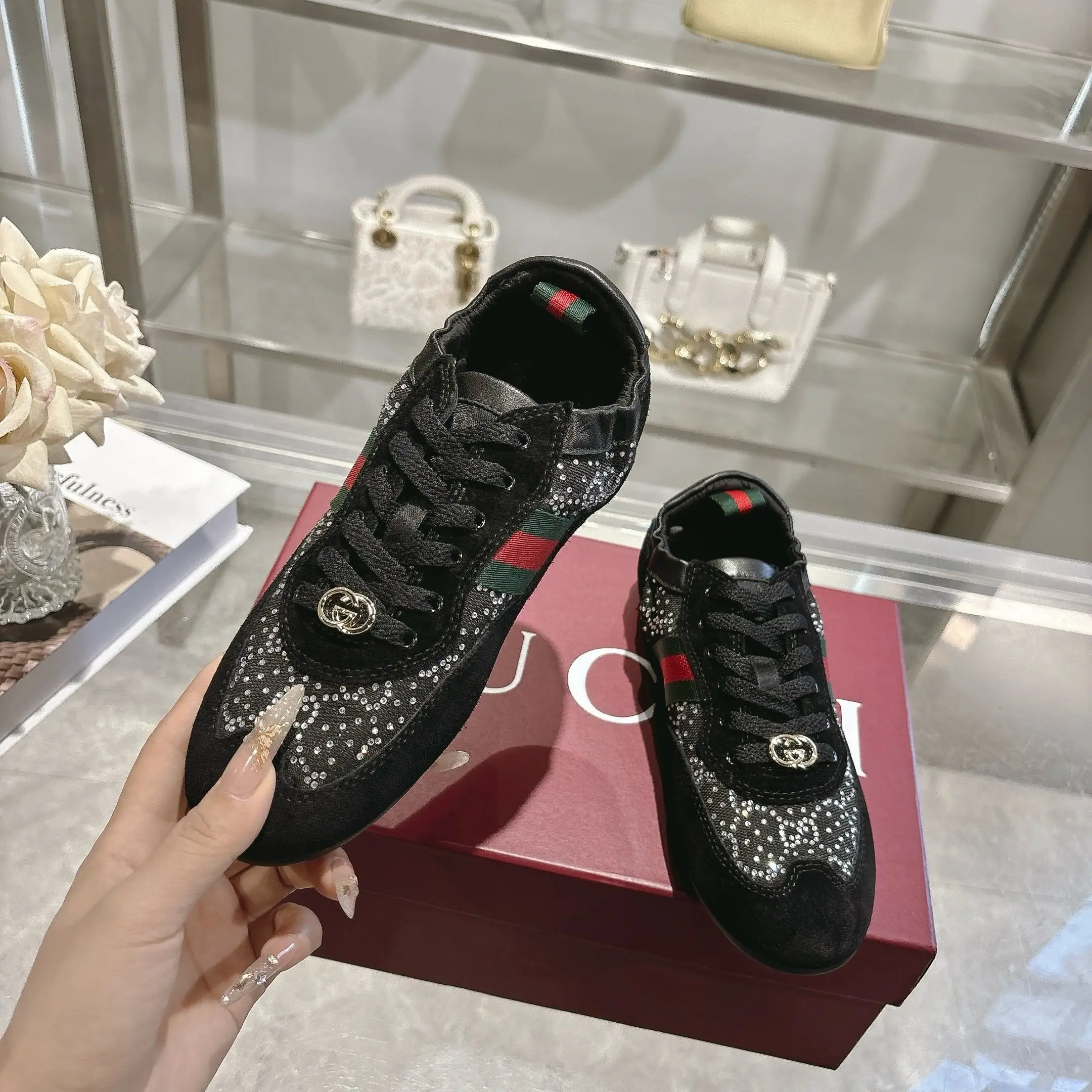 GG crystal diamond shoes are an incredibly lightweight and soft pair of dance shoes that can be rolled up. Made of black suede leather and GG fabric, they are meticulously adorned with GG crystal diamonds. They combine a lightweight feel with a dazzling appearance. The shoe opening features a lambskin-lined elastic craftsmanship. Flexible and comfortable, allowing for unrestricted movement! Lambskin and latex insole! TPU outsole! Available in sizes 35-40. Black color.