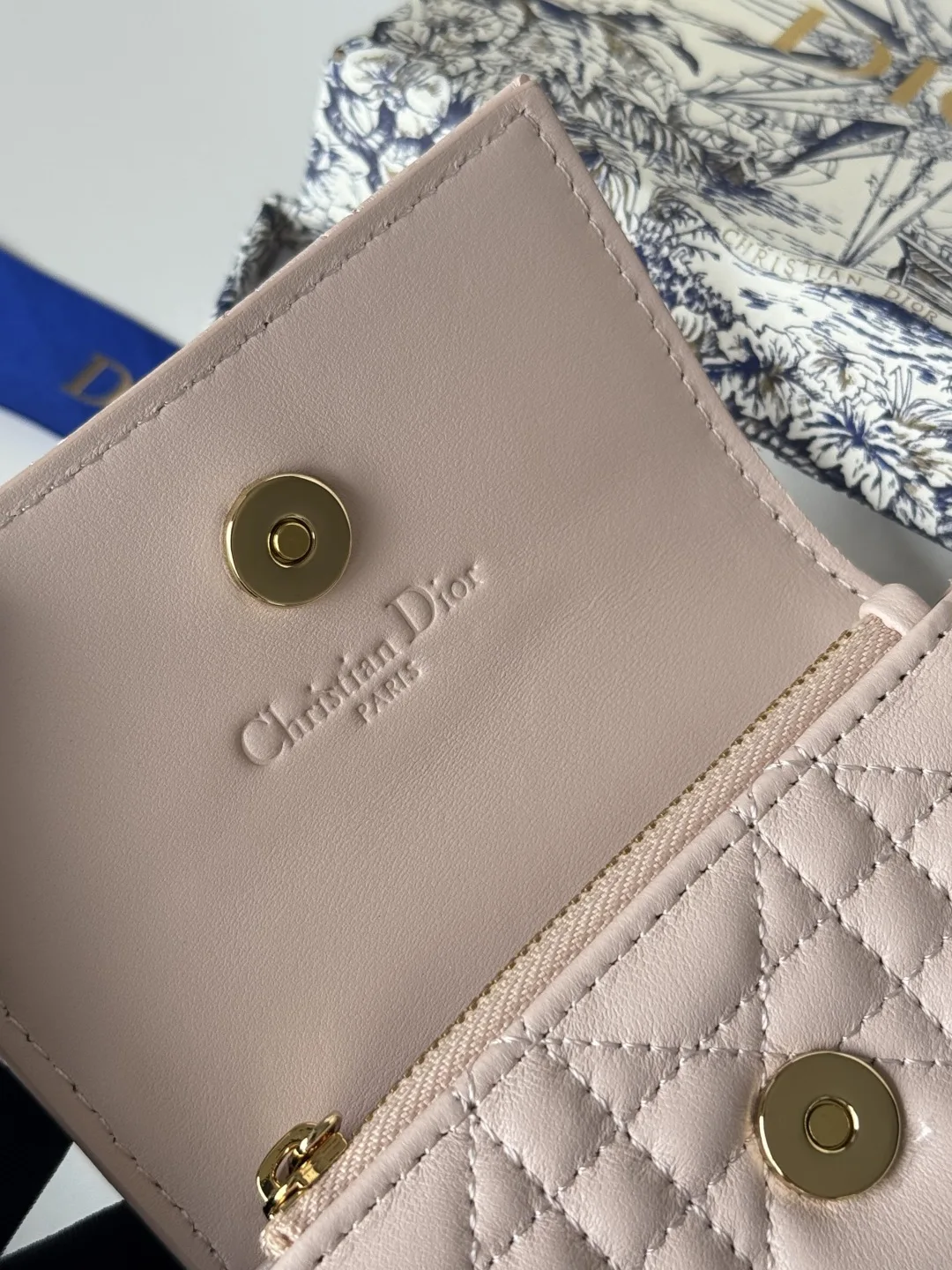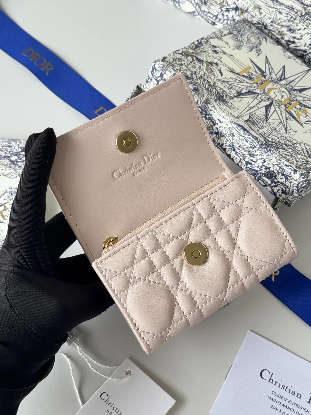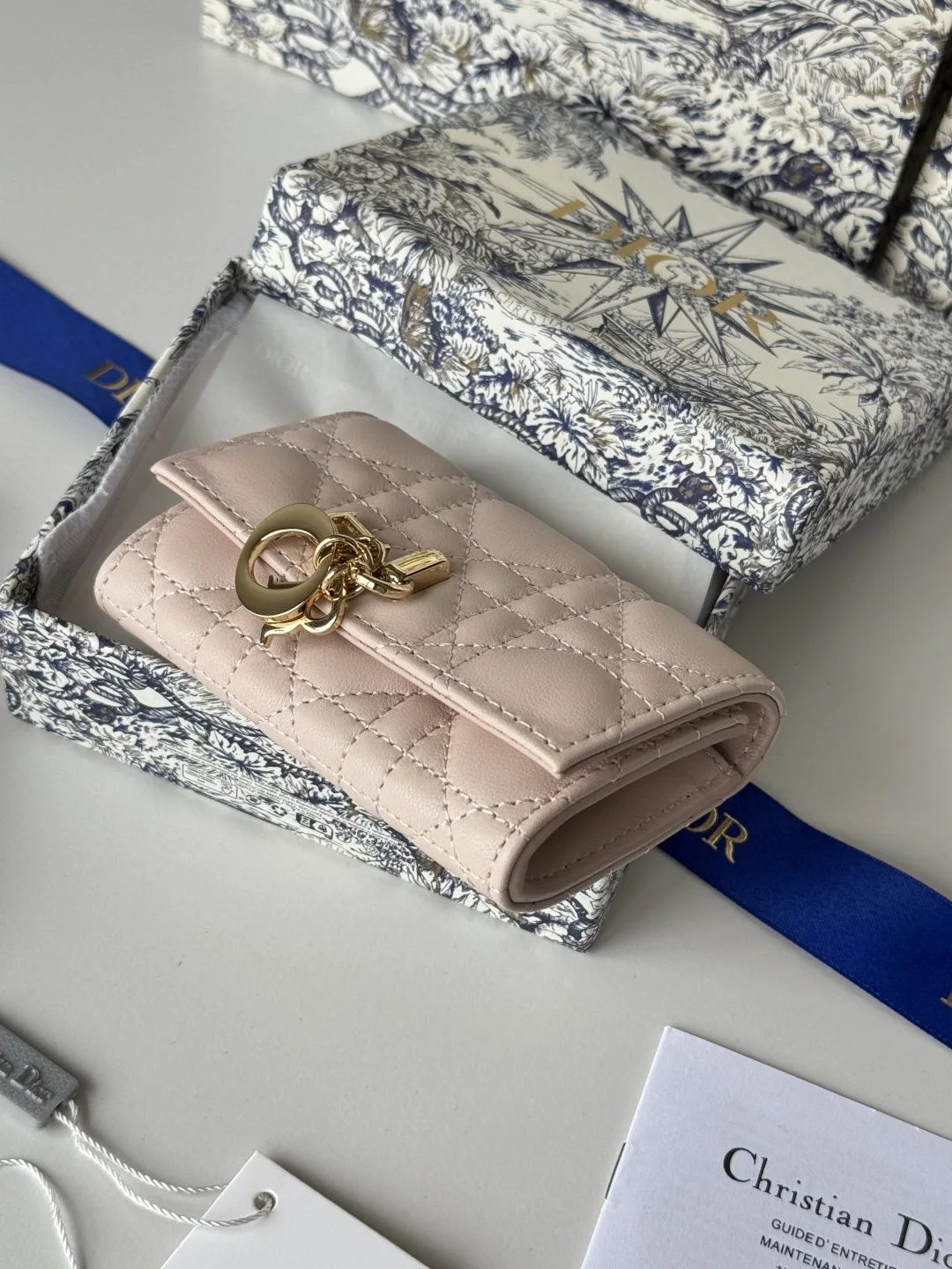 Item Number: S0966ONMJ_M413 Size: 11x7.5x2.5cm This My Dior Glycine bag is compact and practical, with a unique design. It is meticulously crafted from blush pink lambskin leather, adorned with a woven pattern, and features a D.I.O.R. charm on the front to enhance its elegance. Sophisticated and refined, it can hold various daily essentials, suitable for various occasions, and can be paired with other My Dior items. The front includes a D.I.O.R. charm, two card slots, one zippered compartment, and one spacious interior compartment. Made in Italy.