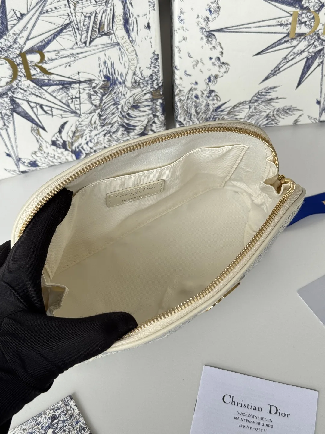 This pouch features Dior s iconic blue Oblique motif. It has two chic zipped compartments and a patch pocket to hold various items. The large size can be paired with other Oblique ..
