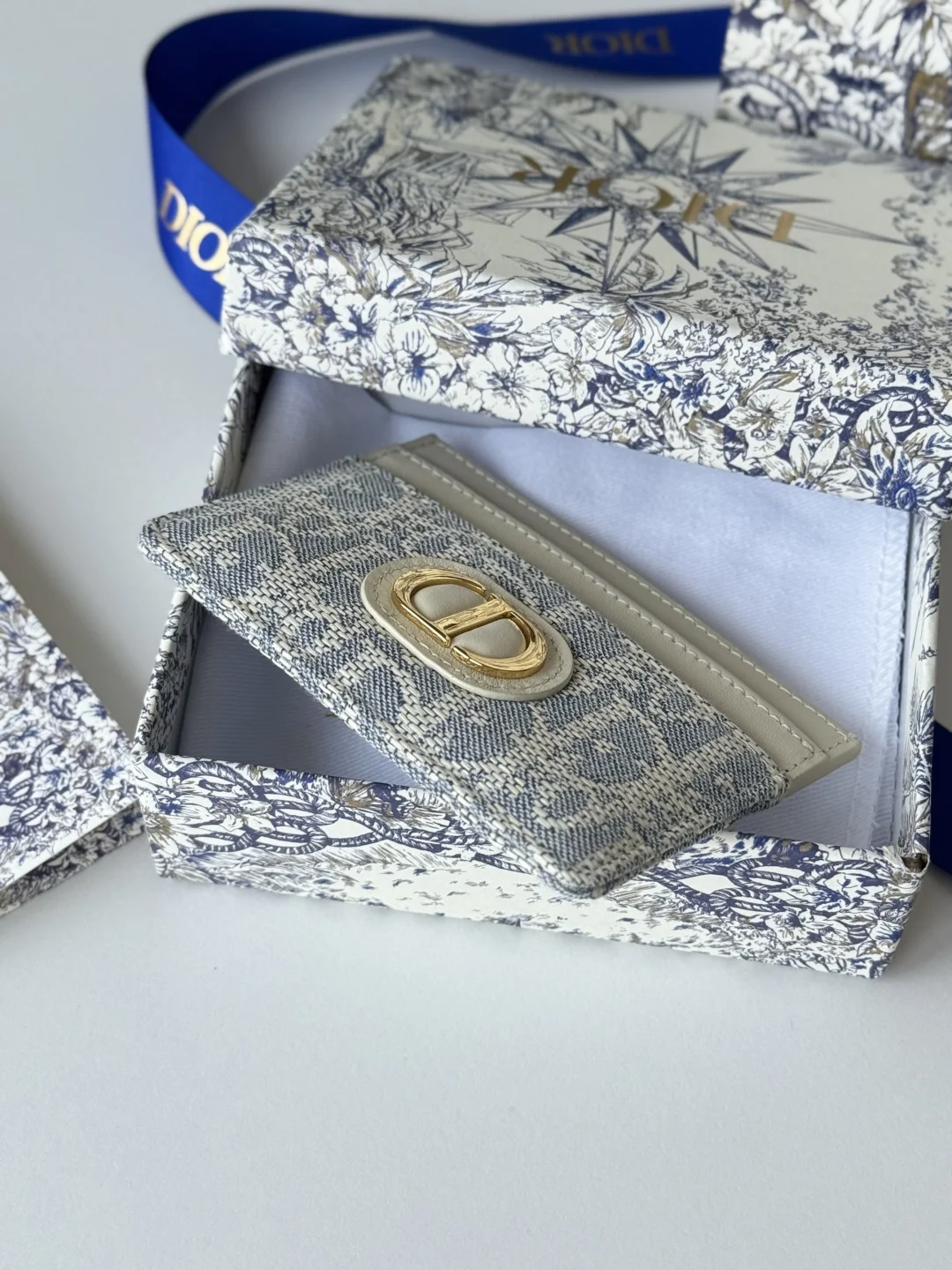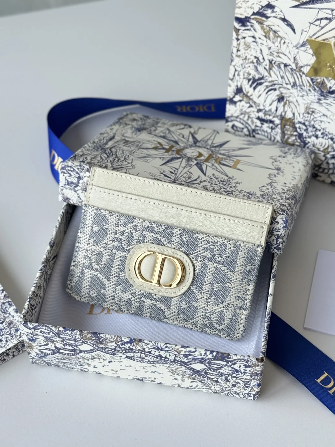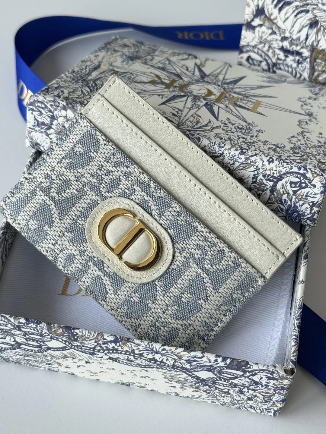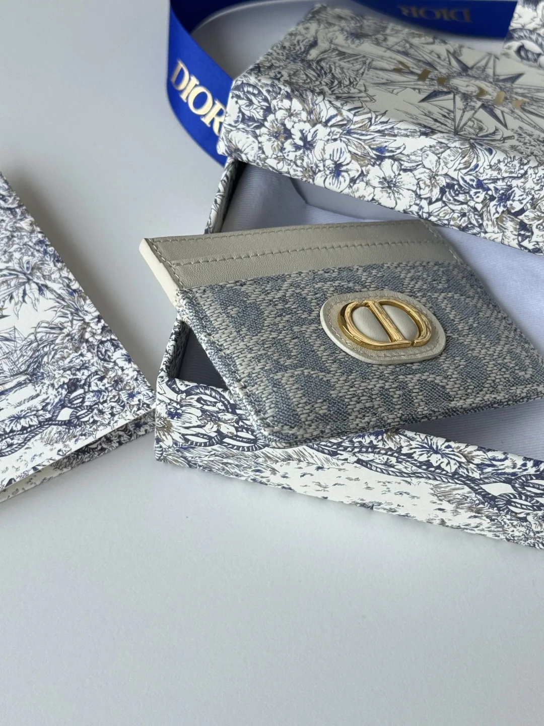 The 30 Montaigne card holder is a refined and elegant piece. Crafted in blue jacquard, it is adorned with the Oblique print and embellished with the CD signature on the front. Prac..
