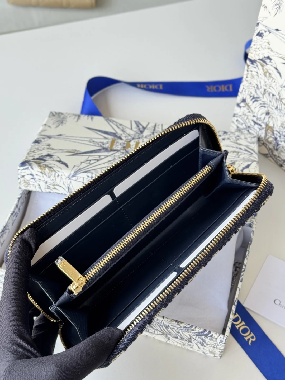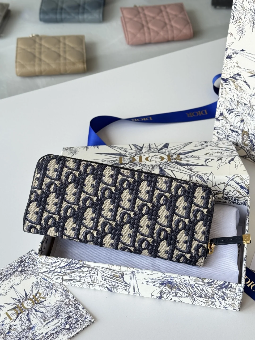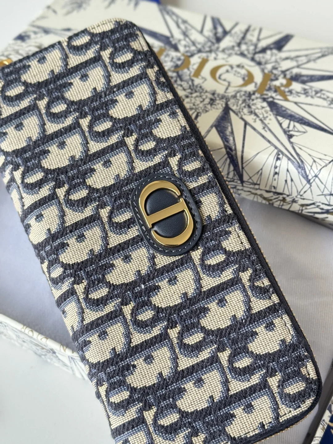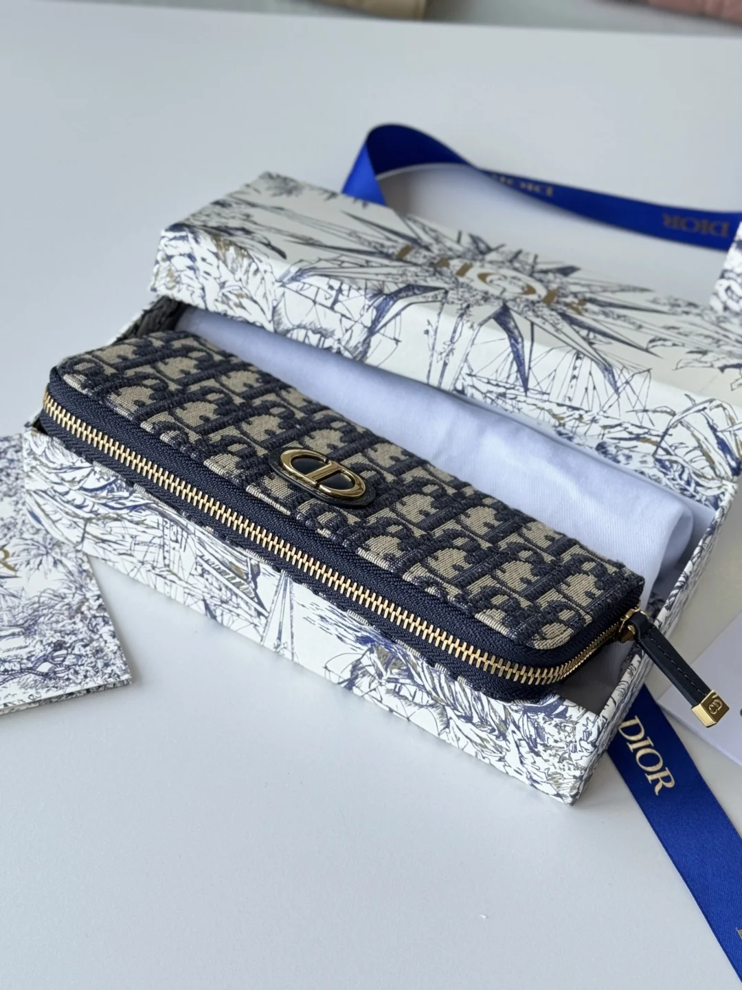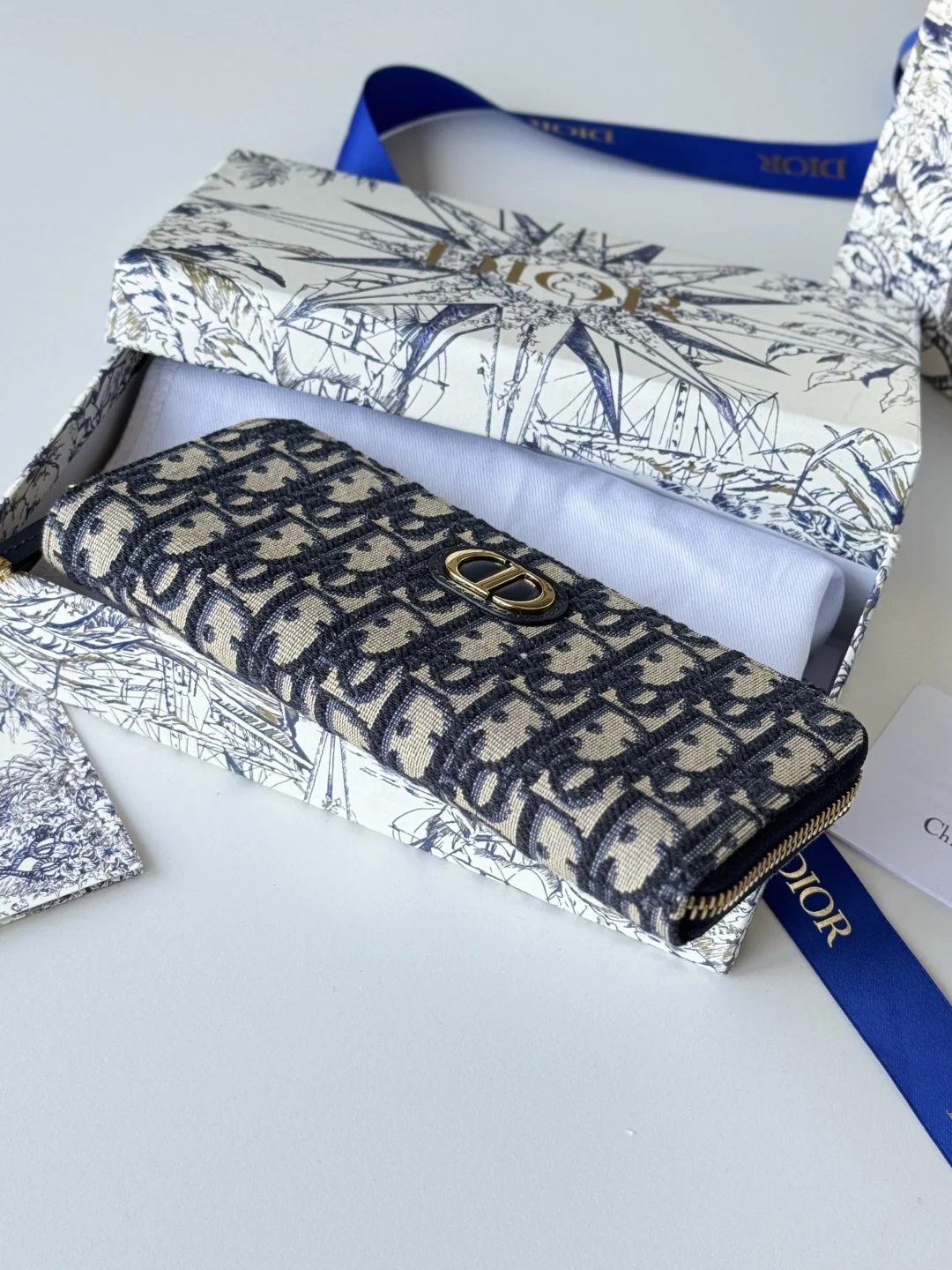 Dior Long Wallet with Zip, Dior Oblique Jacquard and Deep Blue Grained Calfskin, Large Capacity with Double Compartment, 8 Card Slots plus Easy Storage for Cash and Credit Cards, S..