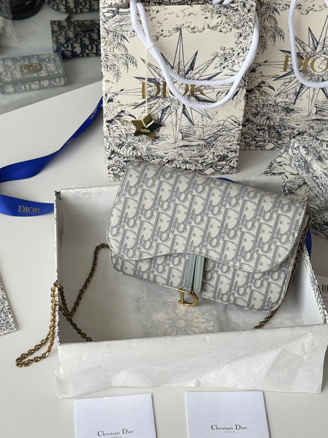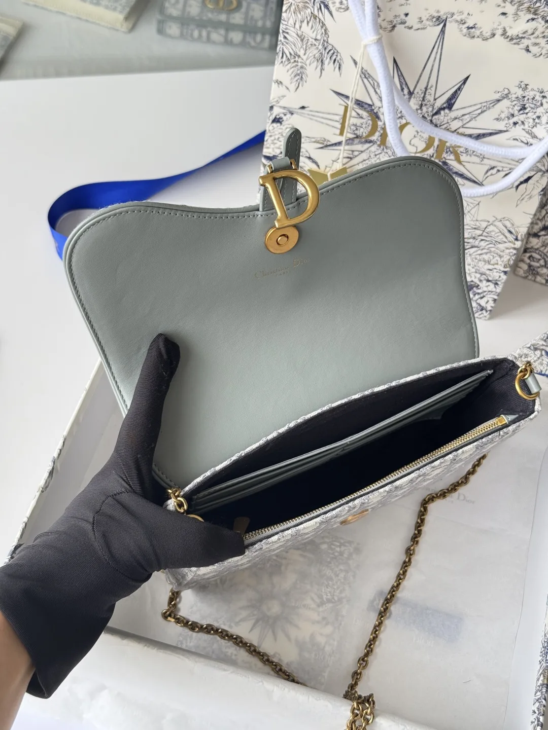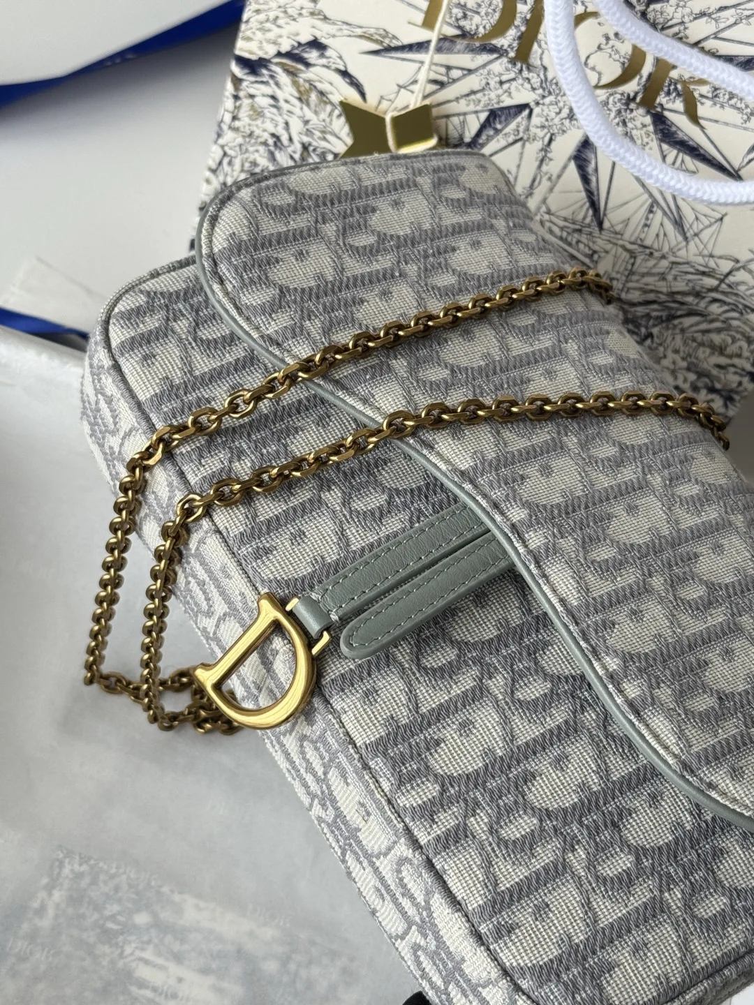 The Saddle chain bag boasts a streamlined and harmonious design, making it a stylish and practical accessory. Crafted in blue Denim Dior Oblique jacquard, it offers a modern twist on the iconic Dior motif with an irregular stonewashed effect, showcasing a fashionable appeal. It features an asymmetric flap and an antique gold-finish metal D stirrup charm. The spacious interior compartment can accommodate all the daily essentials. The chain allows it to be carried on the shoulder or crossbody. It can be easily coordinated with other Saddle creations.Flap closureReference: S5907CTZQ_M928 D stirrup on the front1 compartment6 card slots1 patch pocket-Reference: S5097Dimensions: 21.5 x 12.5 x 3.7 cm (Length x Height x Width)The size is suitable for a phone, card holder and lipstickChain length: 118 cmChain drop: 57 cmWeight: approximately 280 g