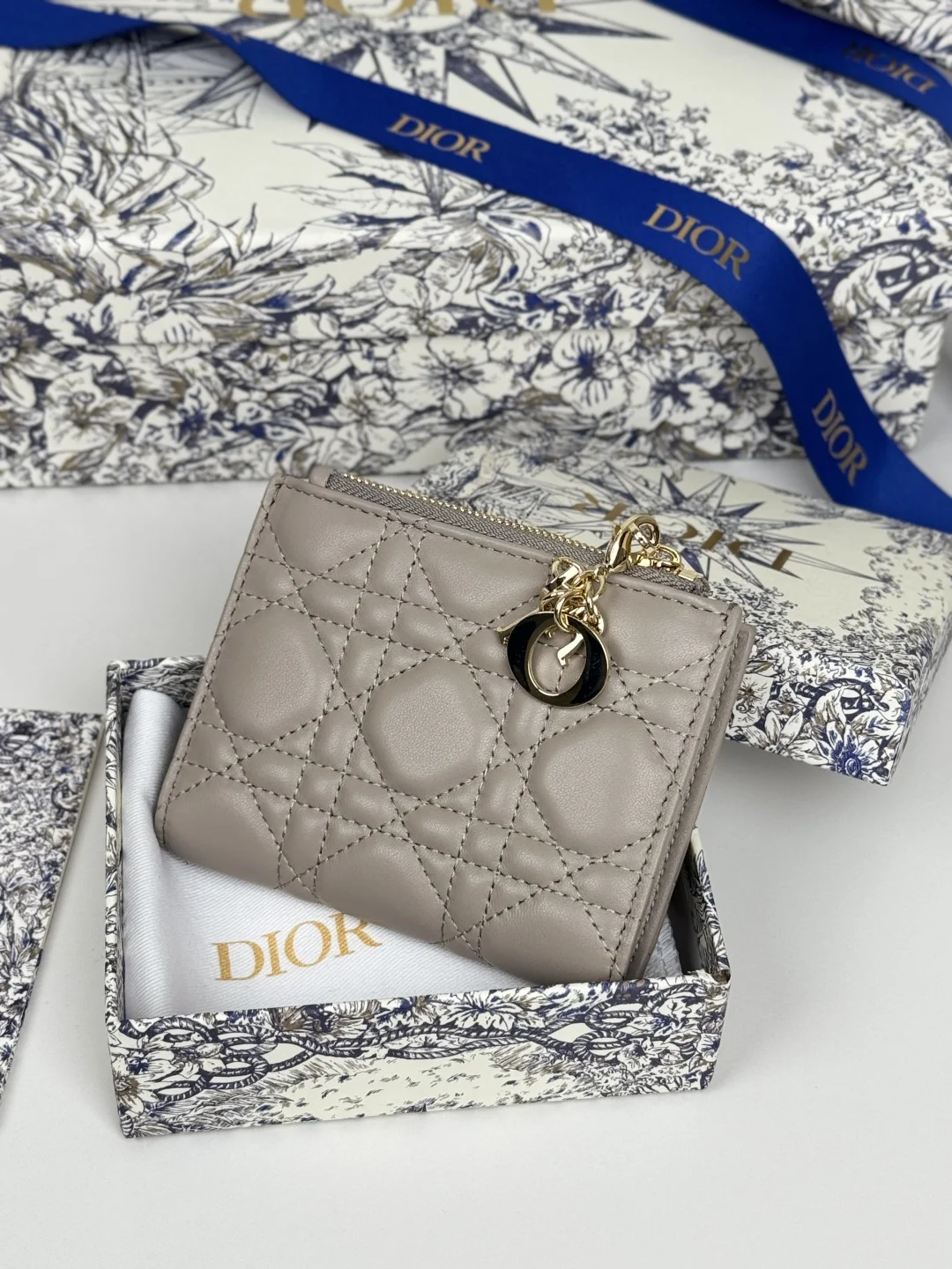 The Dior Caro Dahlia wallet, crafted in lambskin and adorned with Cannage stitching, showcases a modern design. It is embellished with a CD signature on the front. This stylish and..