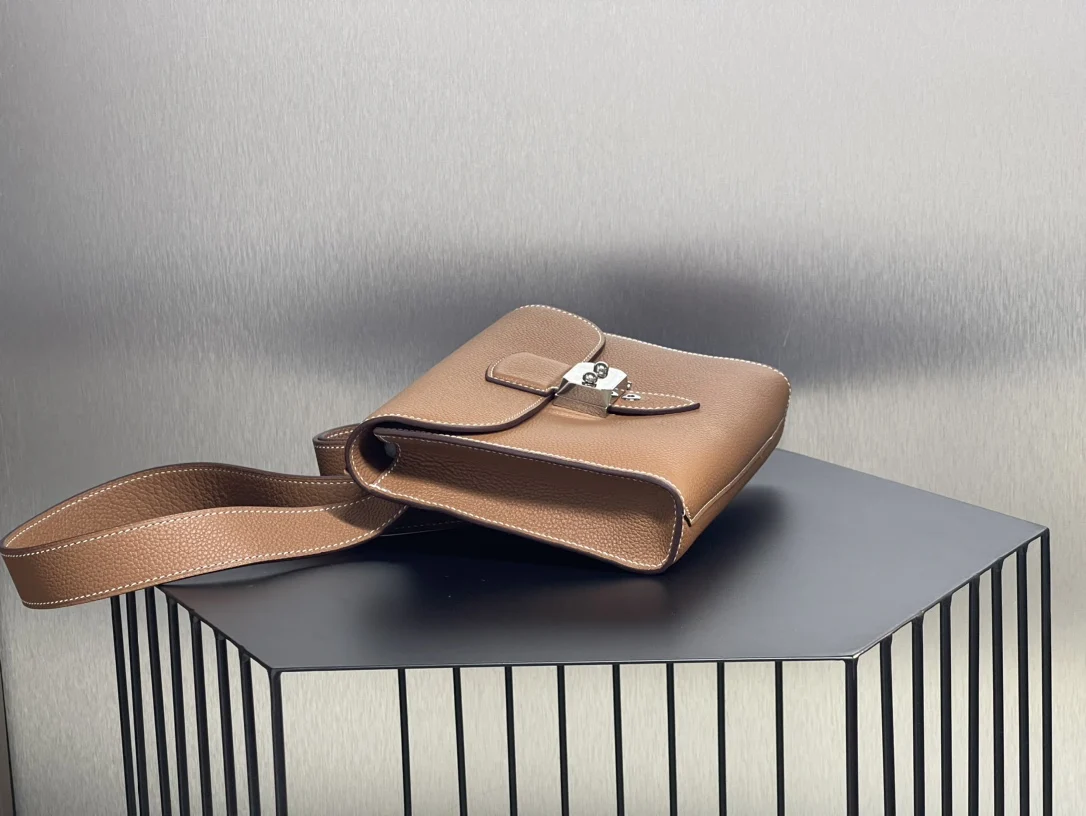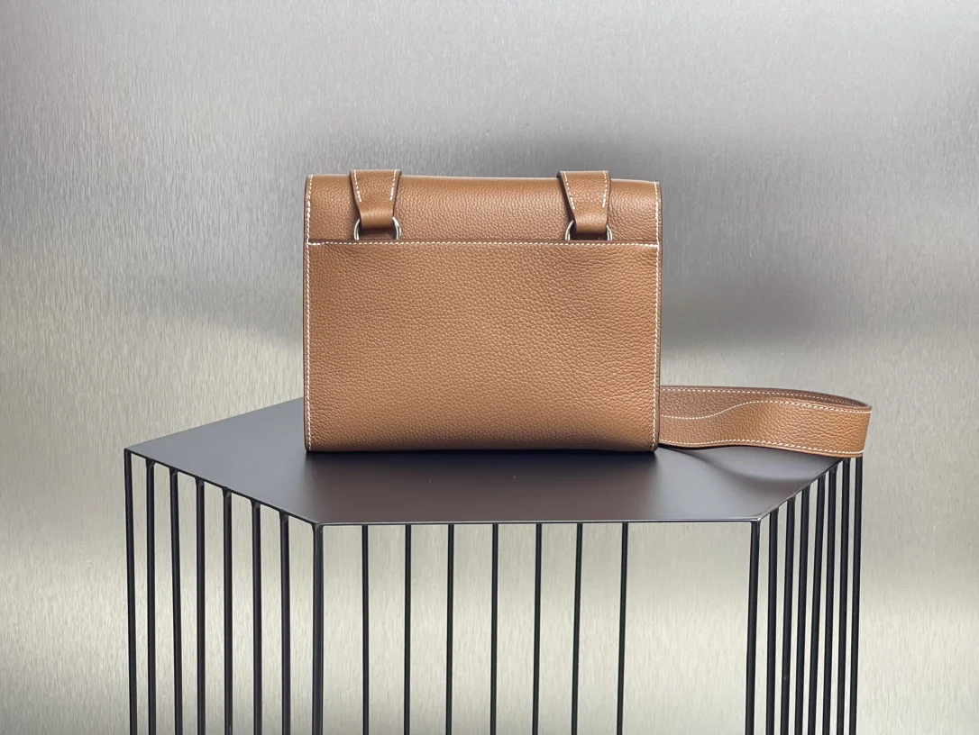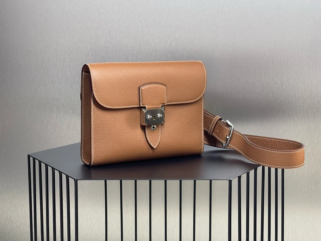 Semi-handmade Sac a Depeches Messenger Bag 21cm for Men, Grade A Togo Leather [Gold Brown] with Silver Hardware, Unisex, Boutique Synchronization, Wax Thread Stitching, Pure Steel Hardware
