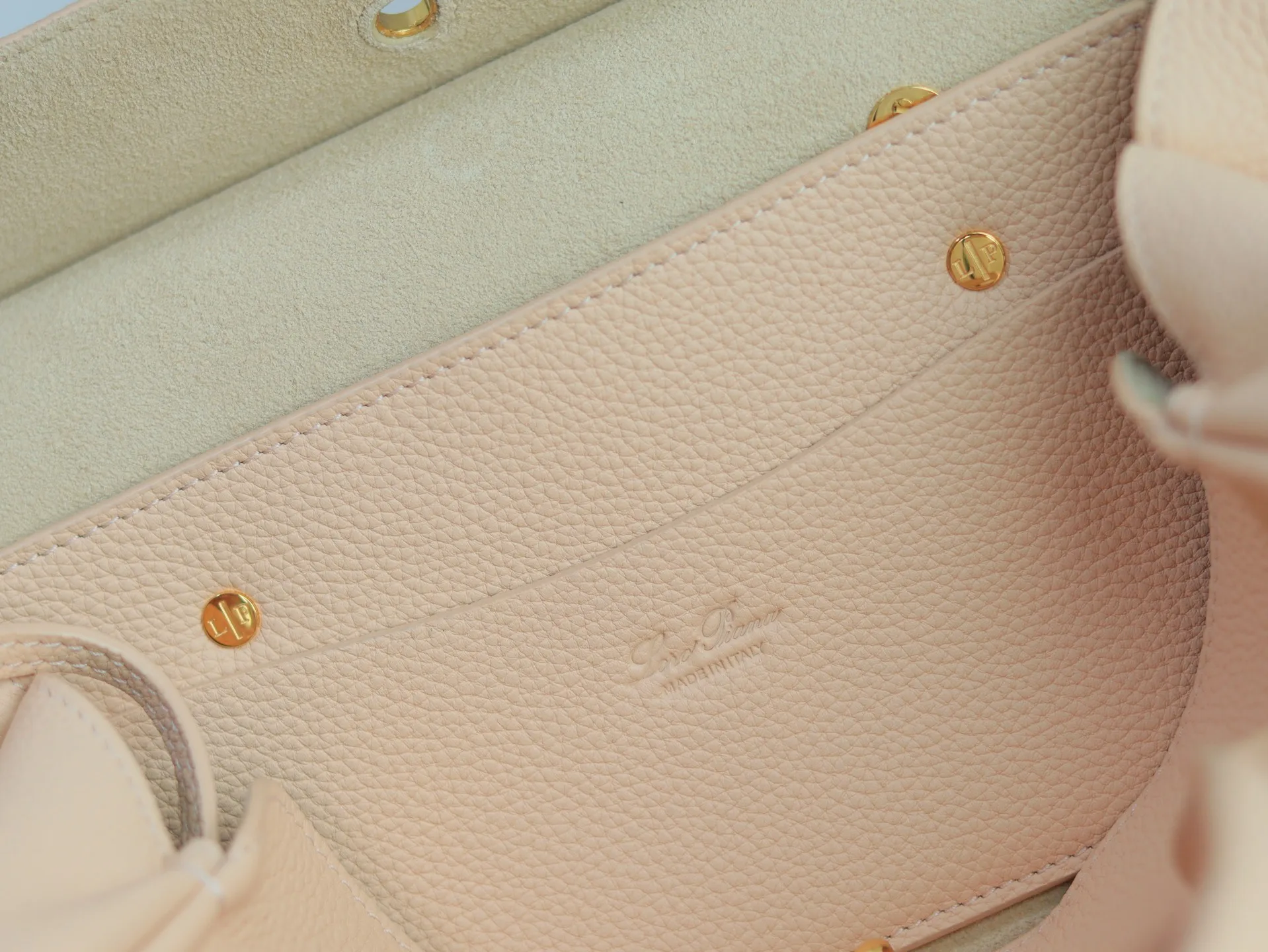 The Loom handbag pays tribute to Loro Piana s long-standing textile tradition, with a metal strip beneath the flap that evokes the image of fabric gently cascading from the artisan s loom, elegantly honoring the brand s renowned textile craftsmanship. The handbag is made from lightweight specialty cowhide leather with a distinctive texture, featuring a delicate padlock at the opening that embodies a casual style.