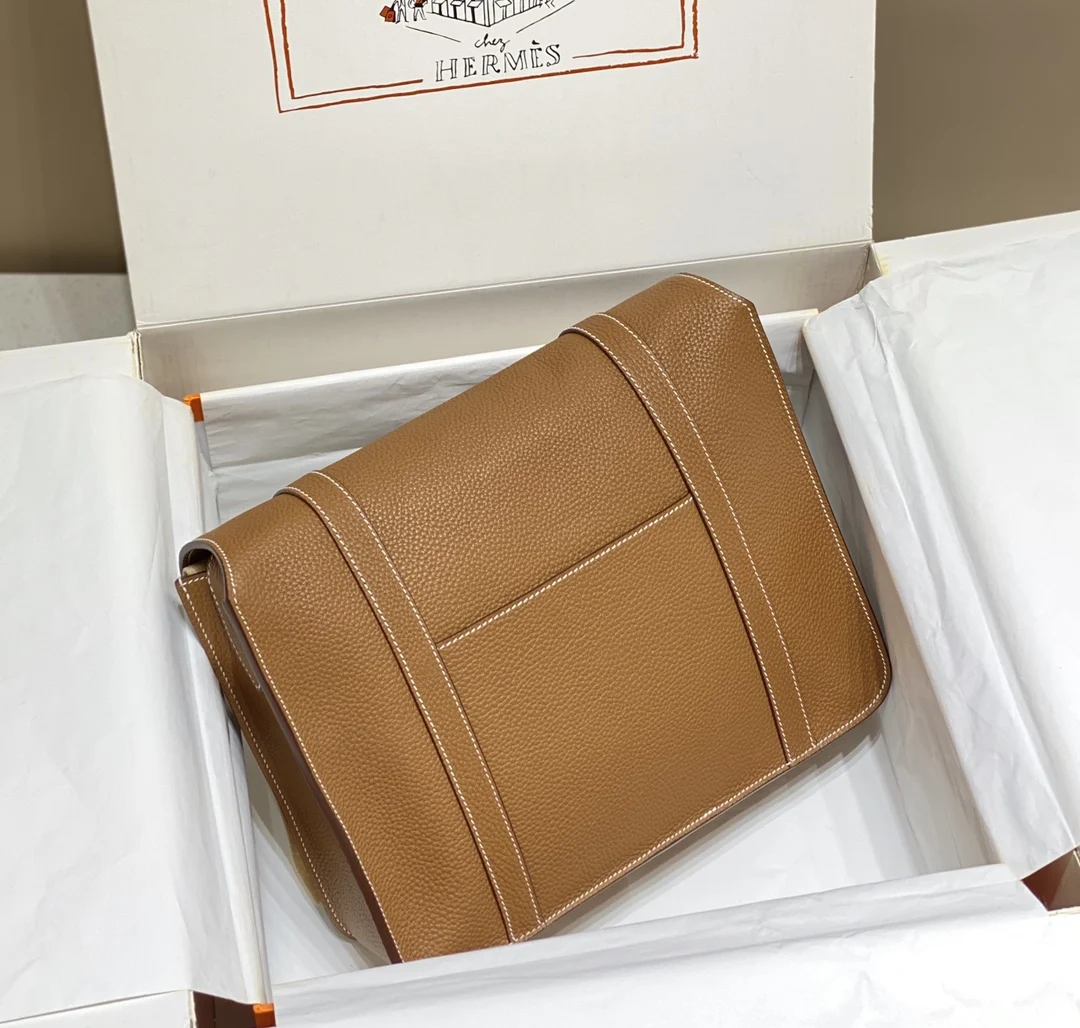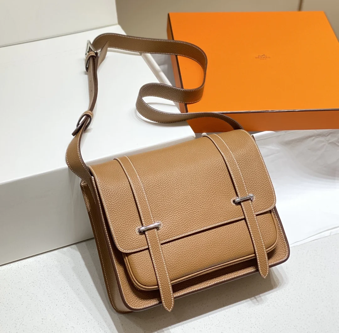 Semi-handmade Steven golden brown Steve Casual classic men s shoulder bag, crossbody bag (drawstring buckle) Grade A Togo calfskin, wax thread stitching, actual shot 30cm